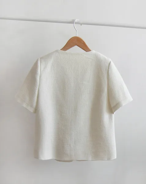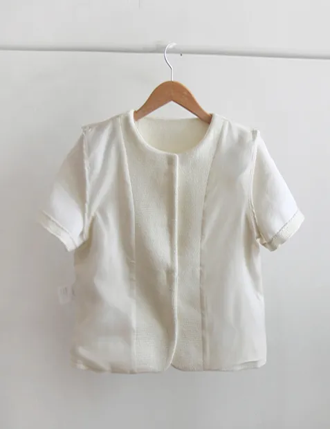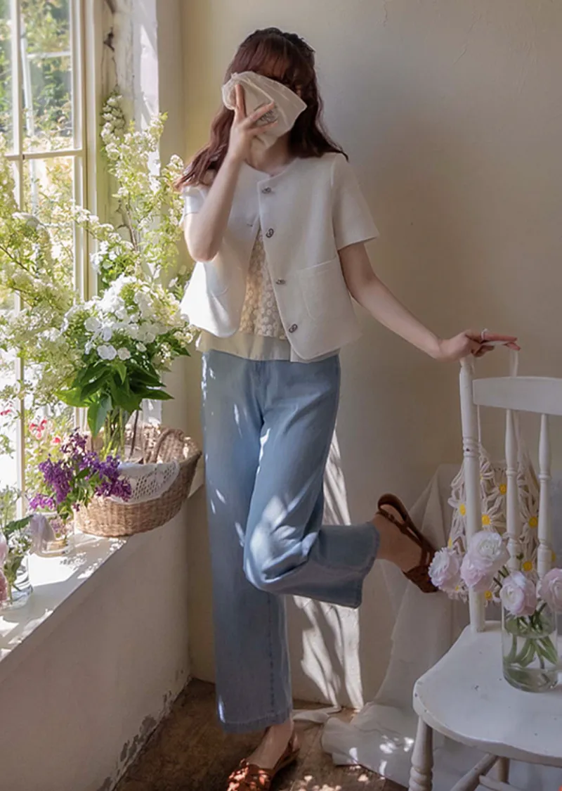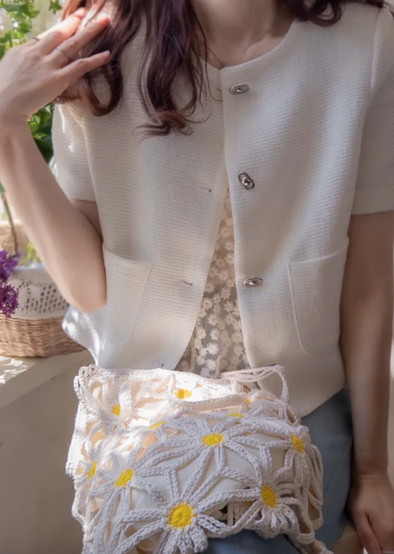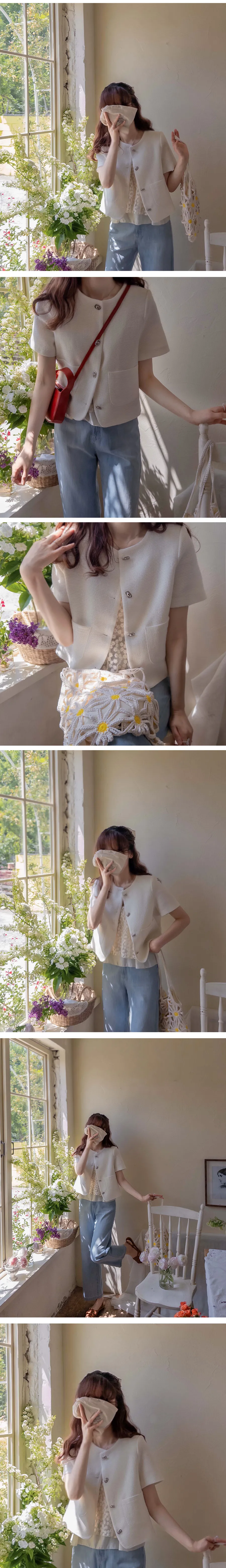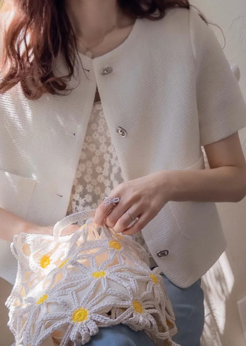 優雅獨特圓型鈕扣口袋短袖亞麻外套