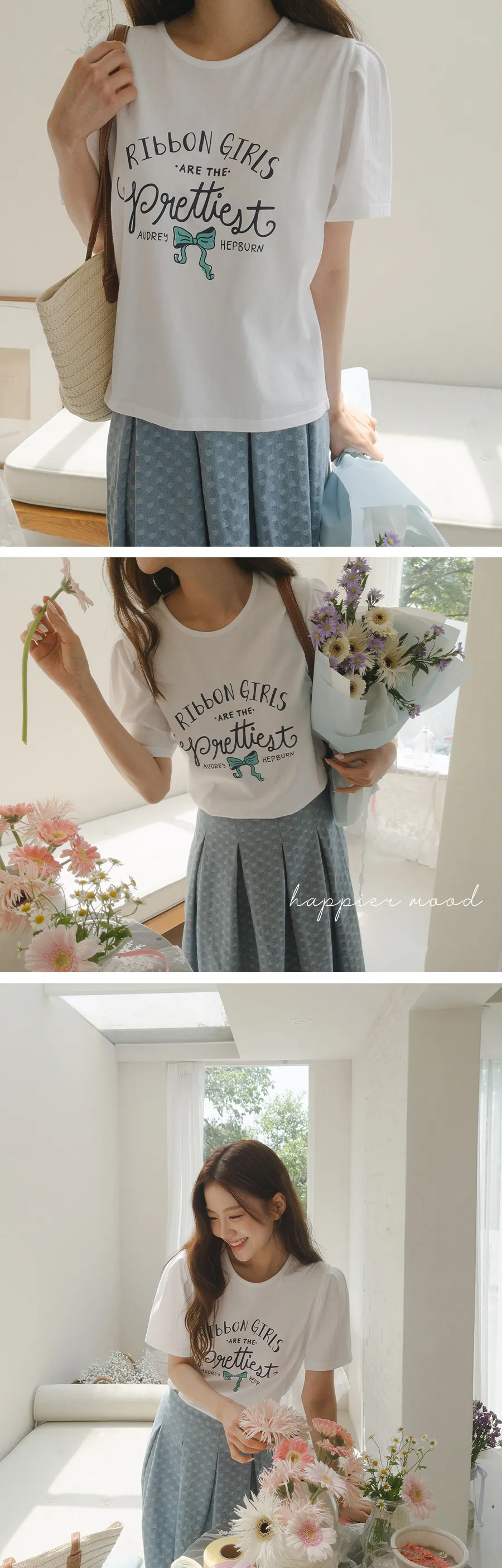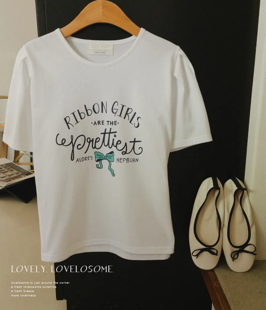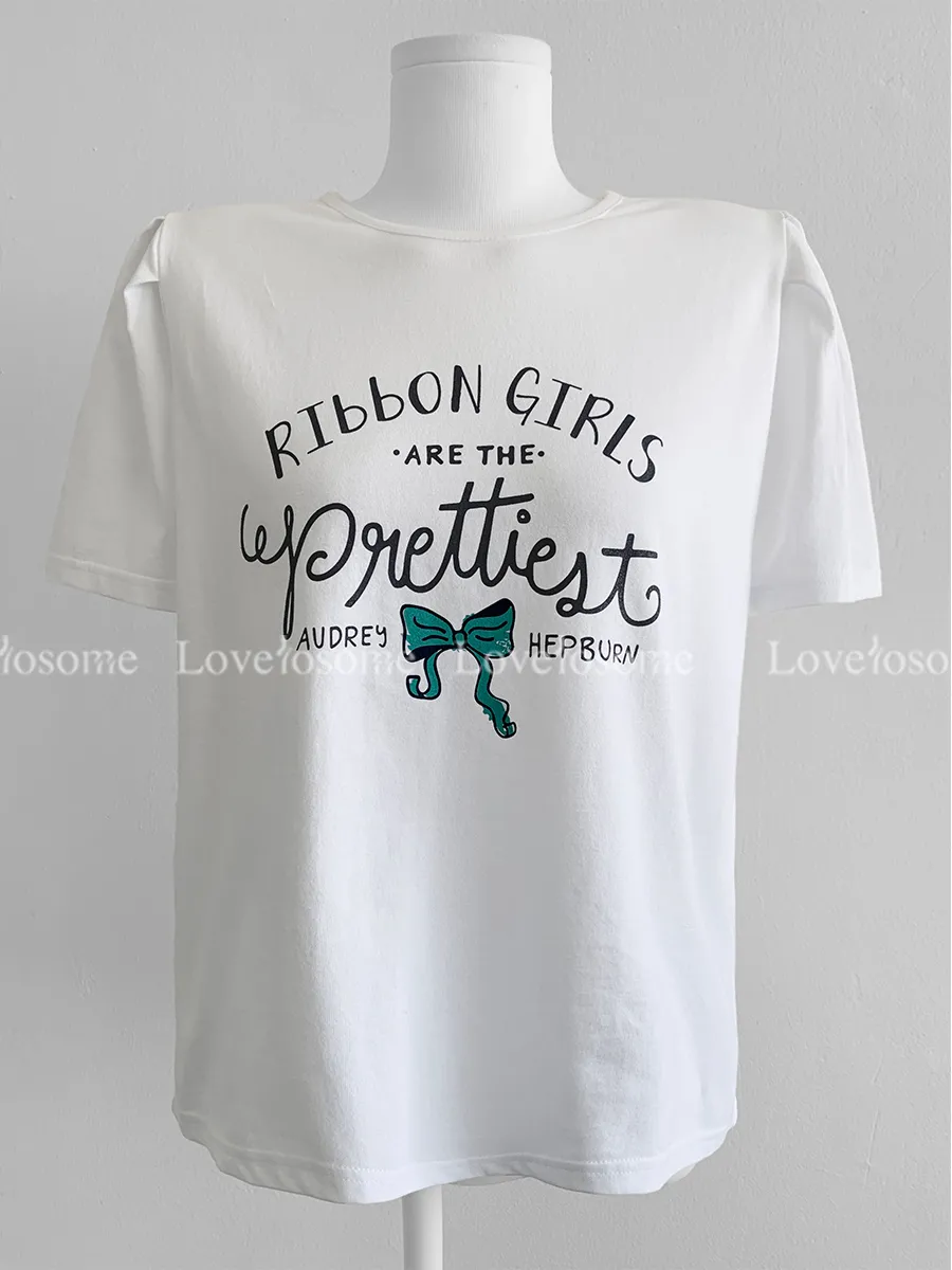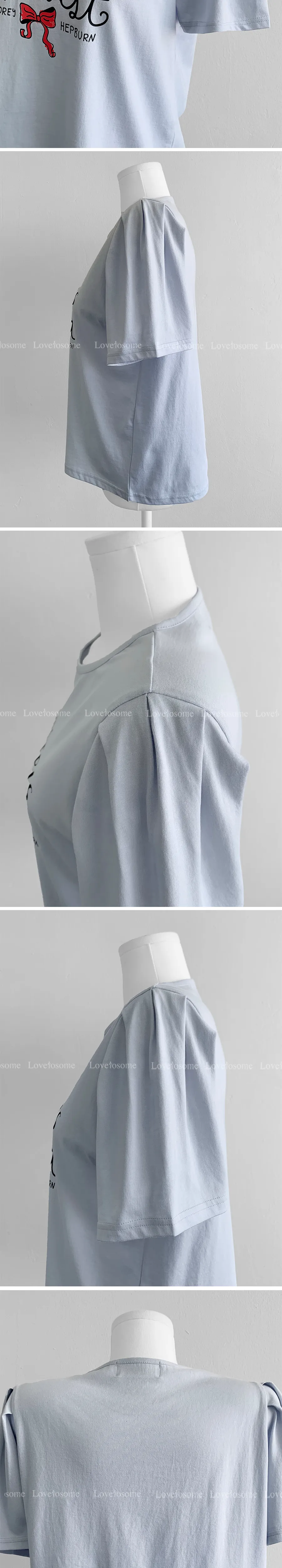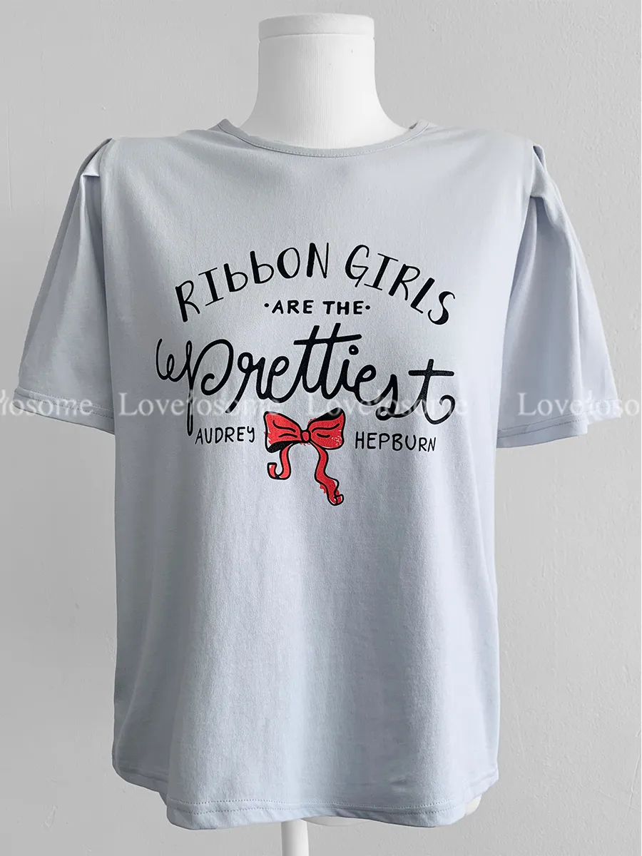 可愛蝴蝶結字母印花肩線剪裁短袖上衣