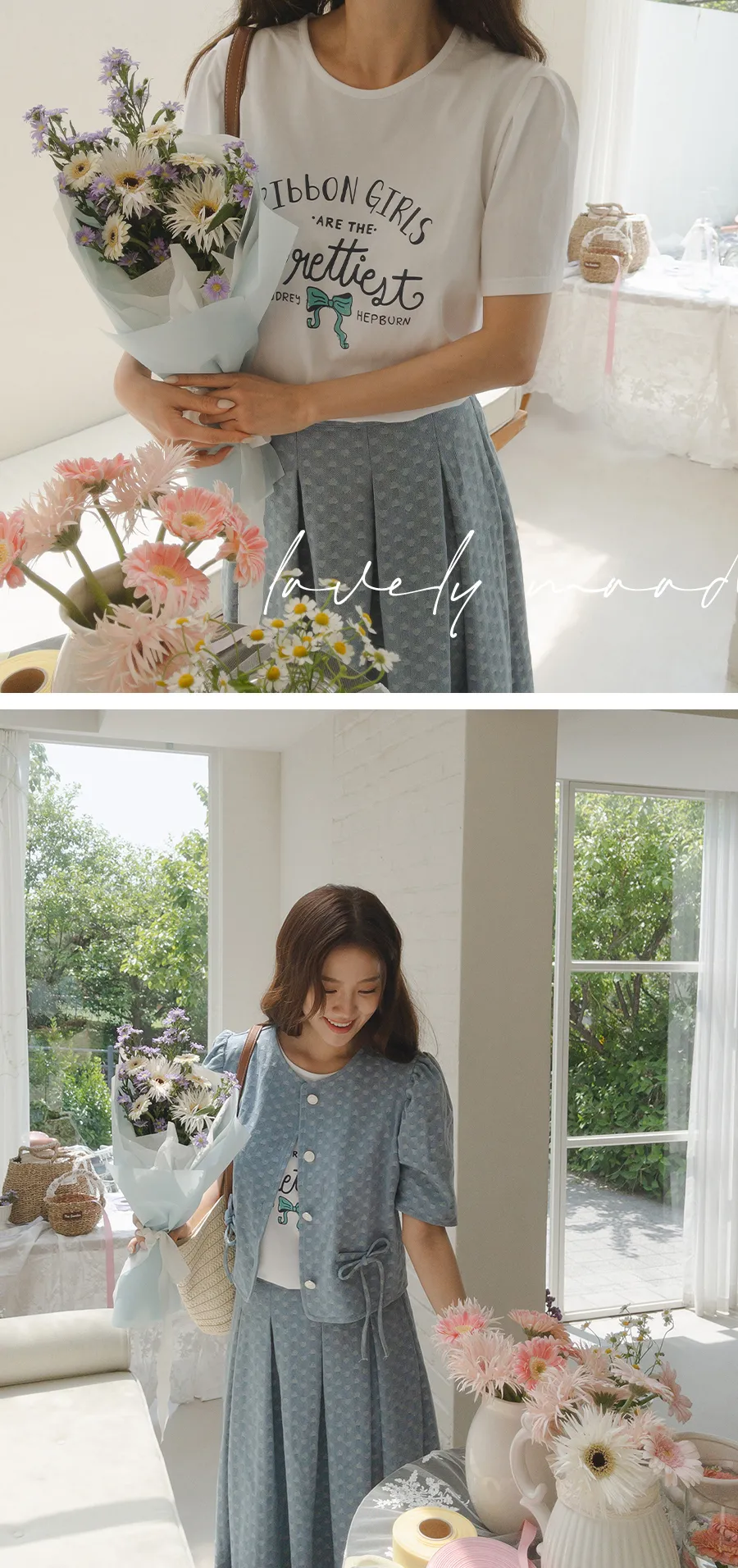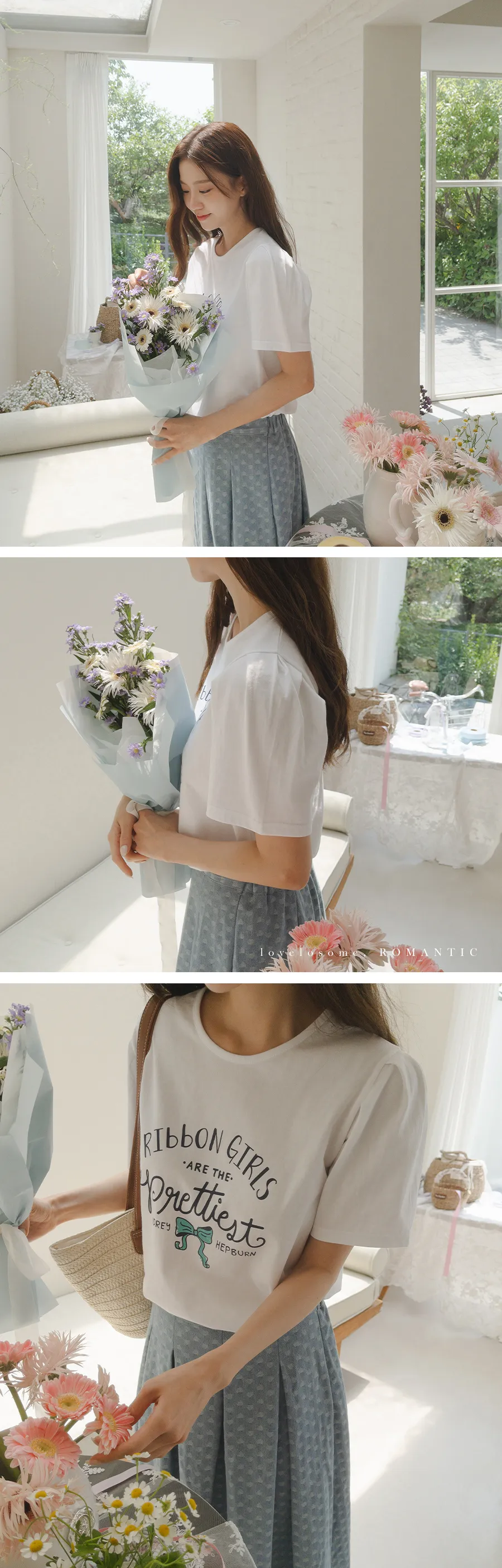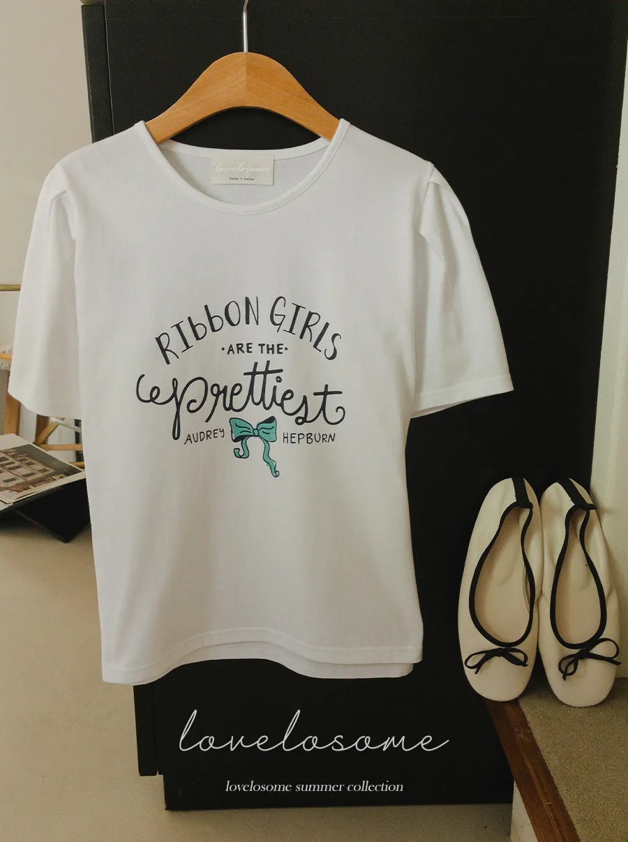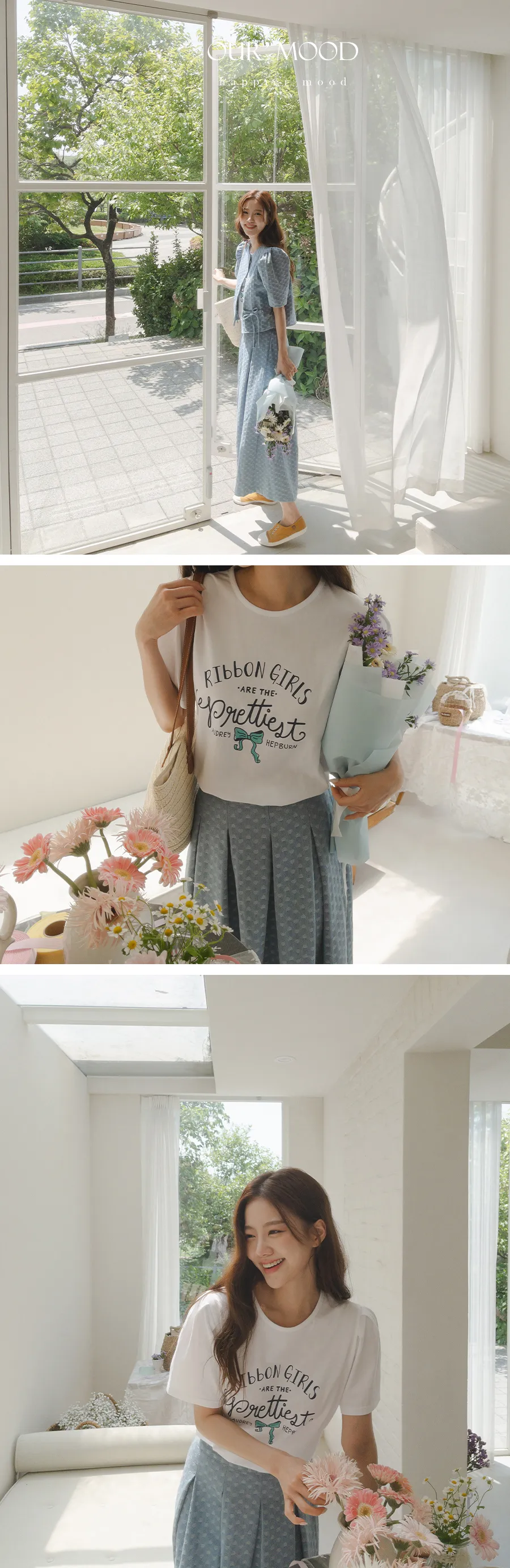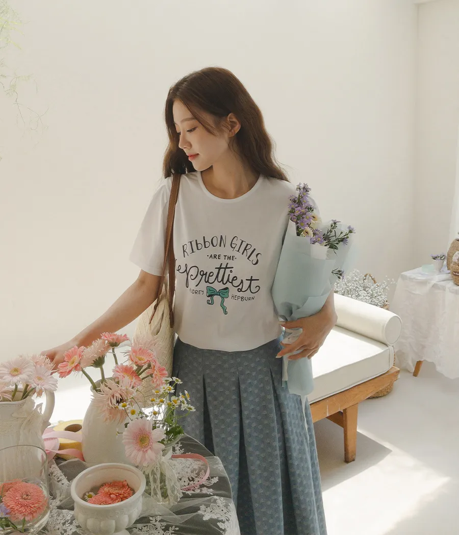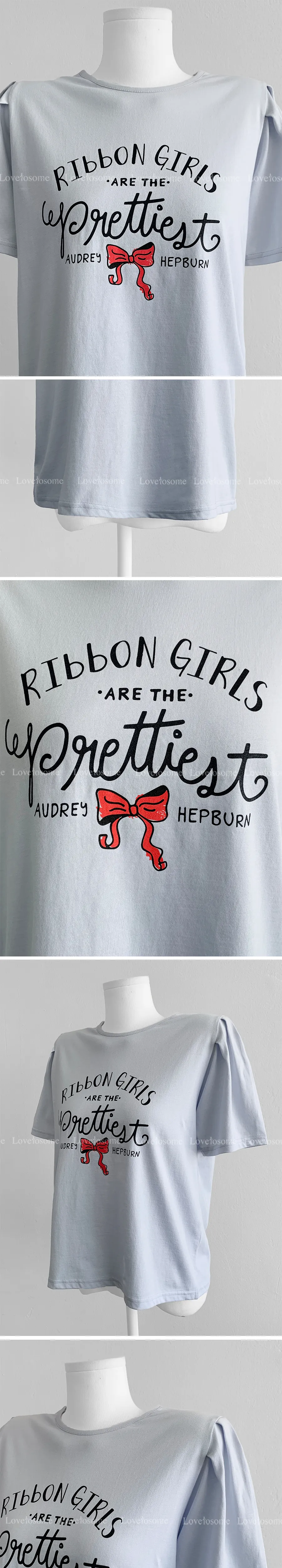 可愛蝴蝶結字母印花肩線剪裁短袖上衣