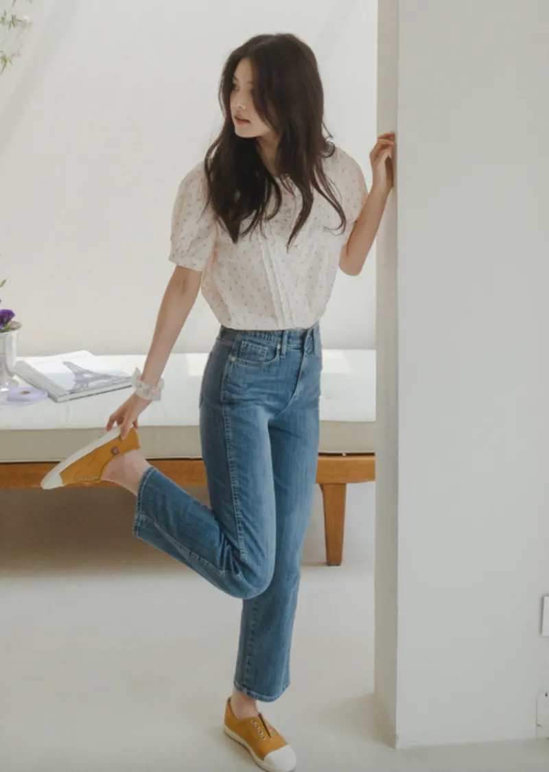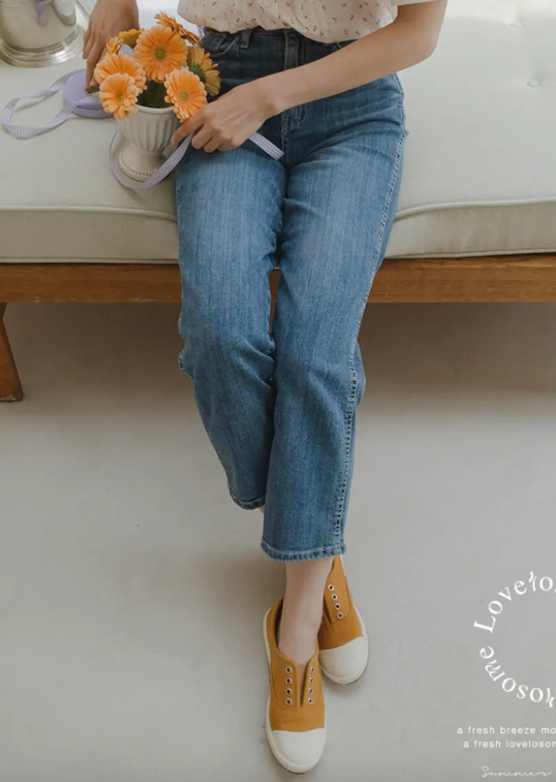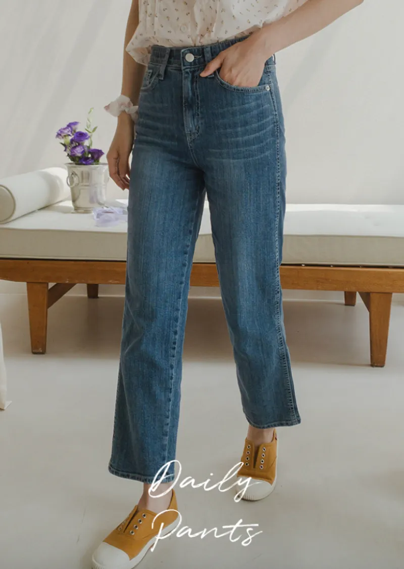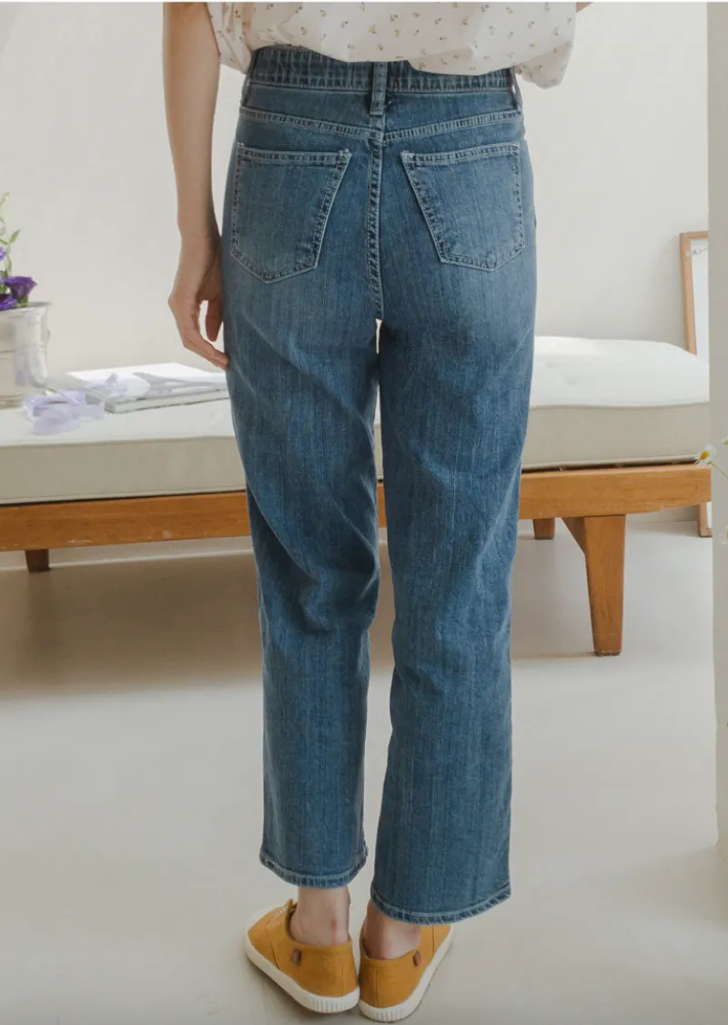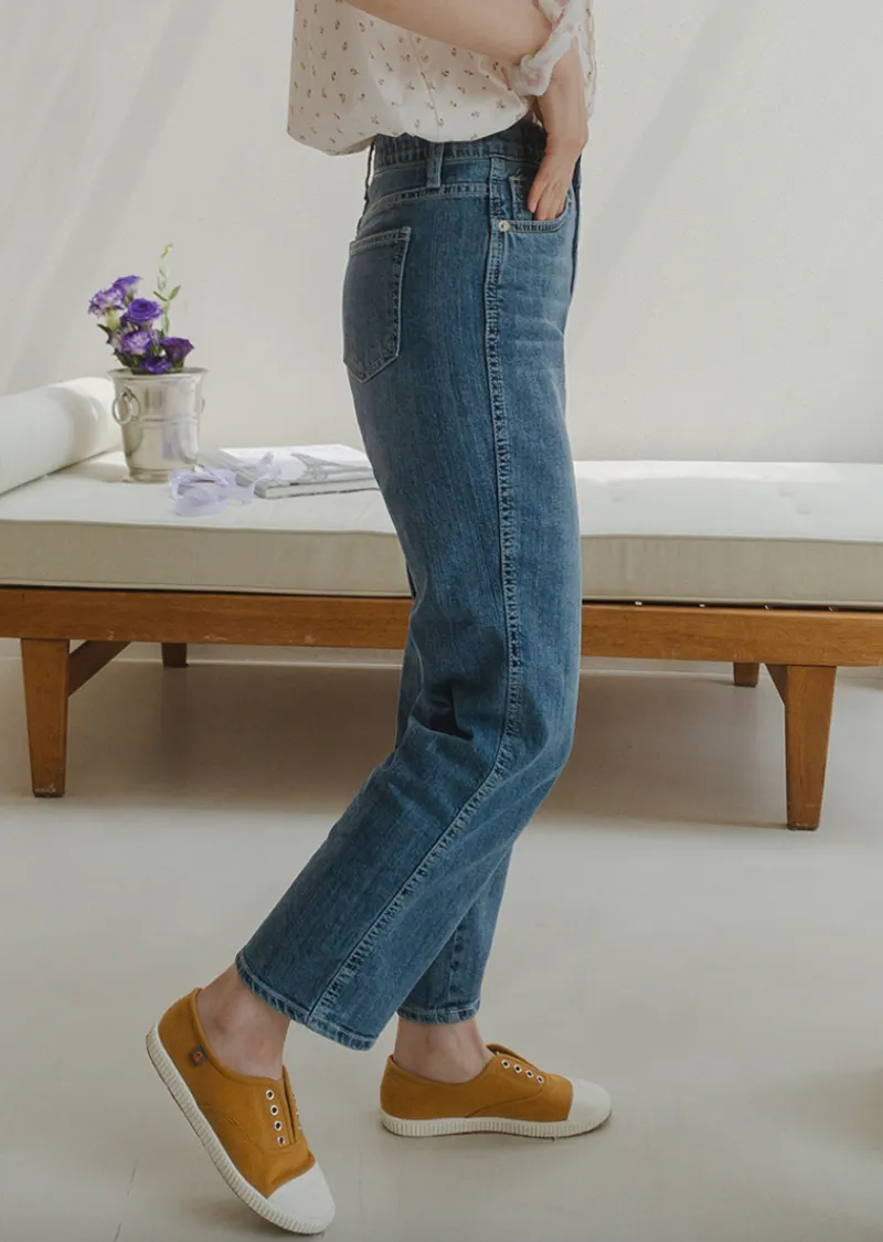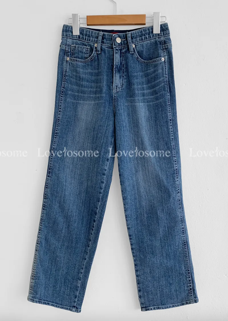 漂亮水洗線條修身隱藏鬆緊直筒牛仔褲