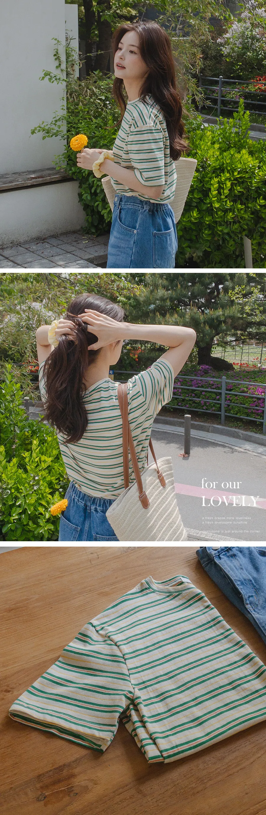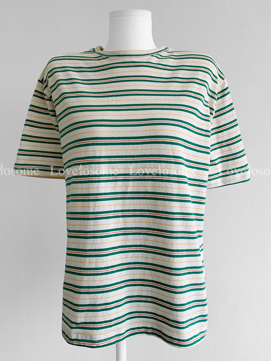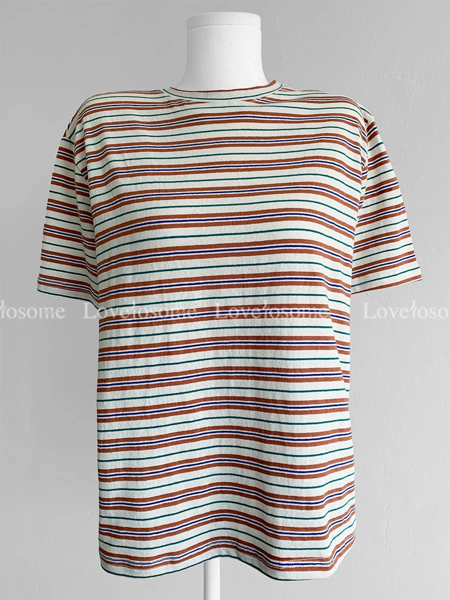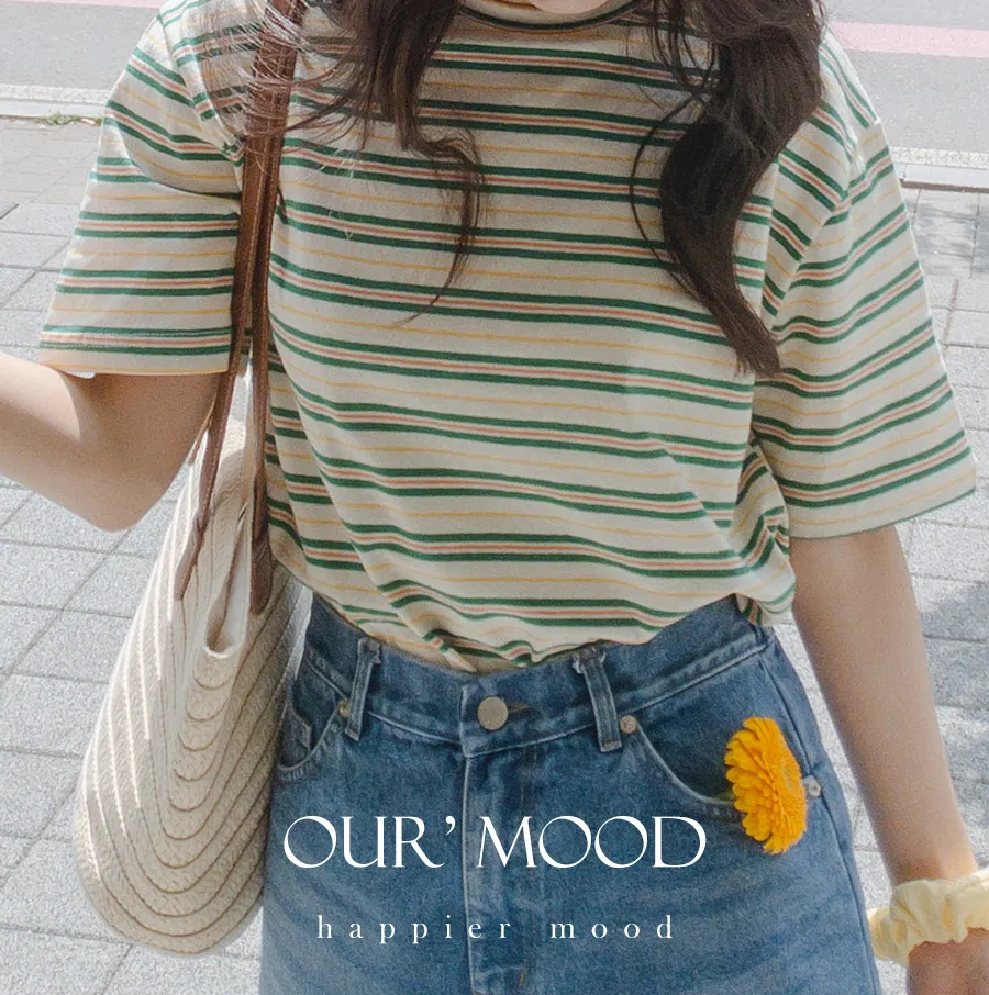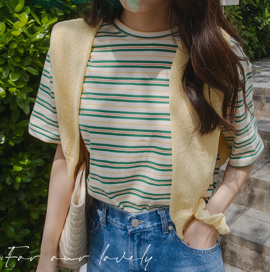 條紋短袖 T 卹 ,可愛活潑感~♡♥♡ 帶有迷人彩色條紋圖案的短袖T卹,這是一款看起來簡單的 T 卹,可為造型增添亮點,其標準輪廓自然流動並遮蓋身體線條,是一件非常適合日常穿著的 T 卹! 它看起來很基本,但當然彩色條紋讓它成為焦點。 穿上這件T卹,就會顯得很可愛