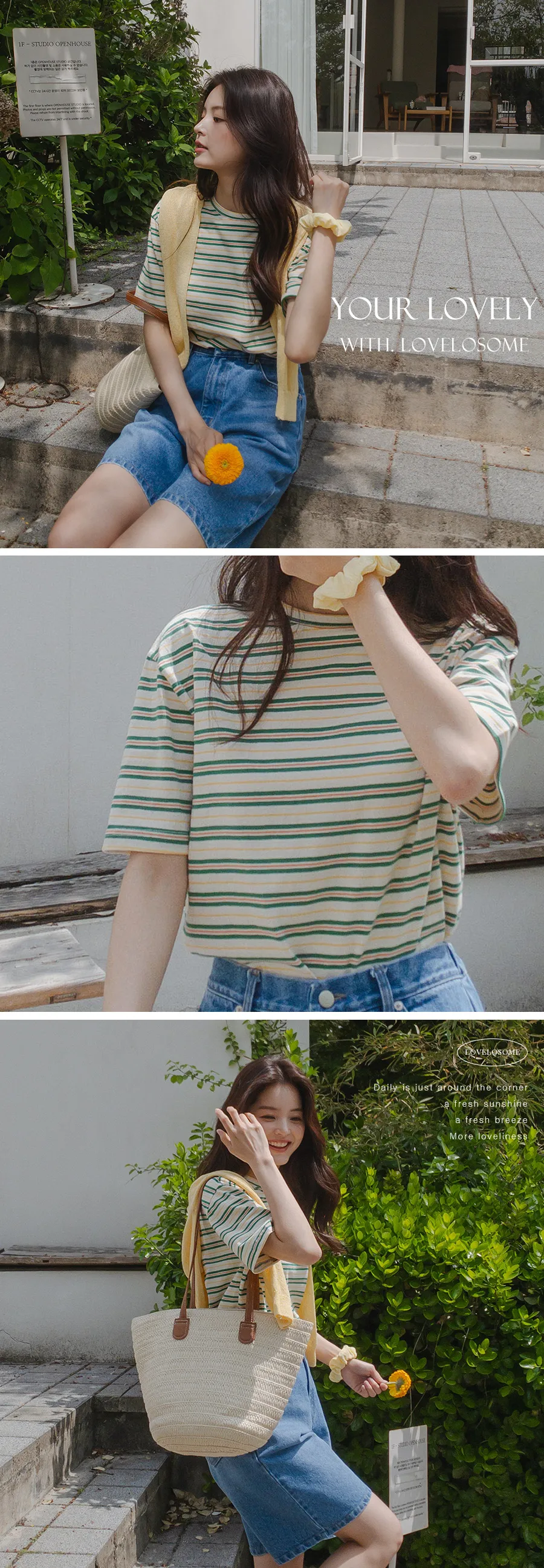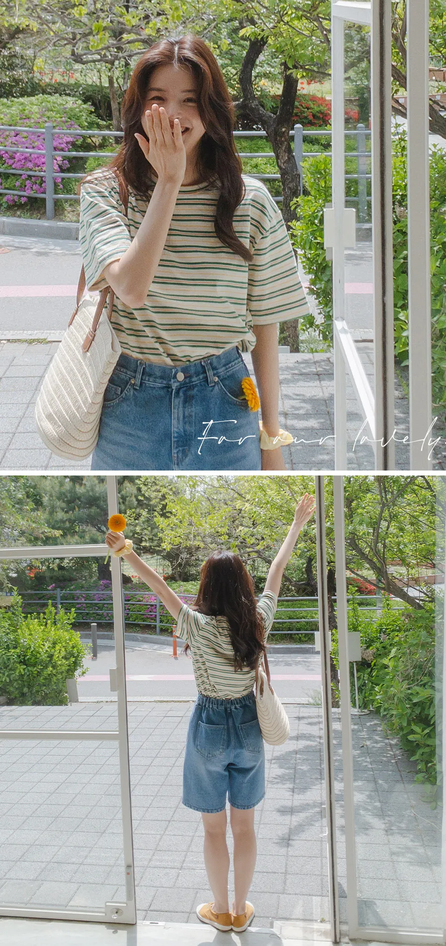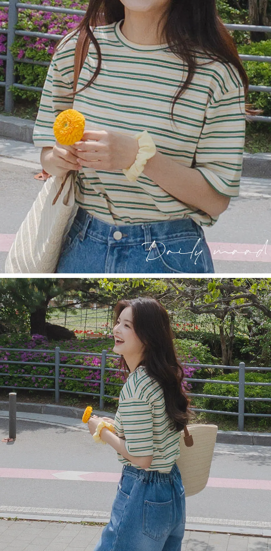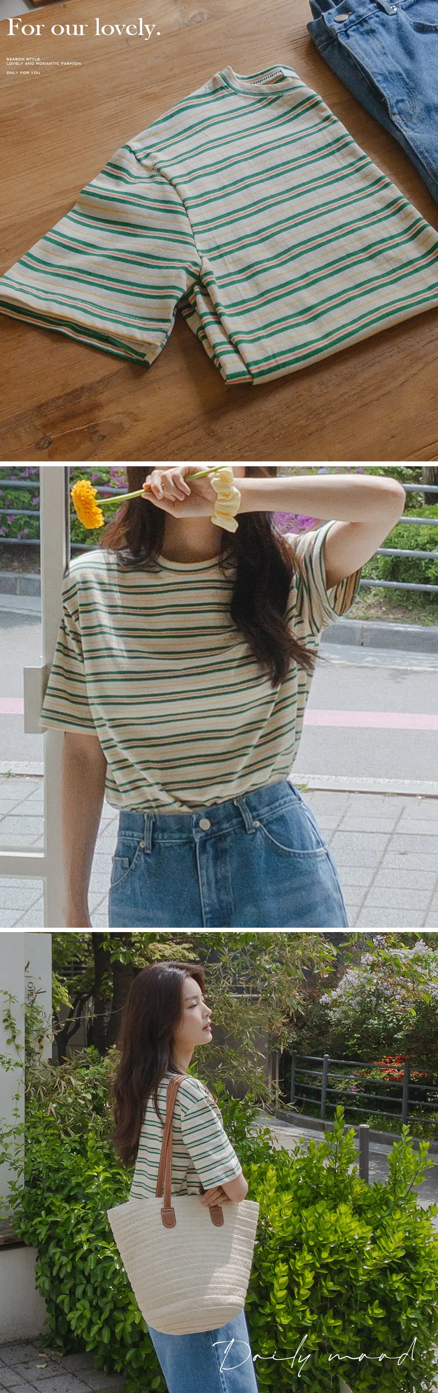 條紋短袖 T 卹 ,可愛活潑感~♡♥♡ 帶有迷人彩色條紋圖案的短袖T卹,這是一款看起來簡單的 T 卹,可為造型增添亮點,其標準輪廓自然流動並遮蓋身體線條,是一件非常適合日常穿著的 T 卹! 它看起來很基本,但當然彩色條紋讓它成為焦點。 穿上這件T卹,就會顯得很可愛