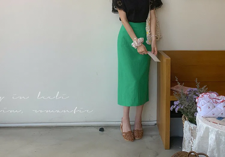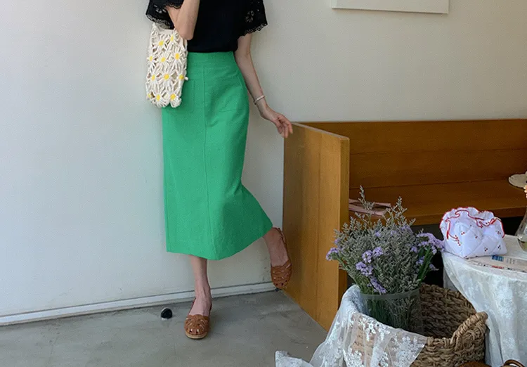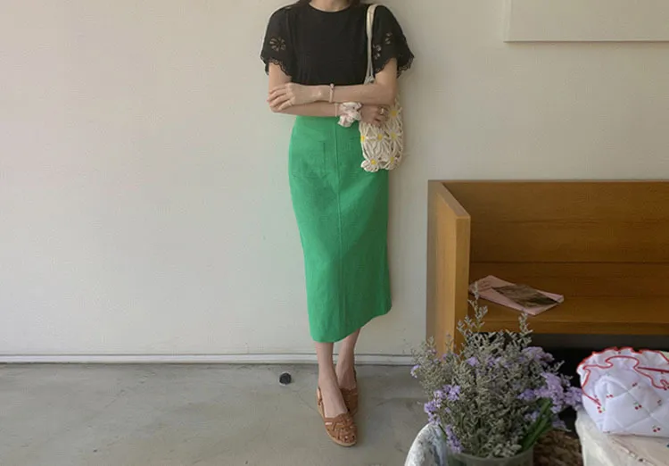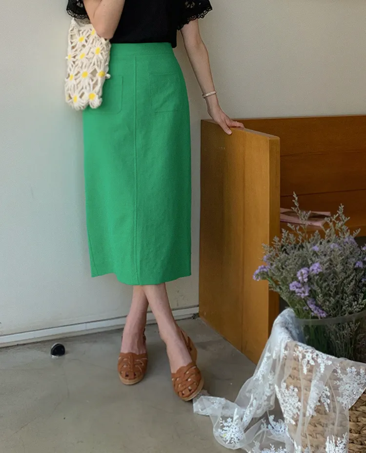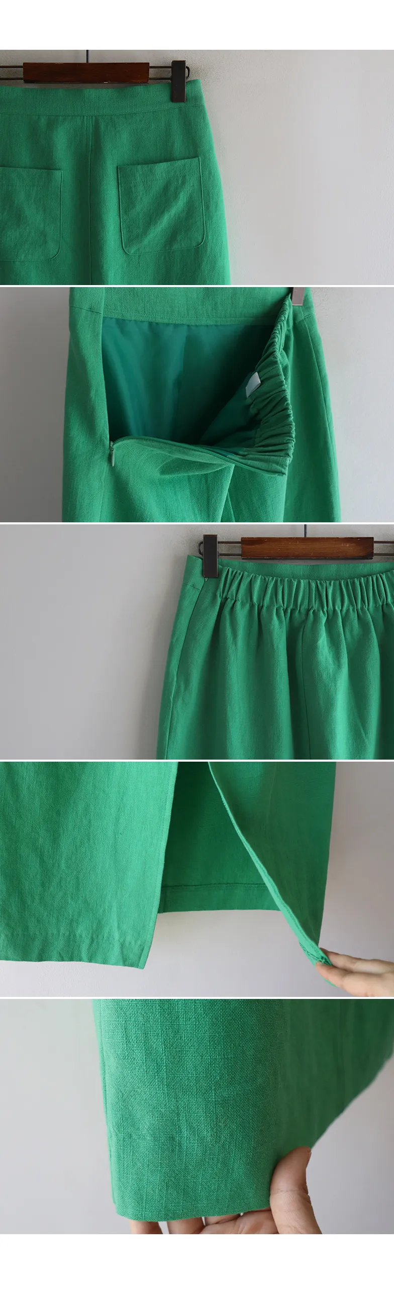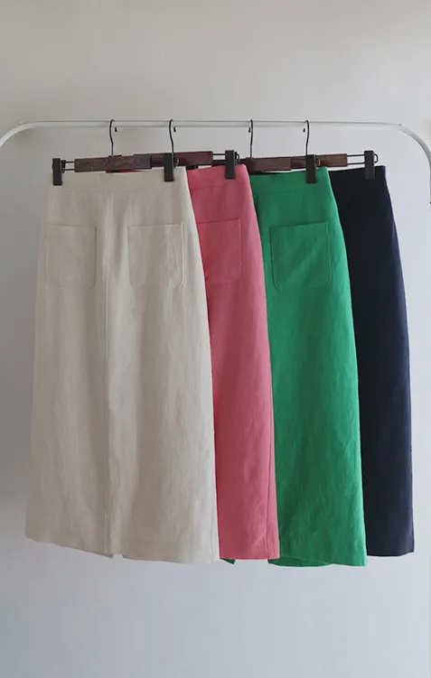 [亞麻裙♡ 完美、緊實、漂亮輪廓] [簡潔的H 型剪裁,修飾腿部線條] [柔軟的聚酯纖維襯裡,穿著舒適,不會感到不適] [前面口袋細節後側開衩設計突出!