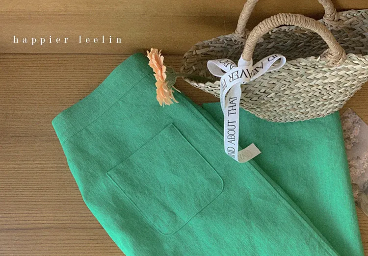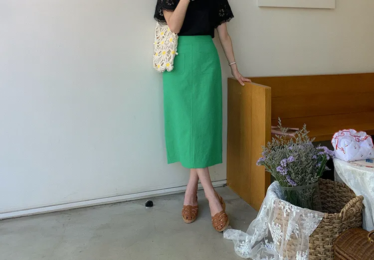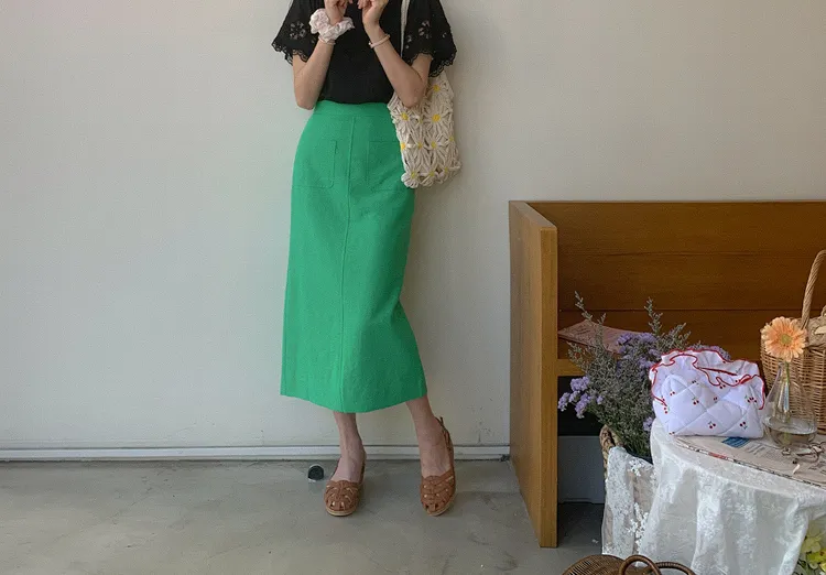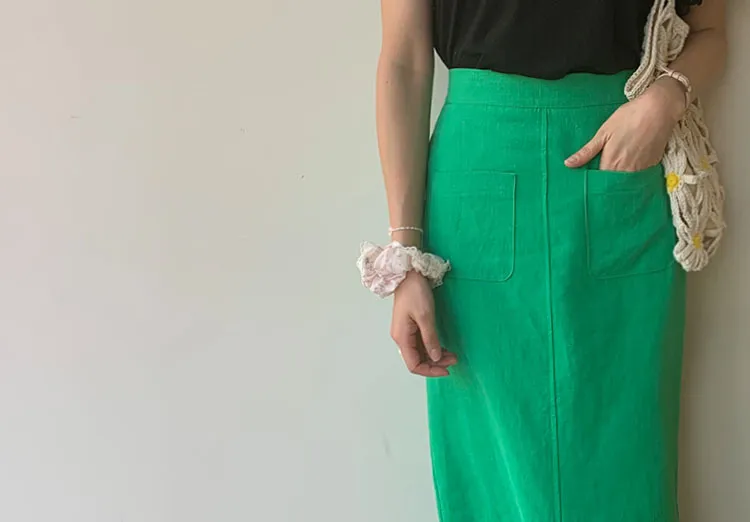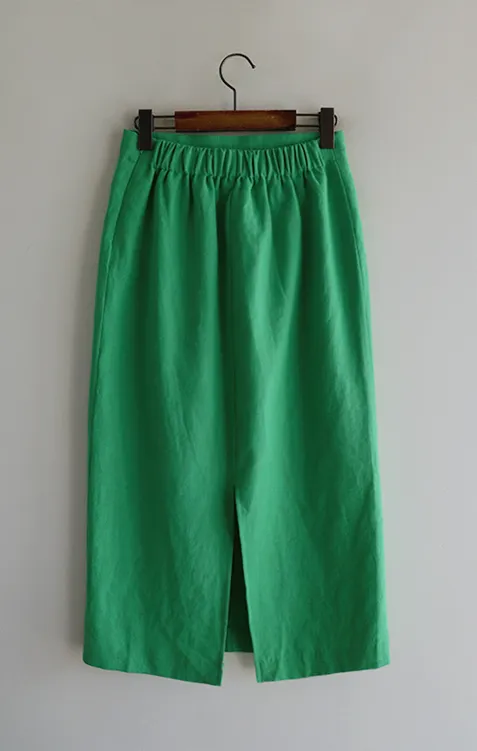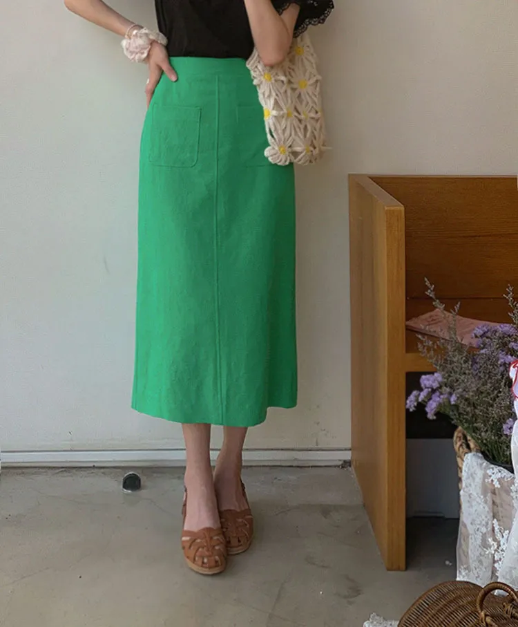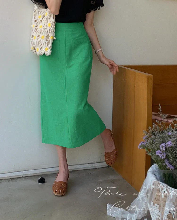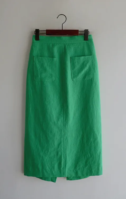 漂亮版型口袋H剪裁後開衩亞麻中長裙