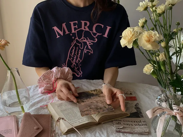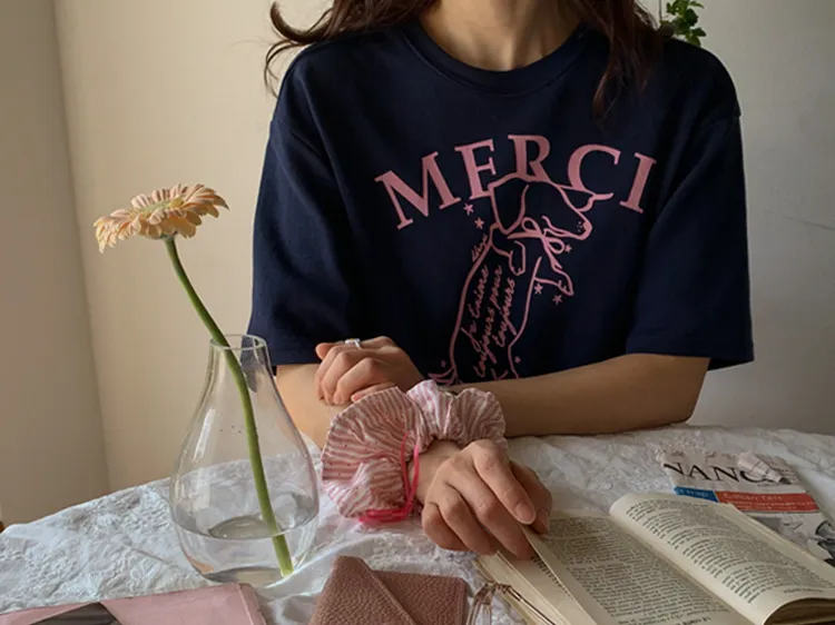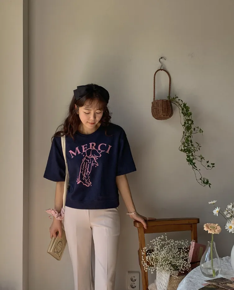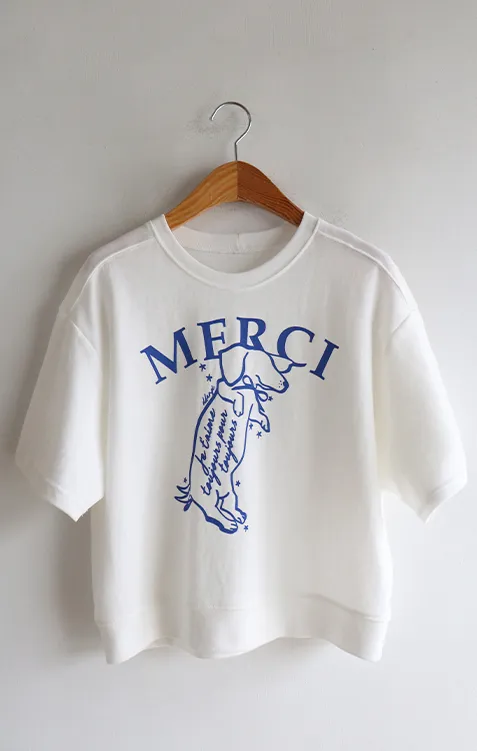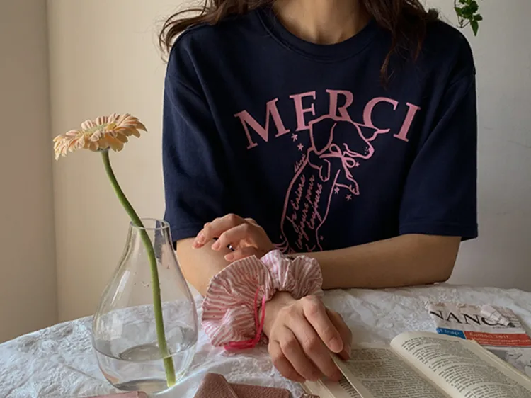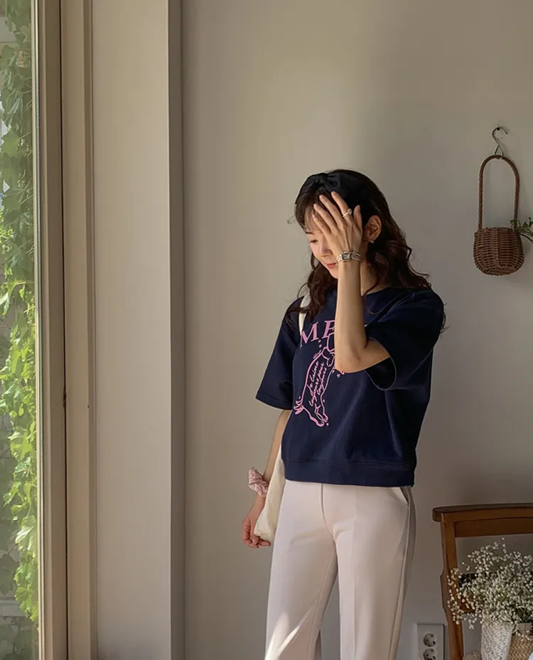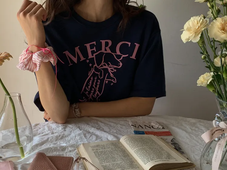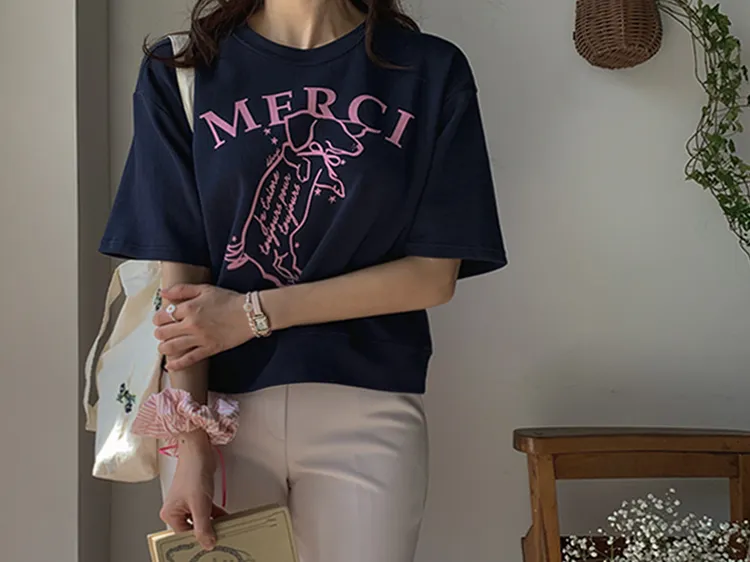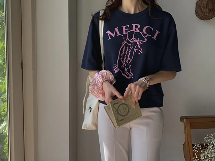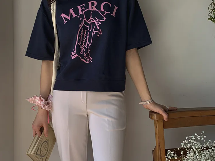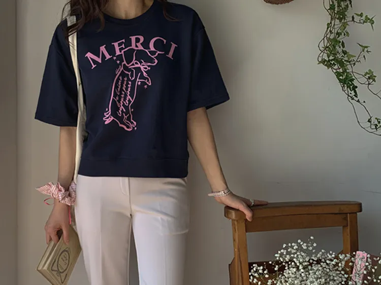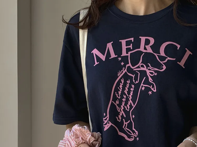 [帶有色彩協調的字母和狗狗印花上衣] [寬鬆舒適的合身] [搭配牛仔褲、休閒褲和裙子的日常物品]