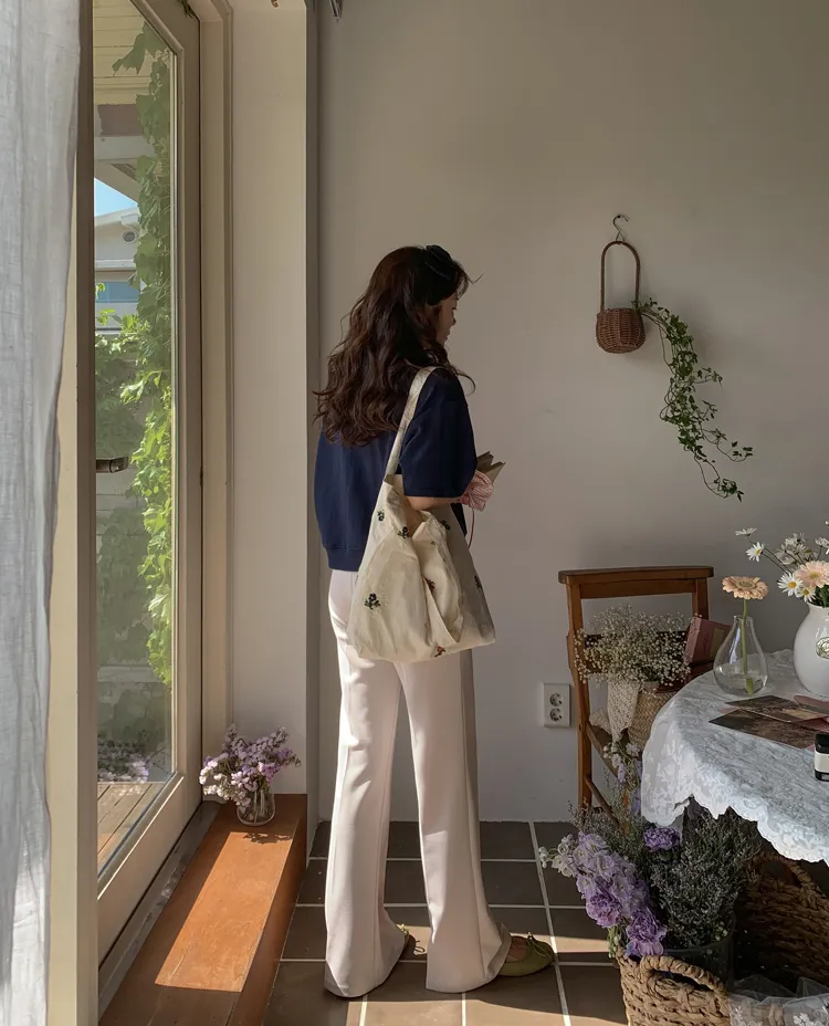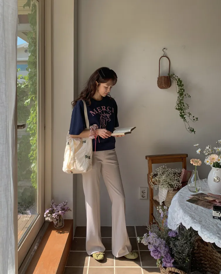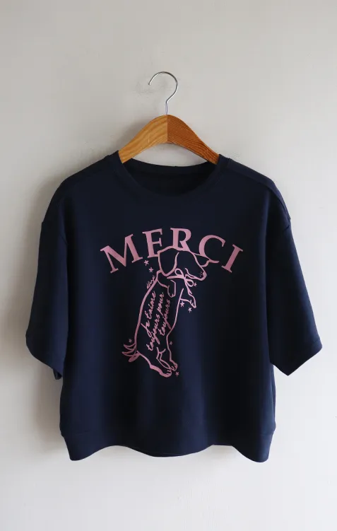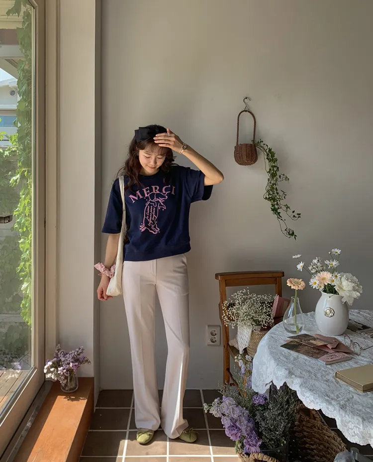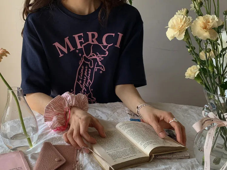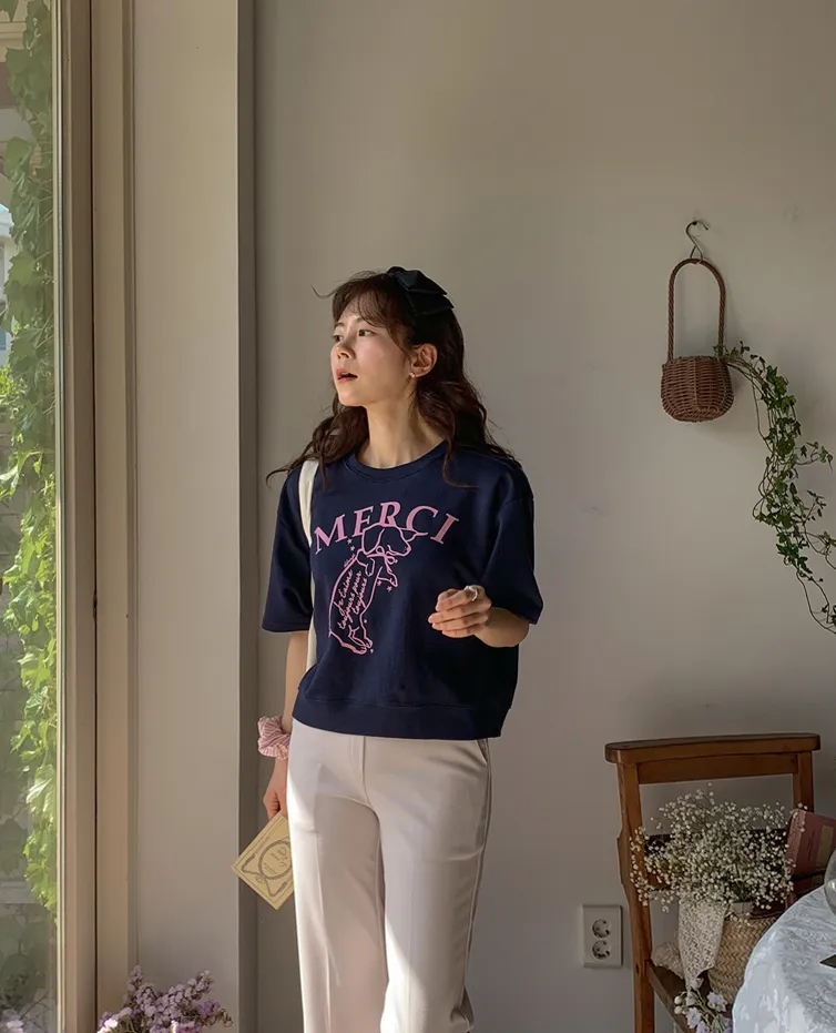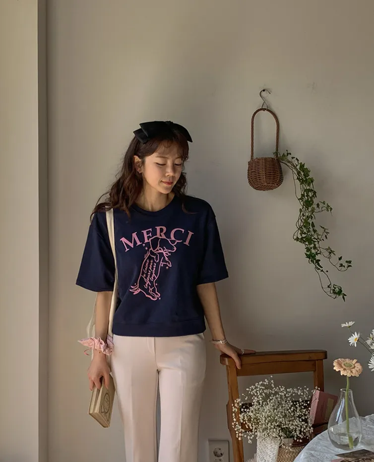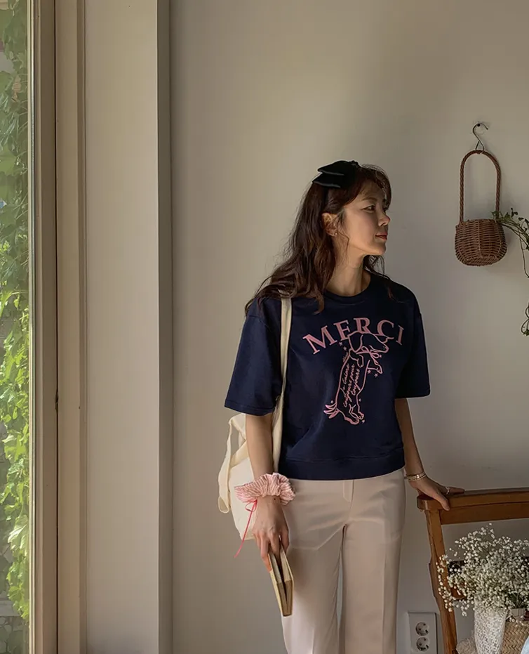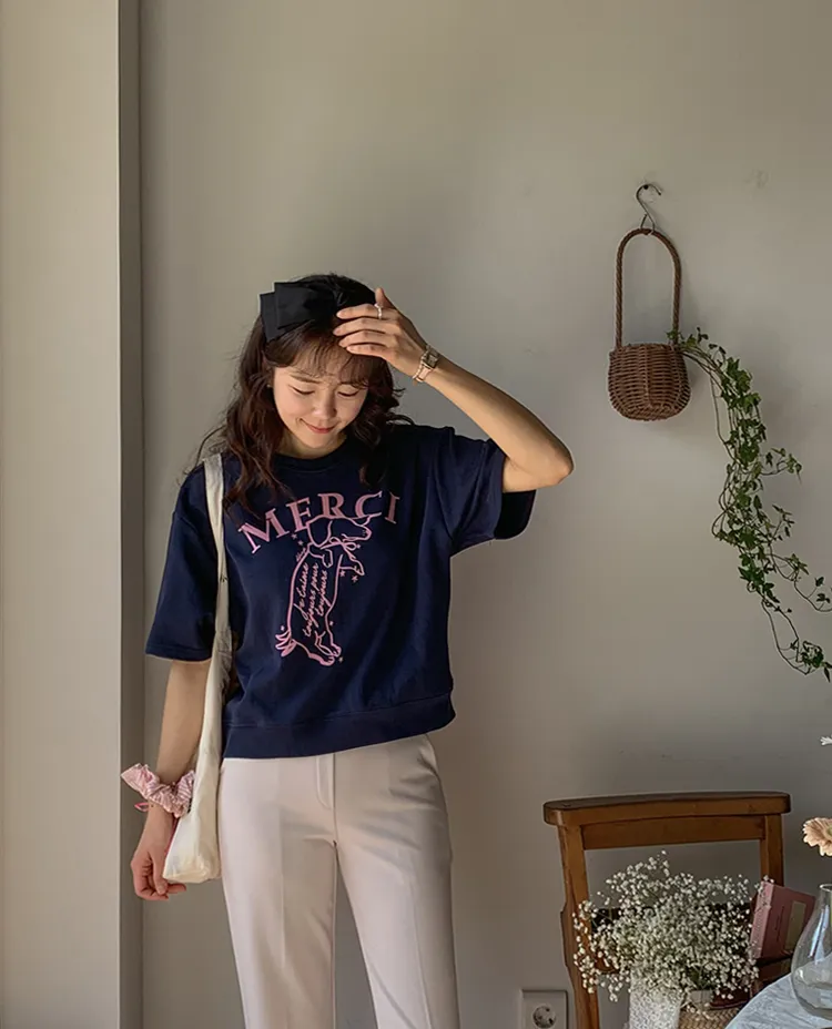[帶有色彩協調的字母和狗狗印花上衣] [寬鬆舒適的合身] [搭配牛仔褲、休閒褲和裙子的日常物品]