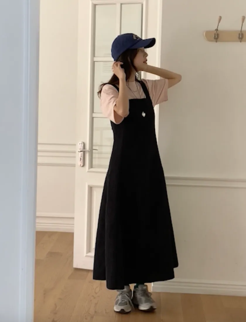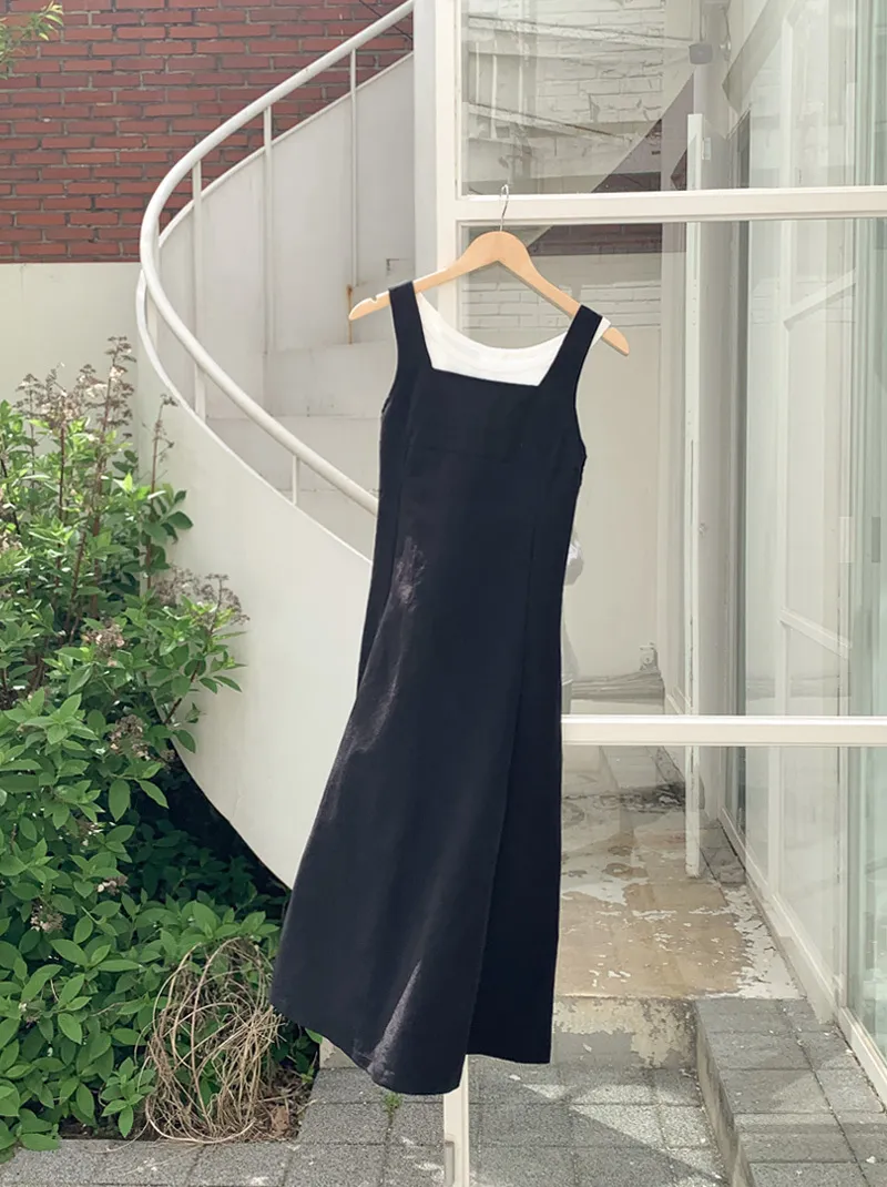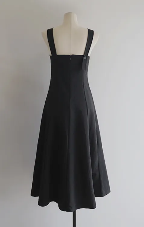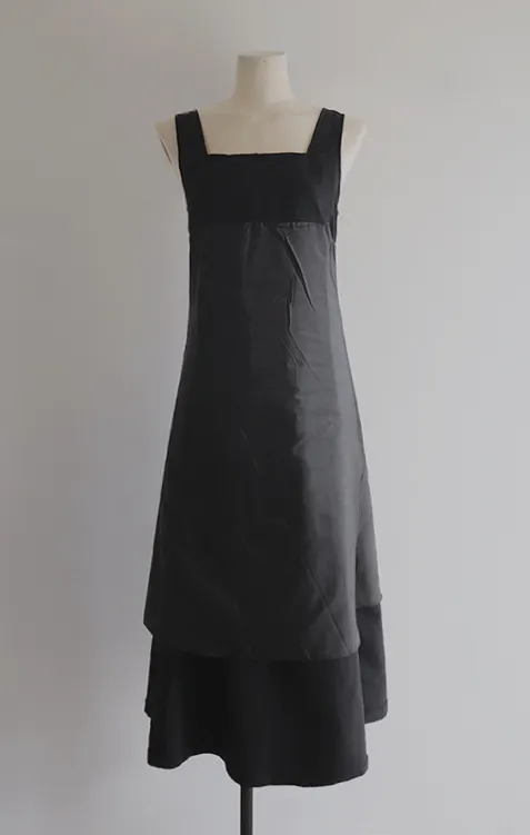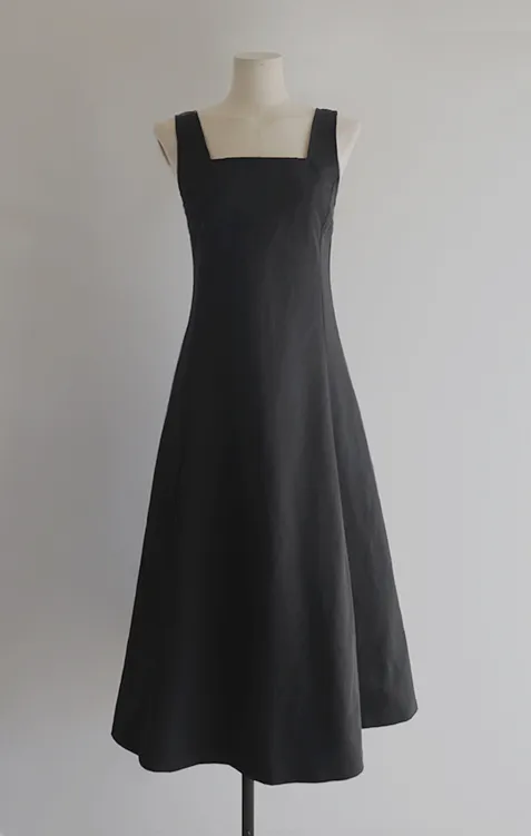 復古休閒的連身裙:) 方領和無袖設計營造出修長的輪廓。 可透過後扣輕鬆調整長度。 與各種單品疊戴,也很好看。穿著舒適,夏天可以單獨搭配,打造清涼日常的造型。 寬鬆的傘擺形設計營造出女性化的輪廓。