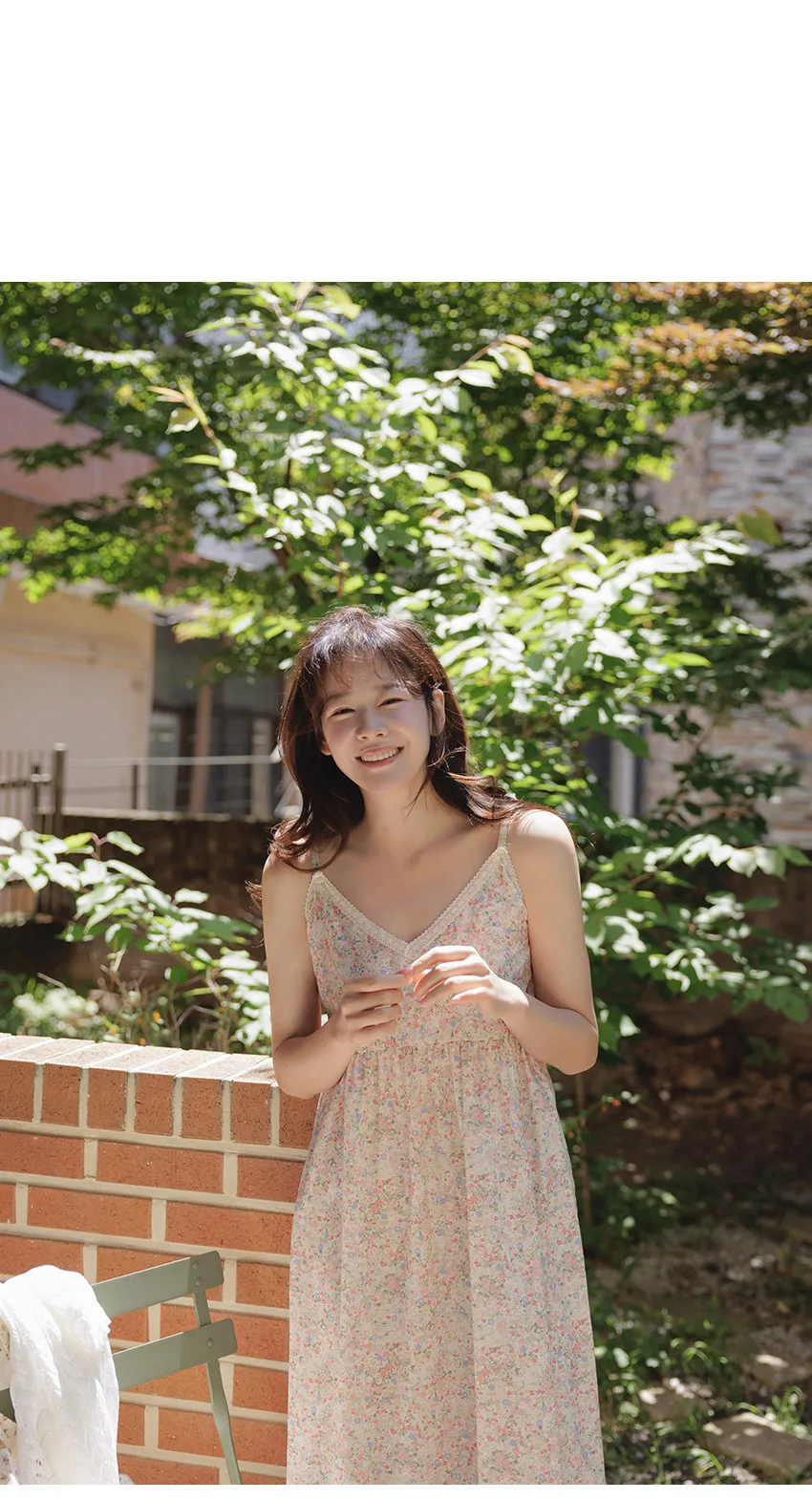 寬大的V領線條,花朵圖案,點綴著蕾絲,增添了一種含蓄、俏麗、可愛的魅力。長長的長度和線條讓身材更加修長,細肩帶、露出鎖骨的領口,給人一種精緻的感覺,發揮了浪漫和女人味的情緒。可以疊在一件內搭T恤上,或者搭配一件薄開衫外套。是旅行度假的絕佳單品,也是日常穿搭中充滿女人味的單品!
