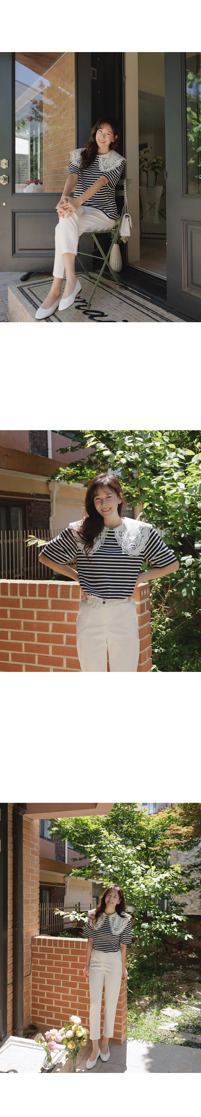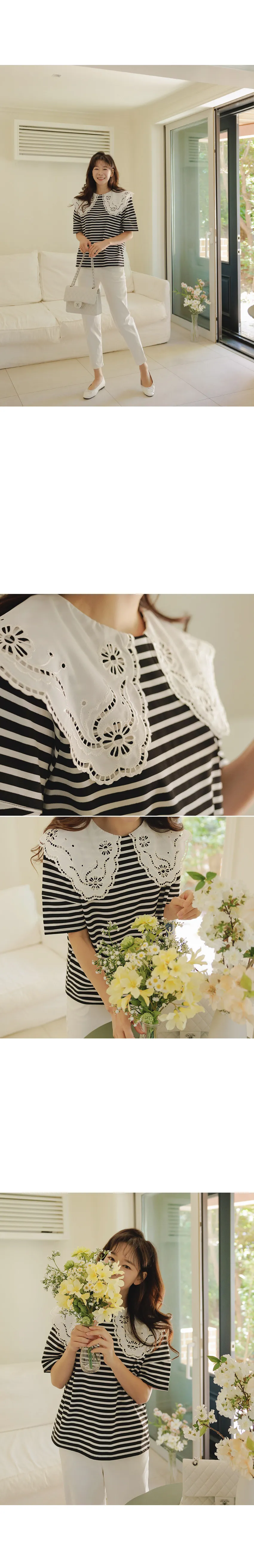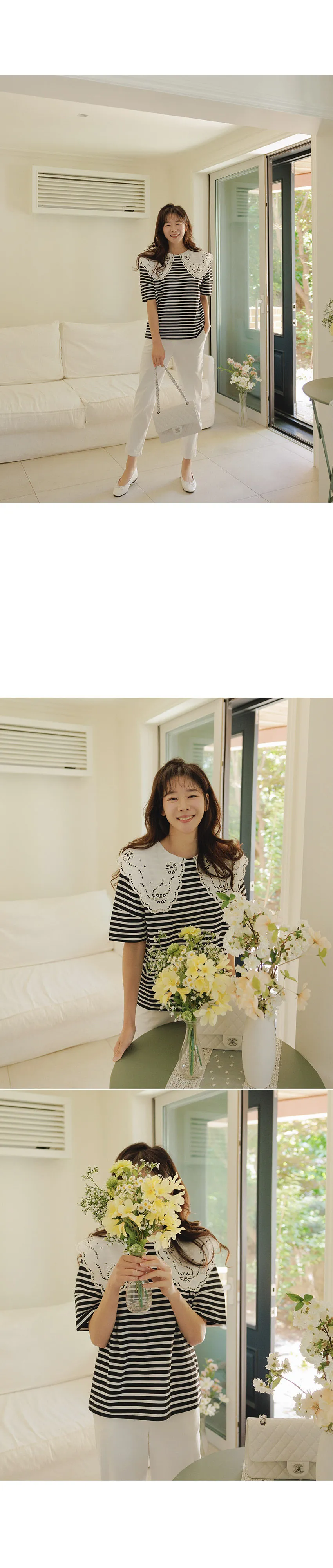 一款條紋圖案的短袖上衣,寬大的蕾絲領設計增添了特別感。自然下垂的肩線,寬鬆的版型,穿著舒適。搭配簡單的棉褲,就有一種俐落又時尚的日常造型;如果搭配裙子或牛仔褲,條紋圖案和蕾絲領子營造出一種休閒可愛的氛圍。有不受潮流限制的條紋圖案!