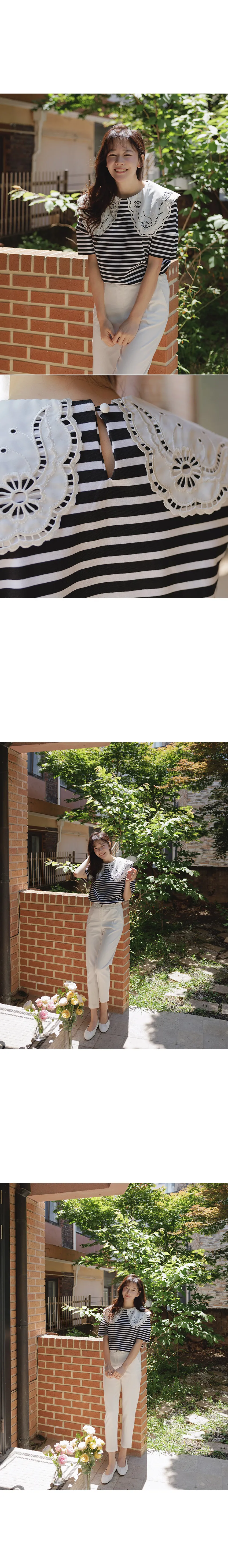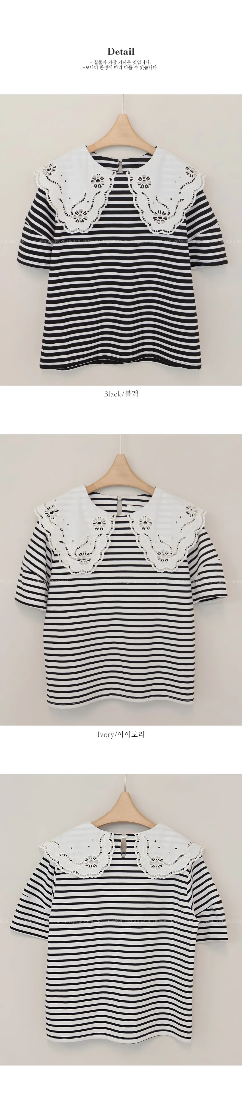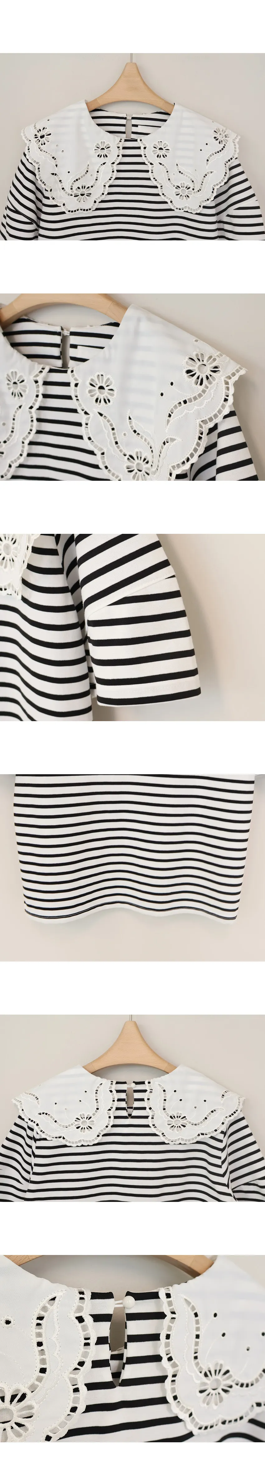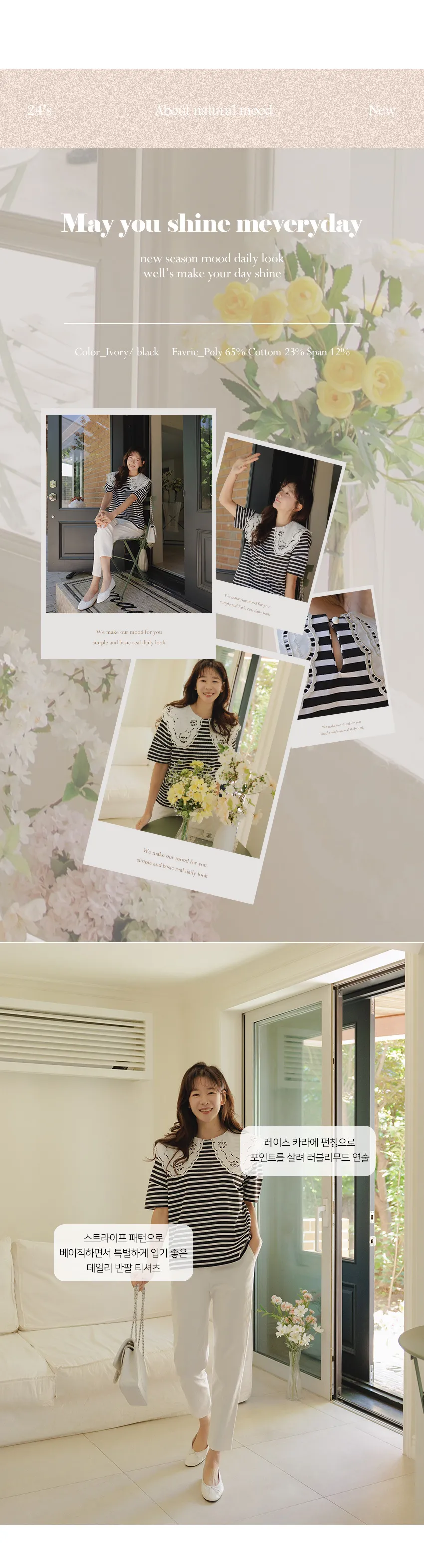 一款條紋圖案的短袖上衣,寬大的蕾絲領設計增添了特別感。自然下垂的肩線,寬鬆的版型,穿著舒適。搭配簡單的棉褲,就有一種俐落又時尚的日常造型;如果搭配裙子或牛仔褲,條紋圖案和蕾絲領子營造出一種休閒可愛的氛圍。有不受潮流限制的條紋圖案!