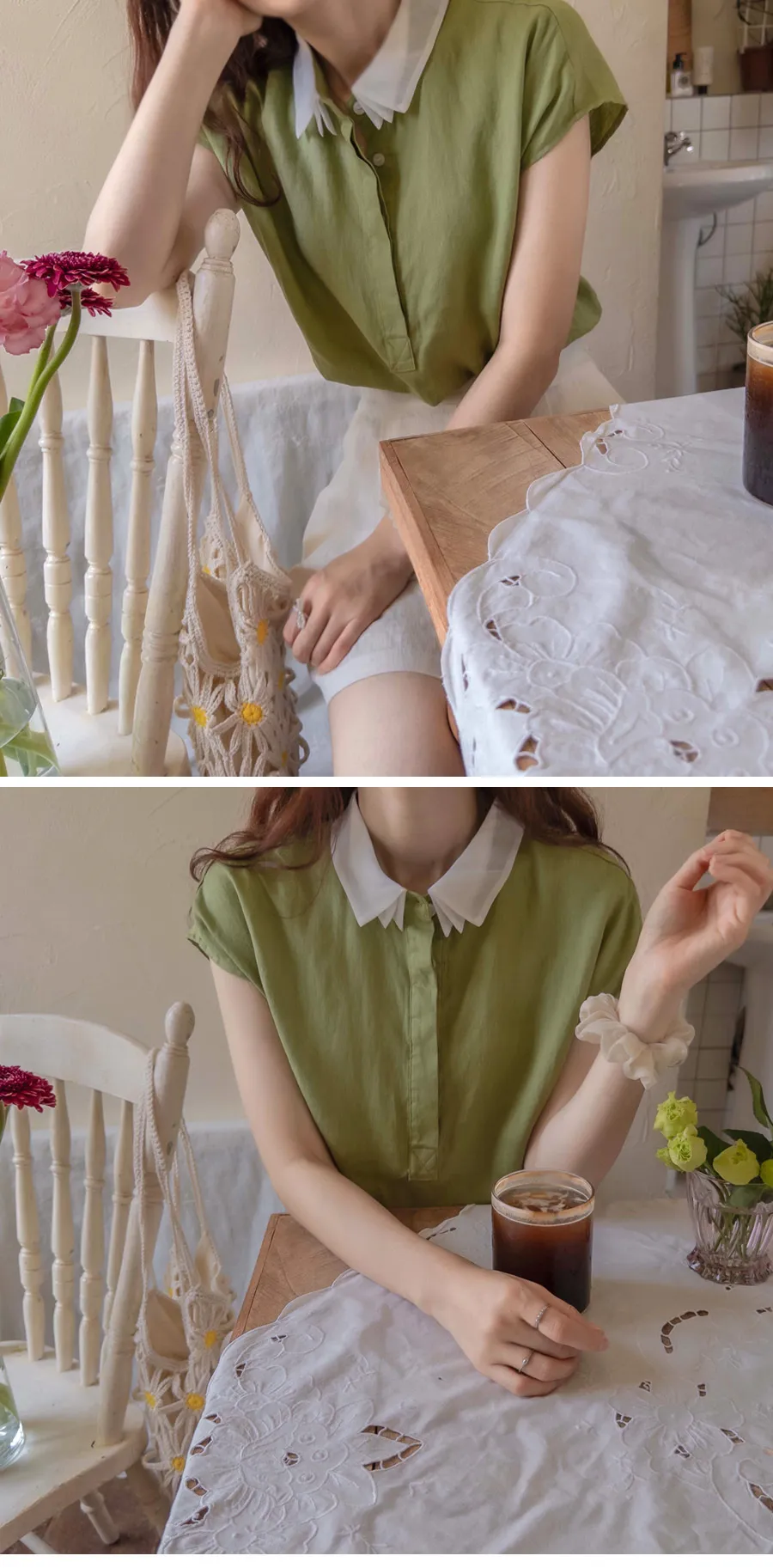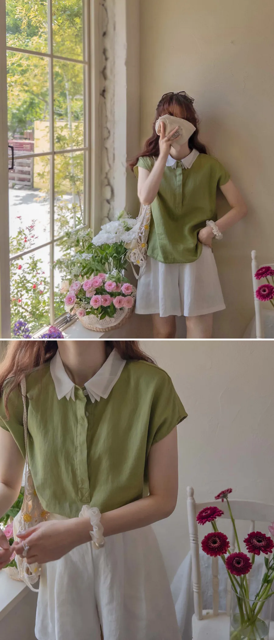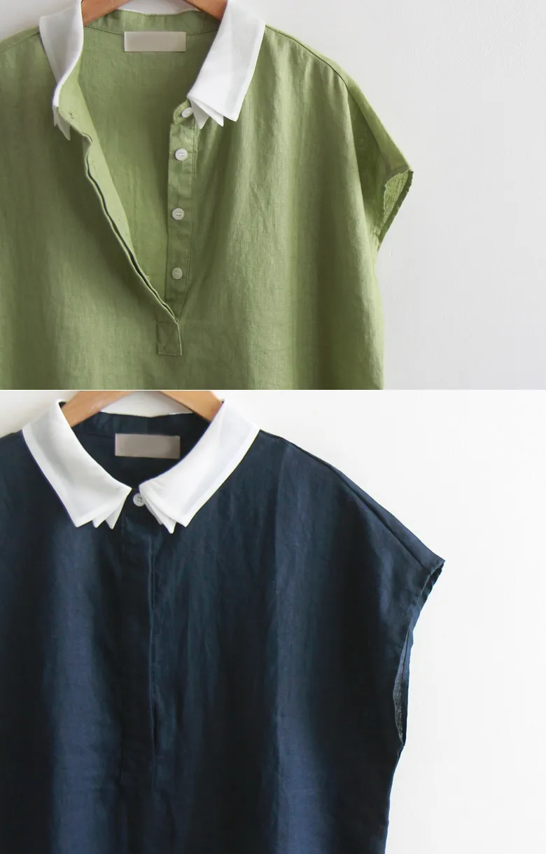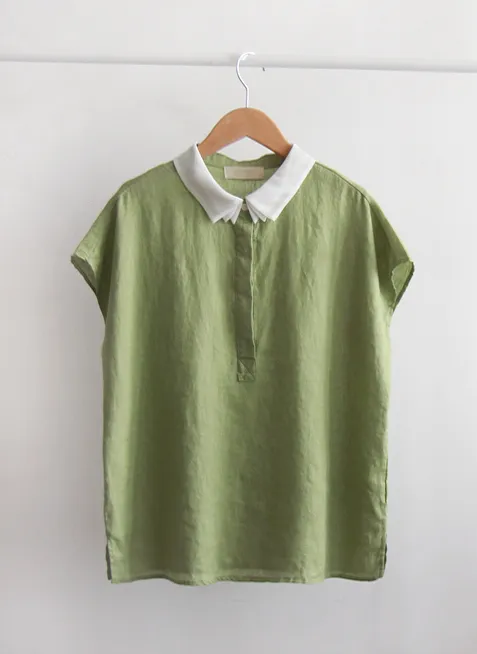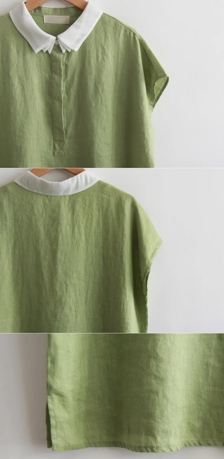 【亞麻材質】【清新精緻的色調夏季色】【立體設計的三層領口】【底部的開衩也很漂亮】【夏天優雅穿搭】【推薦適合季節且時尚合身的夏季上衣]
