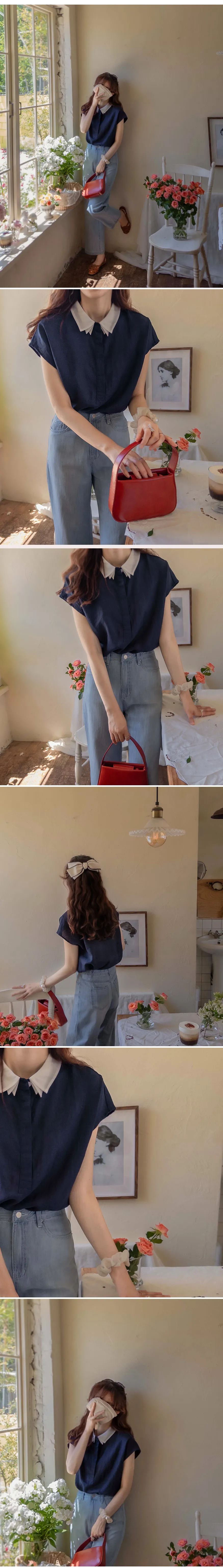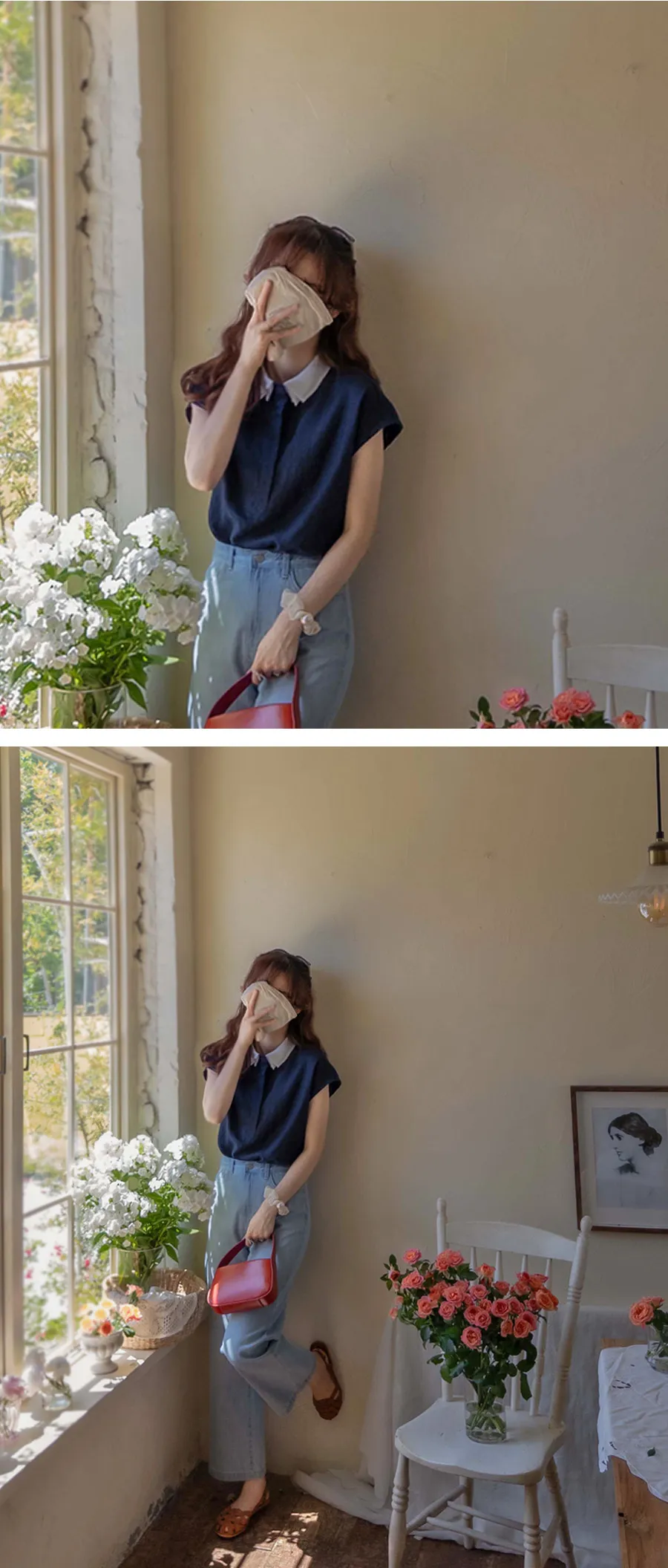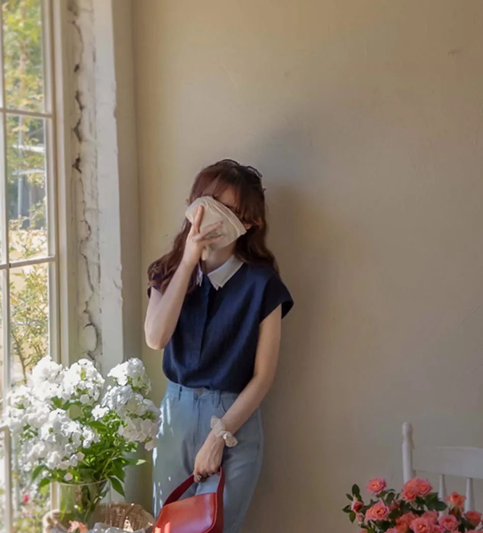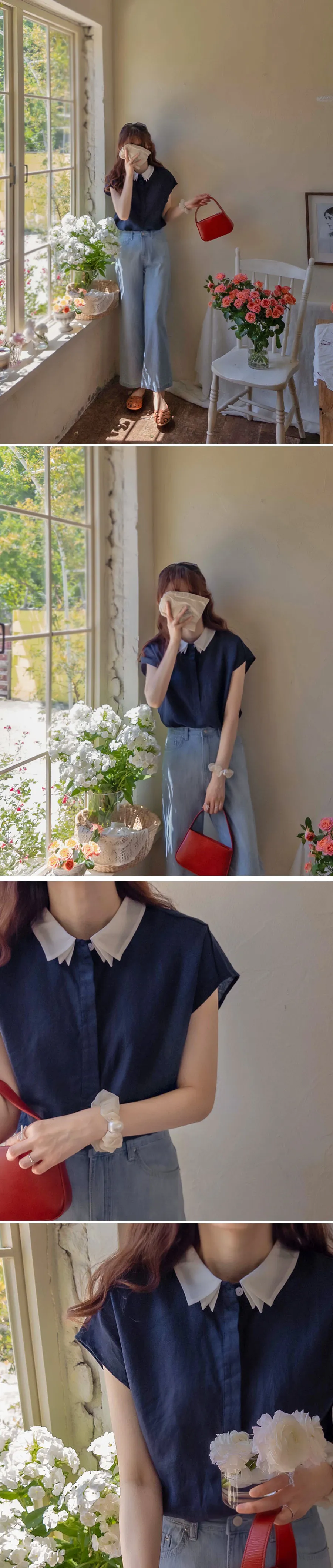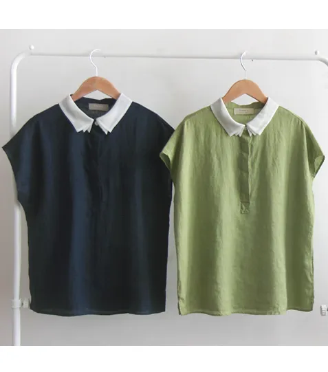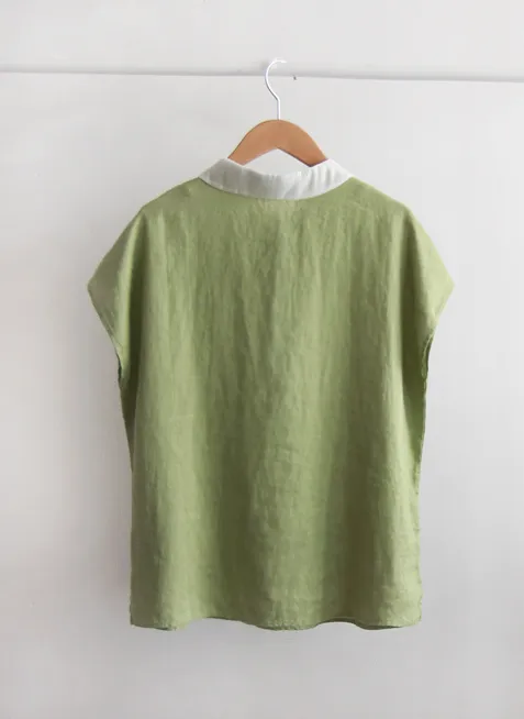 【亞麻材質】【清新精緻的色調夏季色】【立體設計的三層領口】【底部的開衩也很漂亮】【夏天優雅穿搭】【推薦適合季節且時尚合身的夏季上衣]