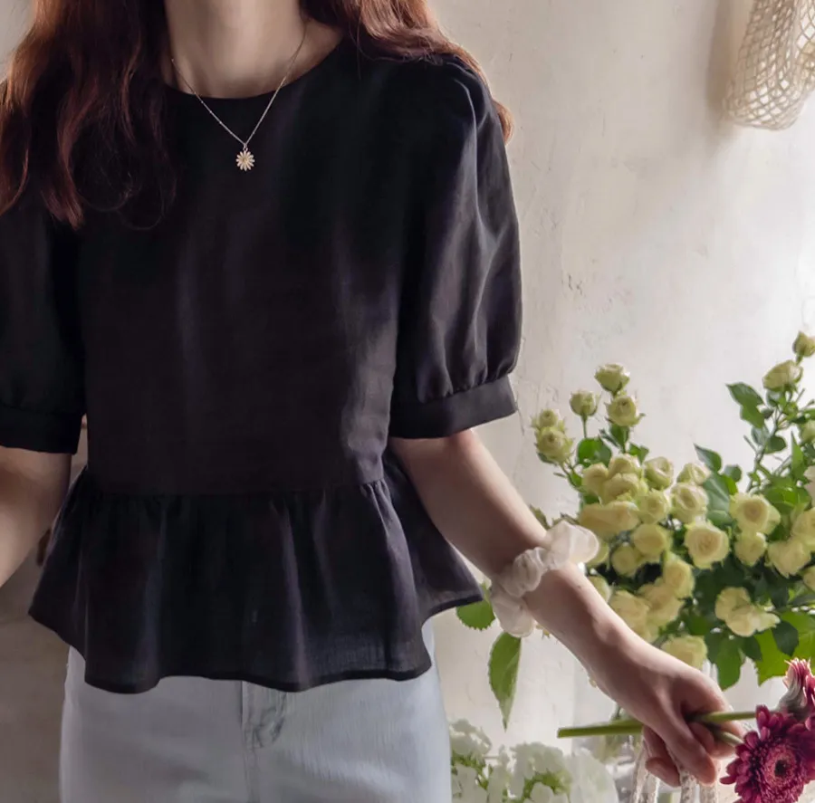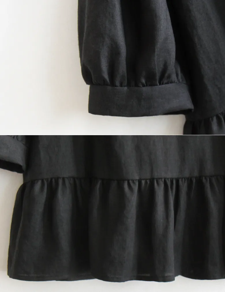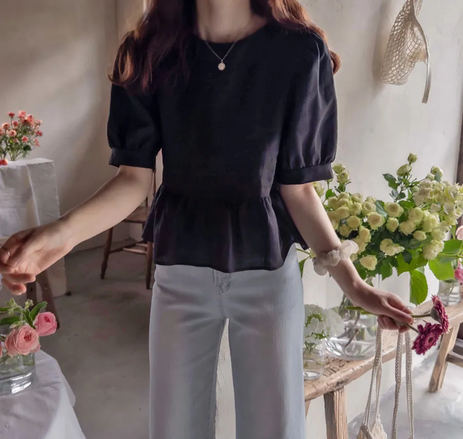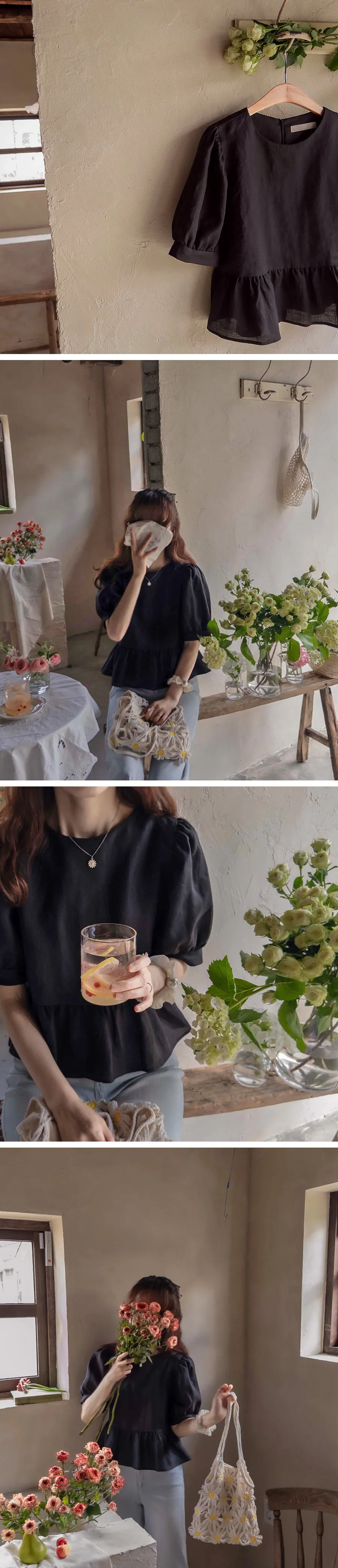 優雅可愛下擺傘擺剪裁泡泡袖亞麻上衣