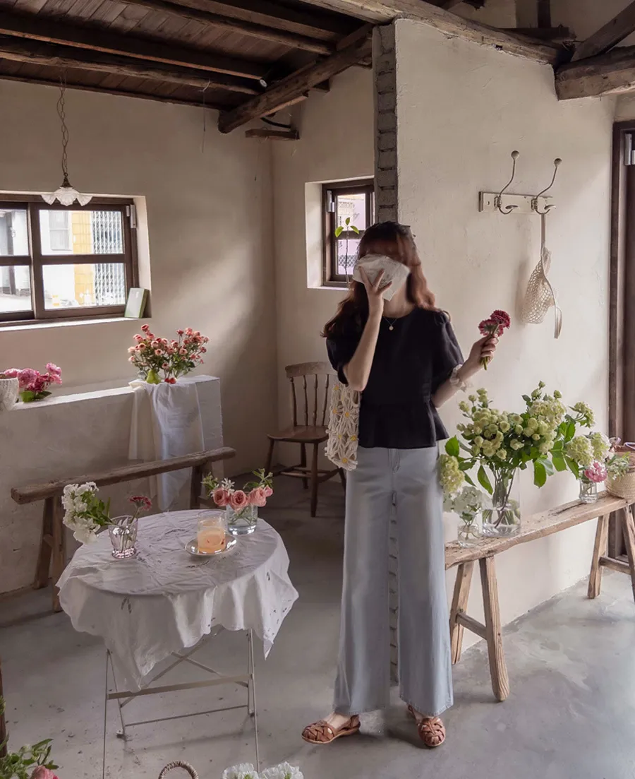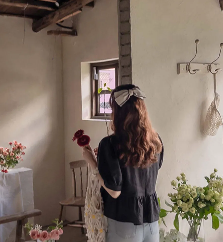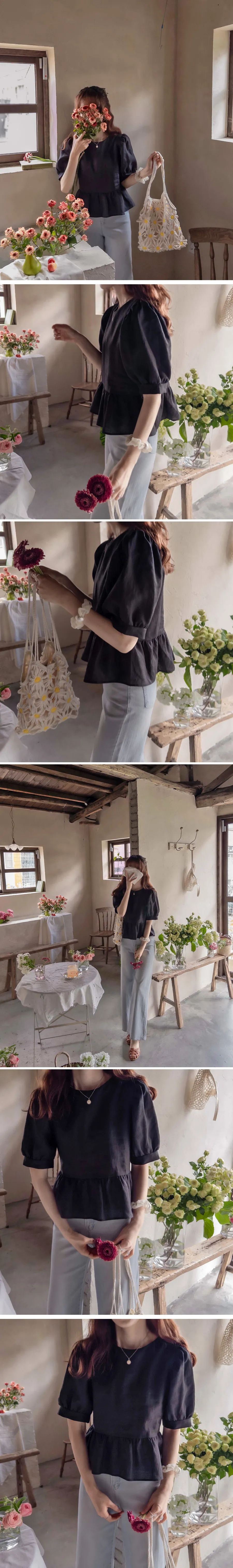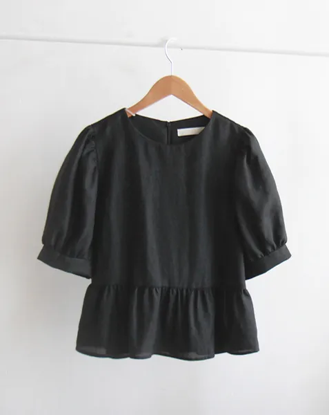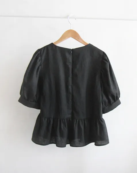 優雅可愛下擺傘擺剪裁泡泡袖亞麻上衣