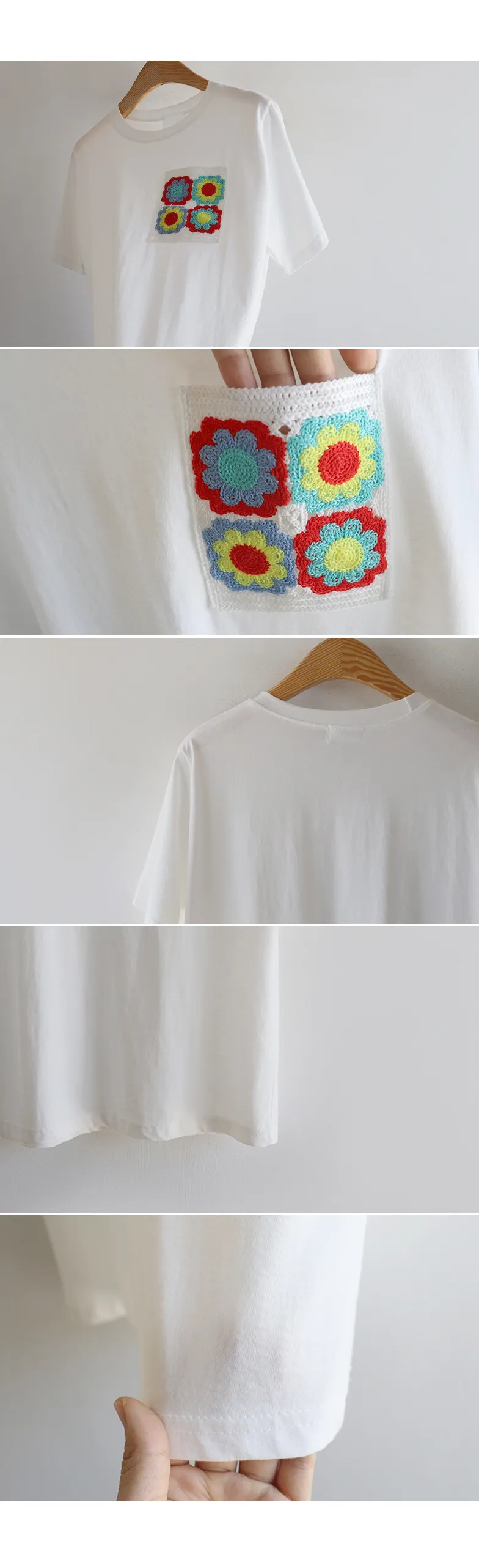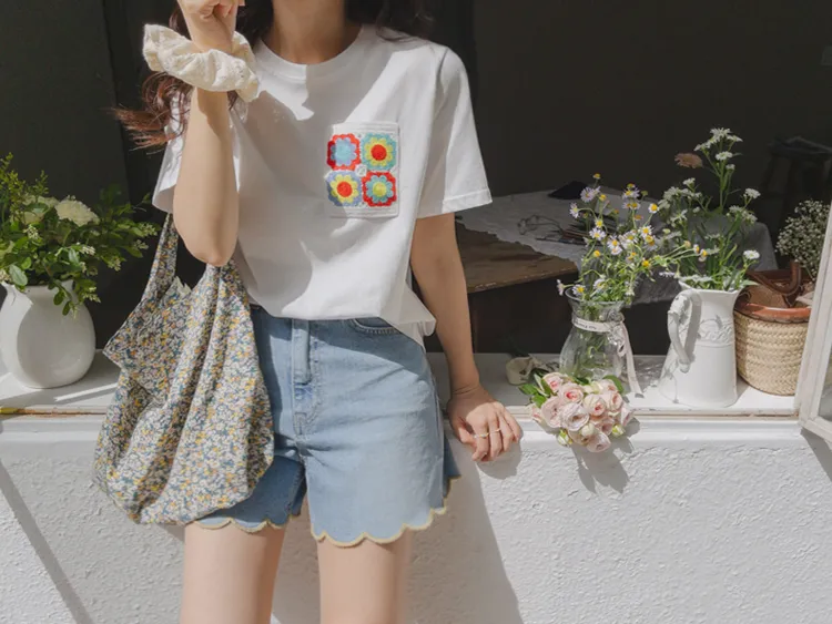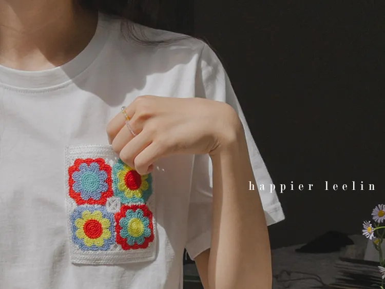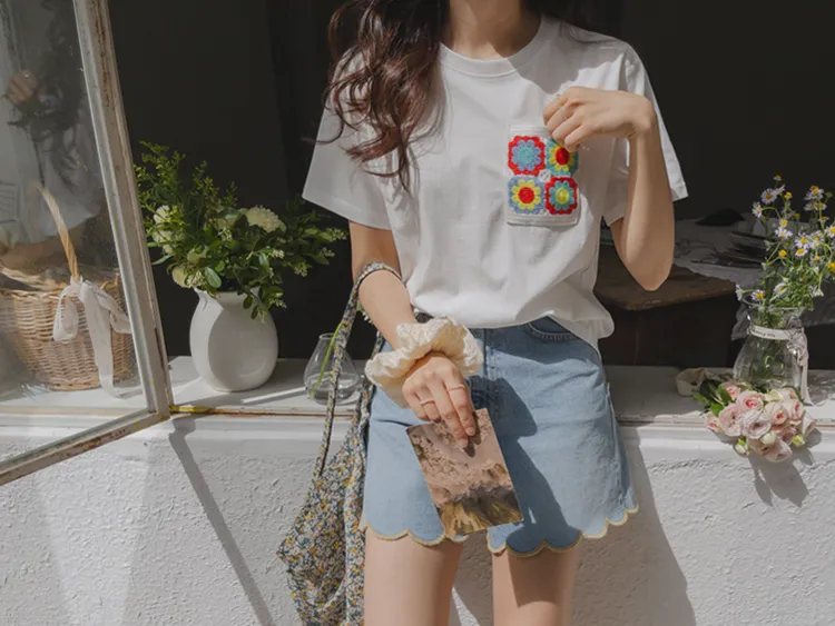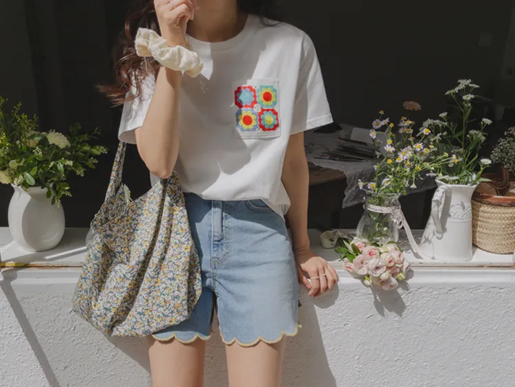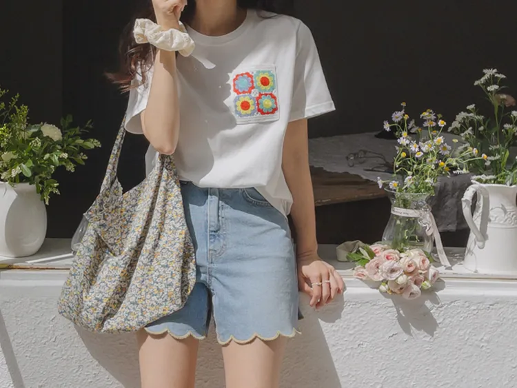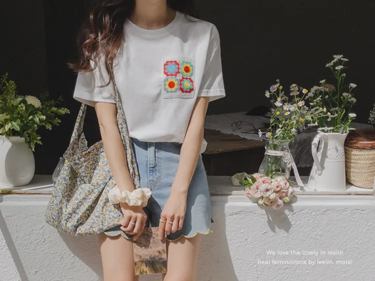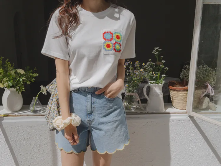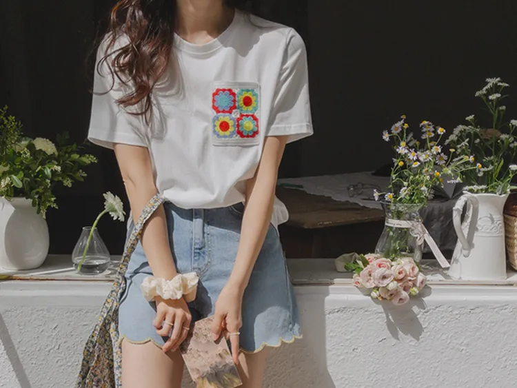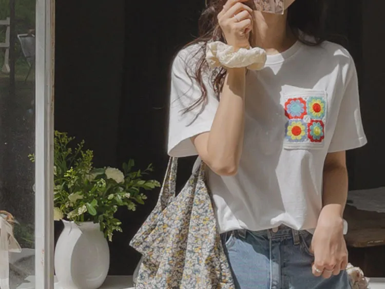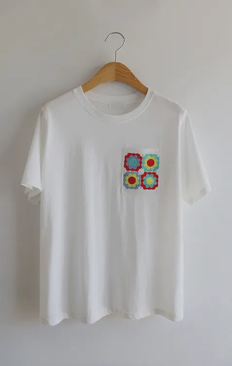 【花朵針織口袋上衣♥】【品質真好,30支棉生物洗水~】【短袖T卹,到處搭配都很棒】【穿著舒適柔軟】
