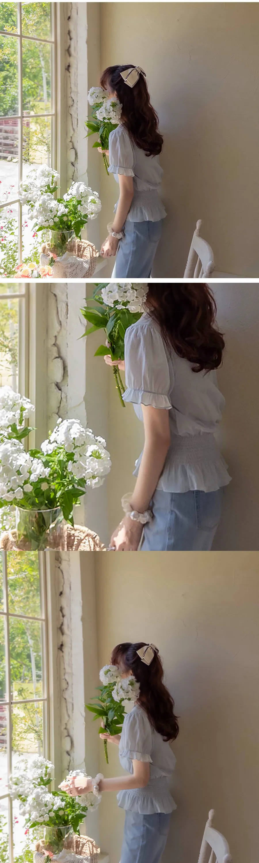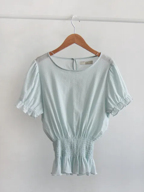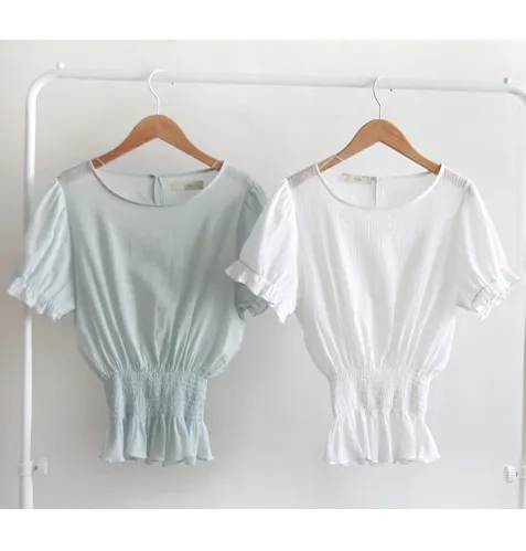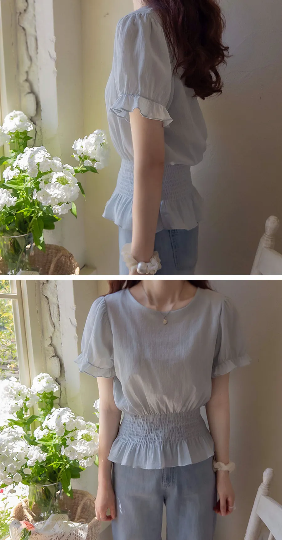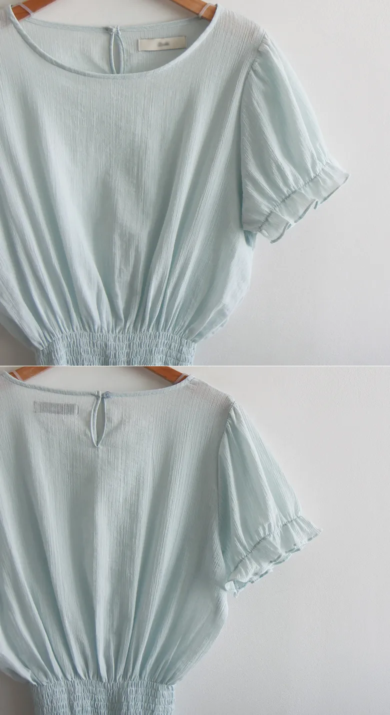 【袖子: 鑲邊】【腰部採用彈性皺摺鑲邊處理】【袖子也採用鑲邊剪裁充滿可愛魅力】【夏季面料,帶有微妙的皺紋感覺] [從現在到夏天都很好] [作為明亮優雅的單品]