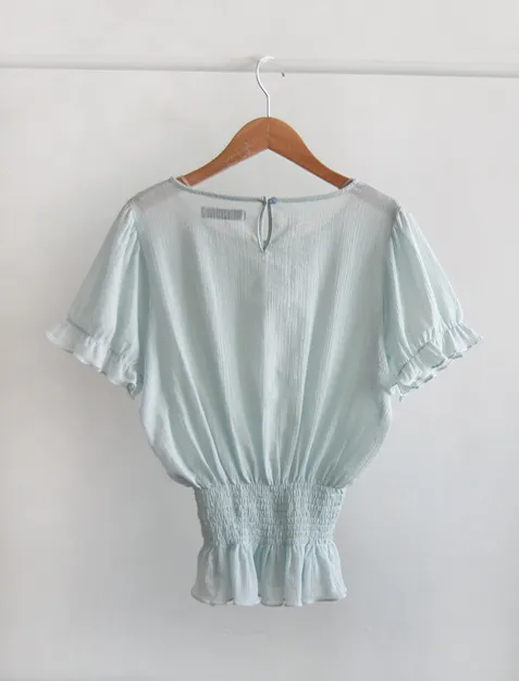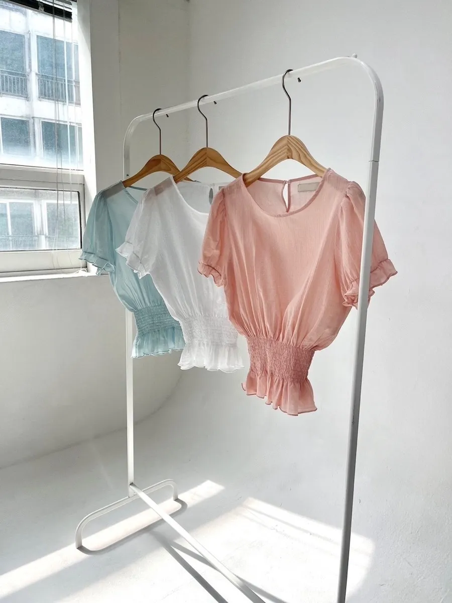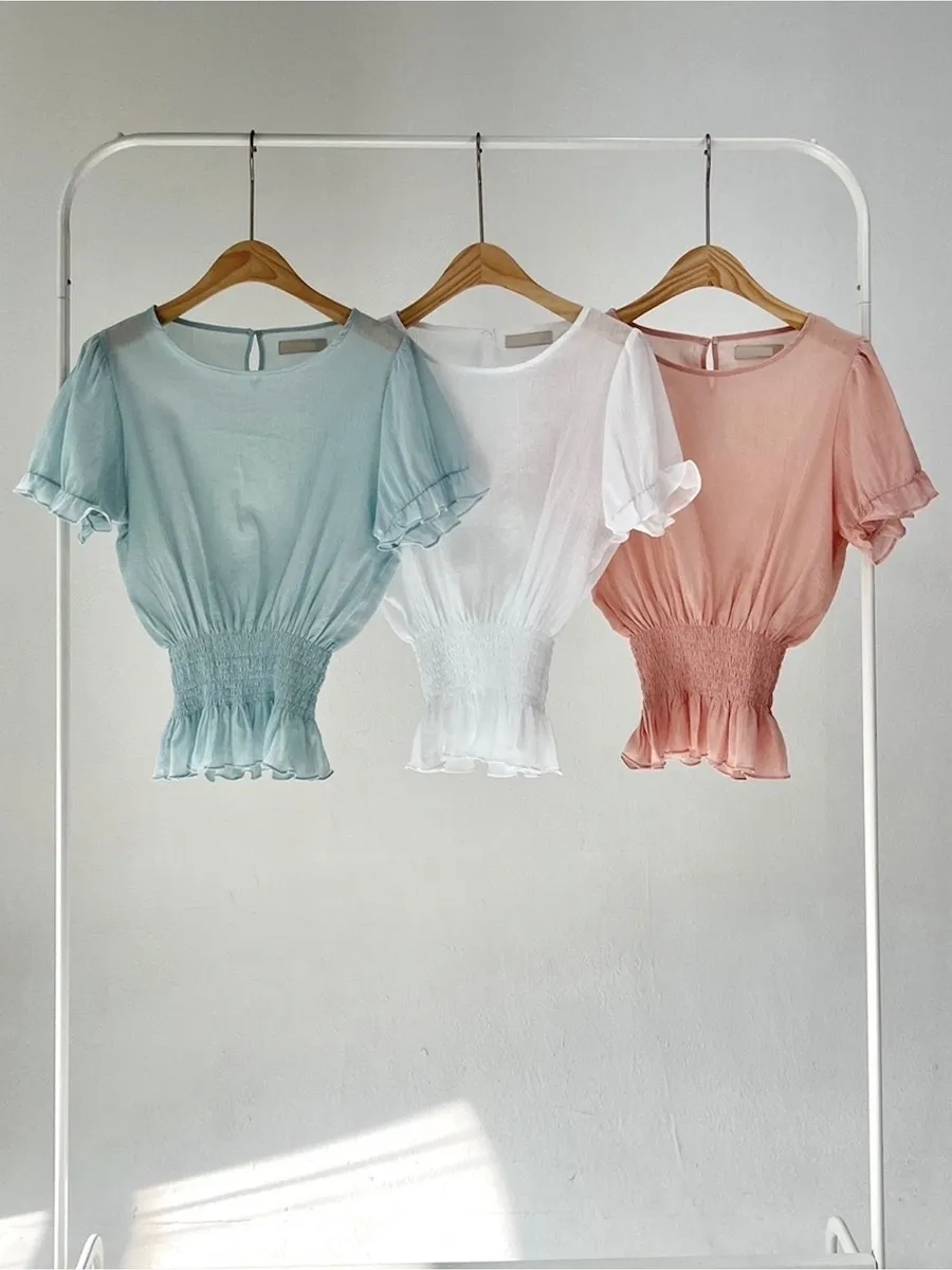 優雅腰部皺褶彈性袖口束邊雪紡上衣