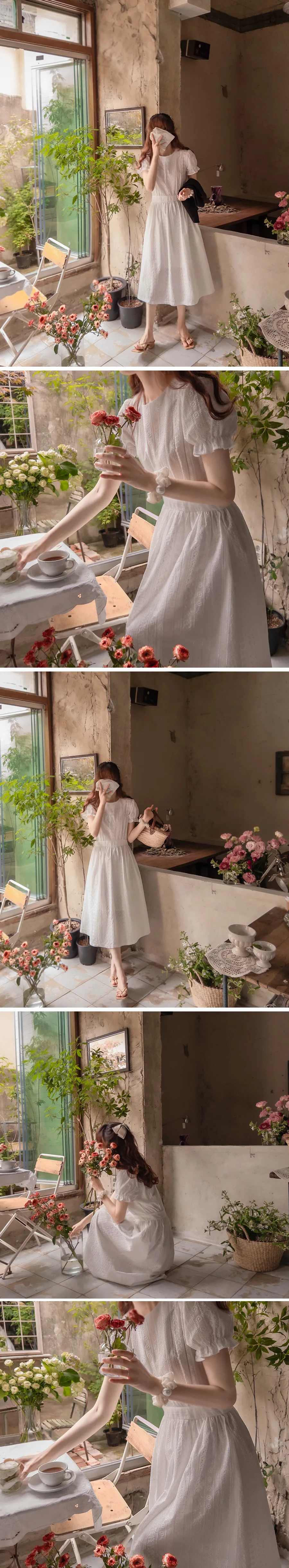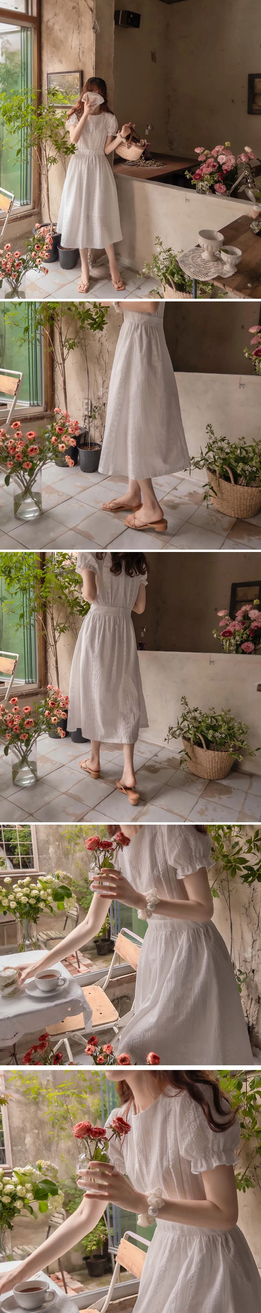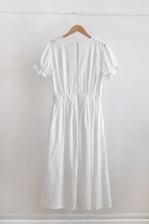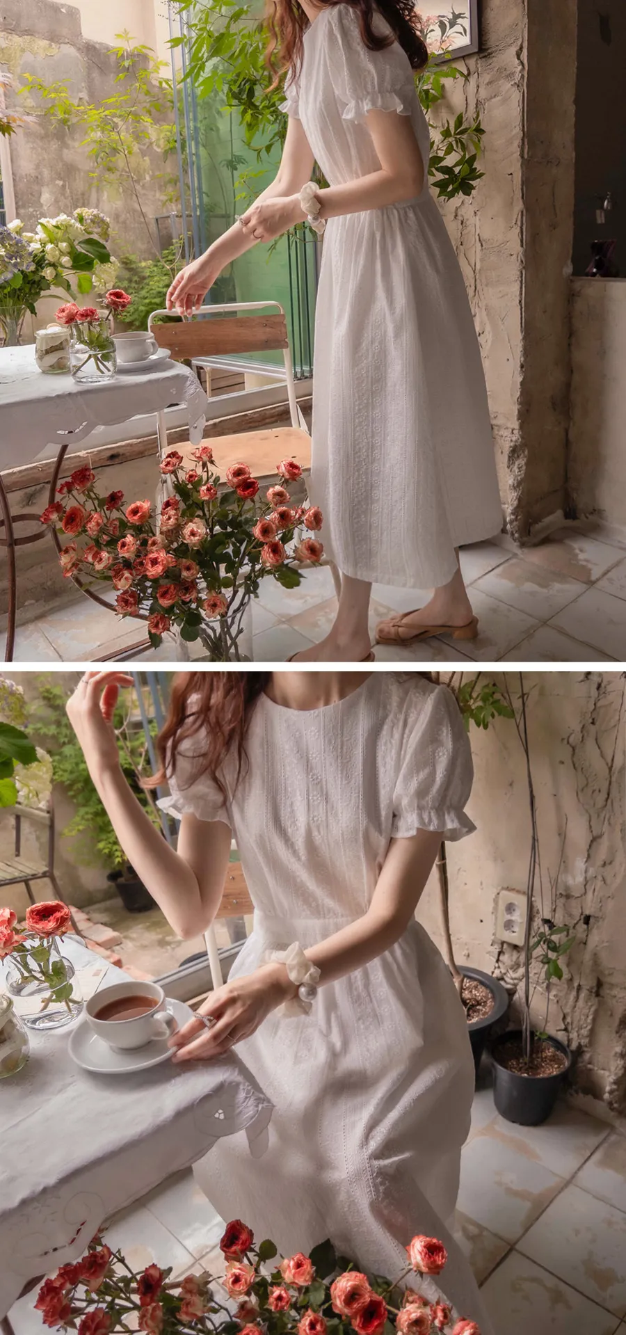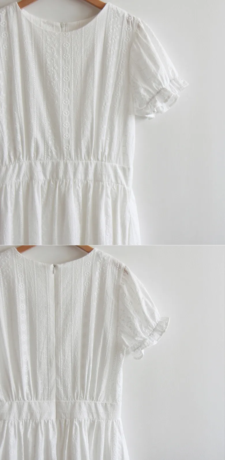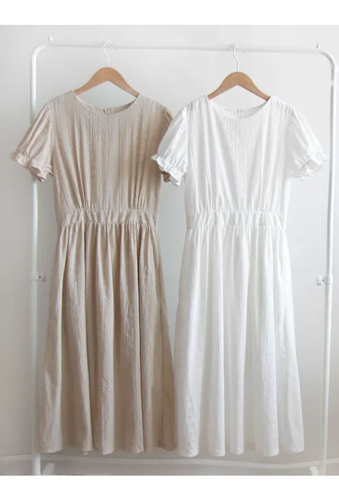 優雅蕾絲花朵刺繡泡泡袖口束邊連身裙