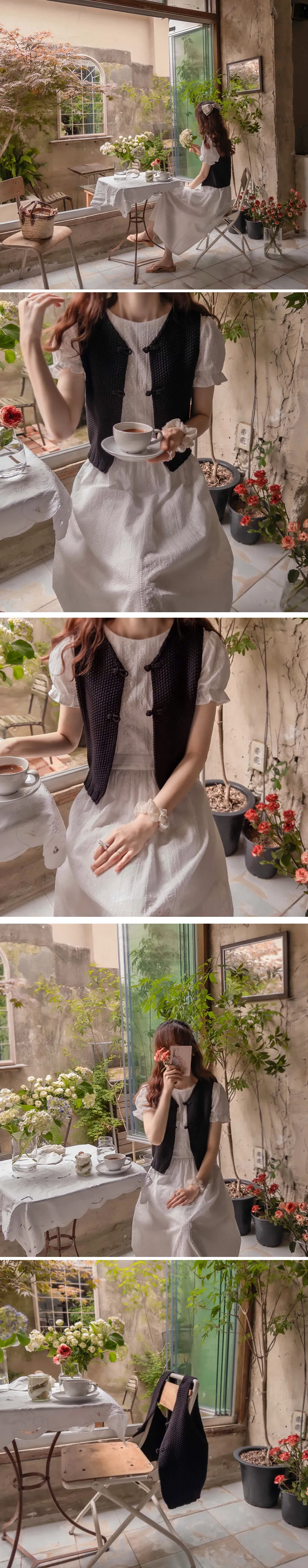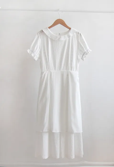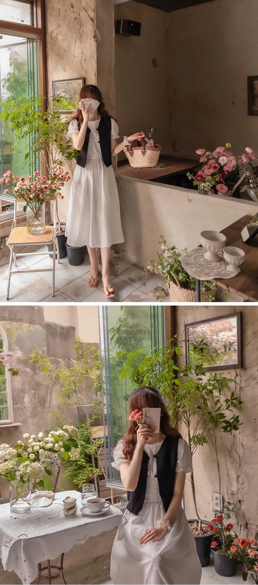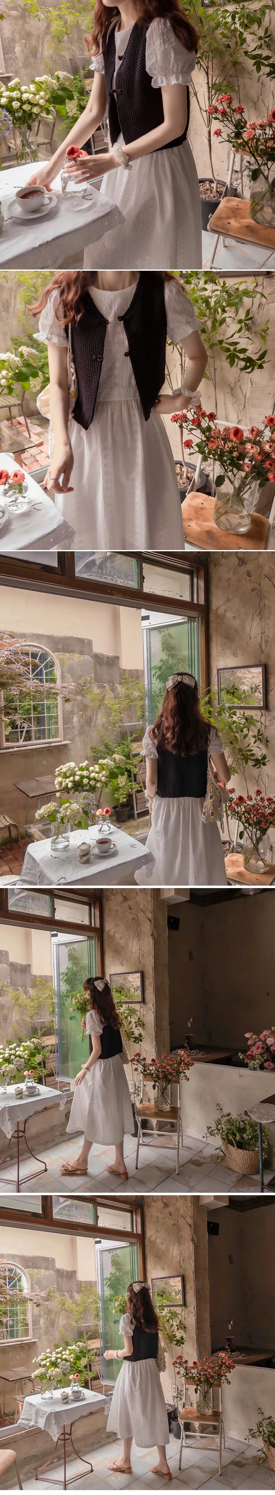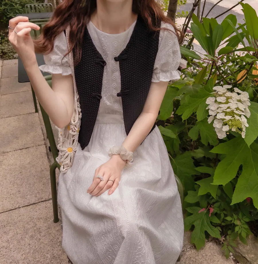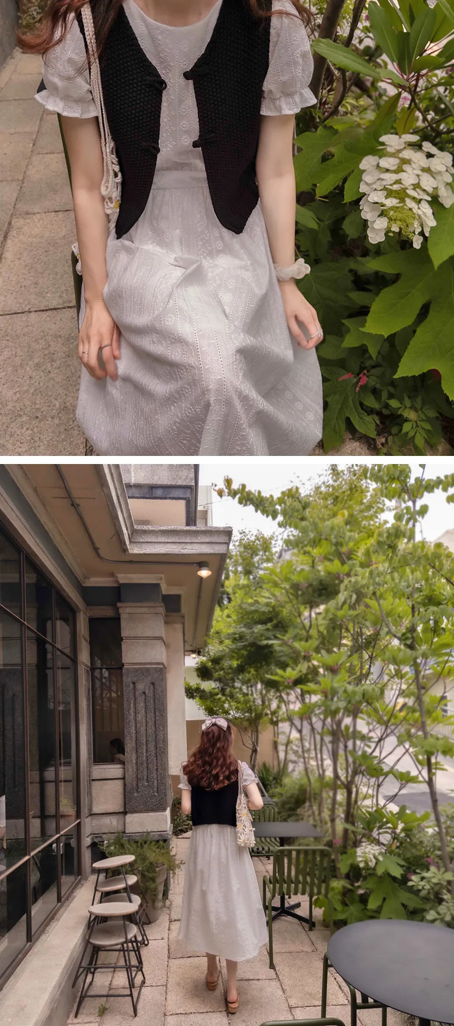 優雅蕾絲花朵刺繡泡泡袖口束邊連身裙