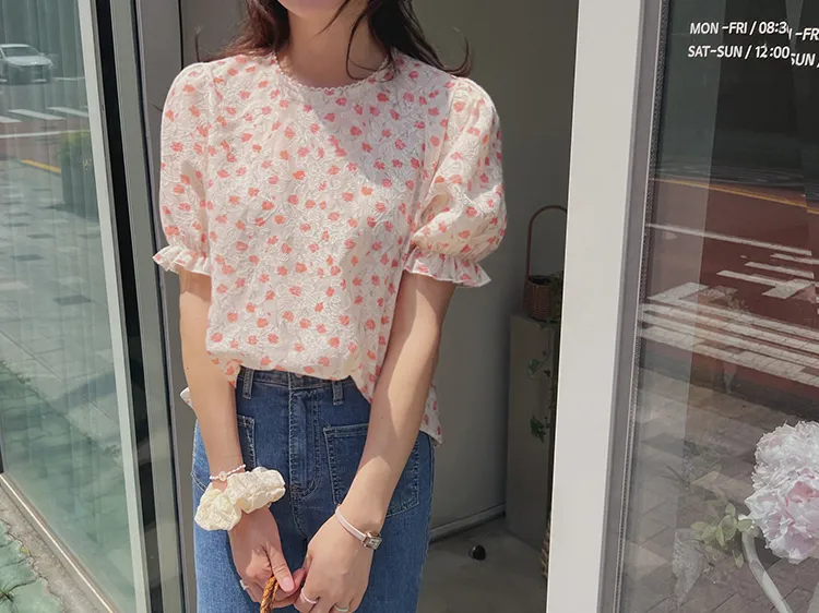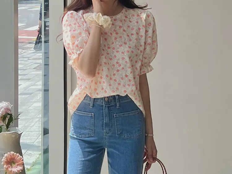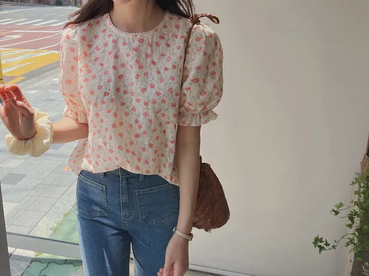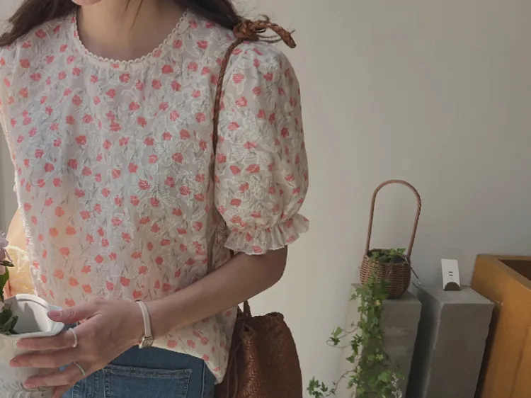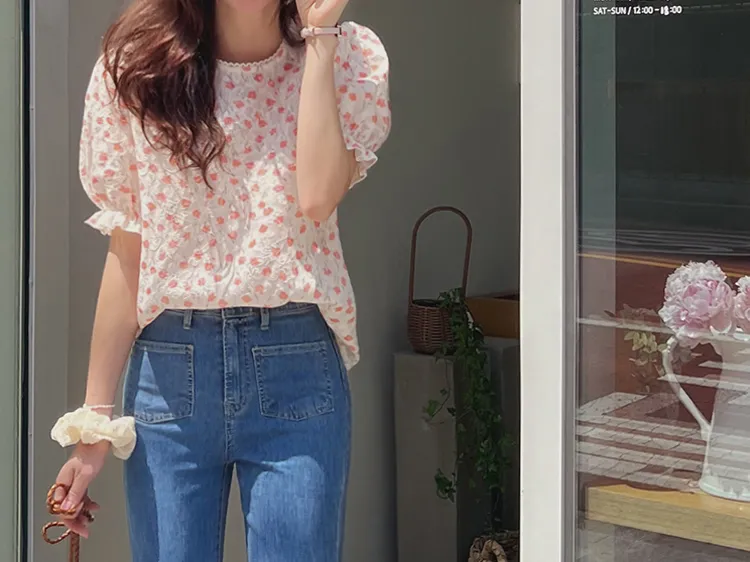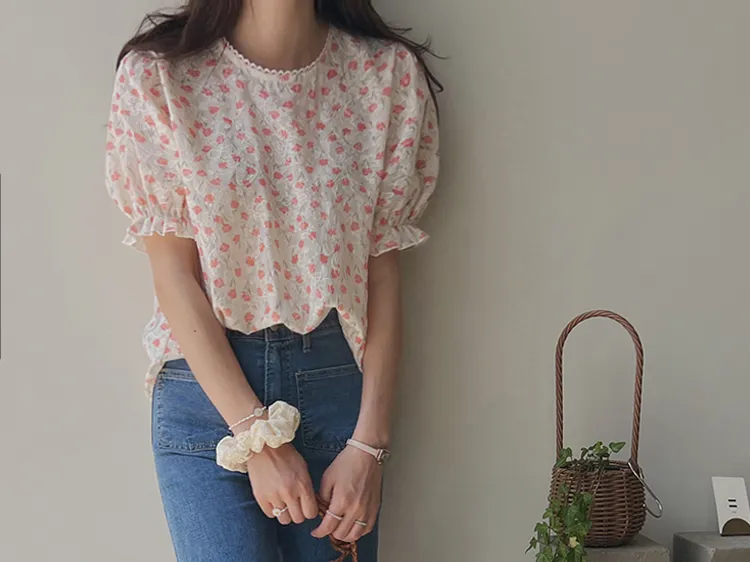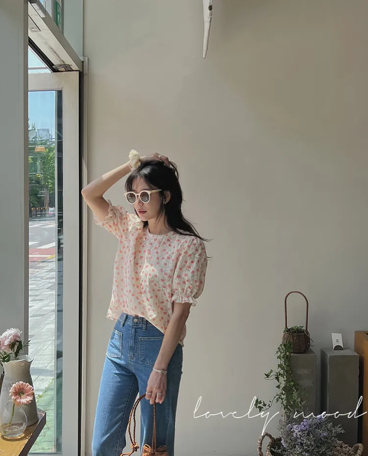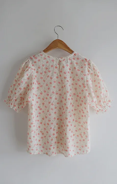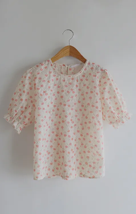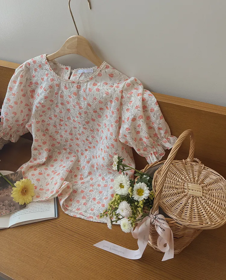 【明亮清新感】【添加花朵刺繡的奢華心情】【可愛的泡泡袖】【不易起皺