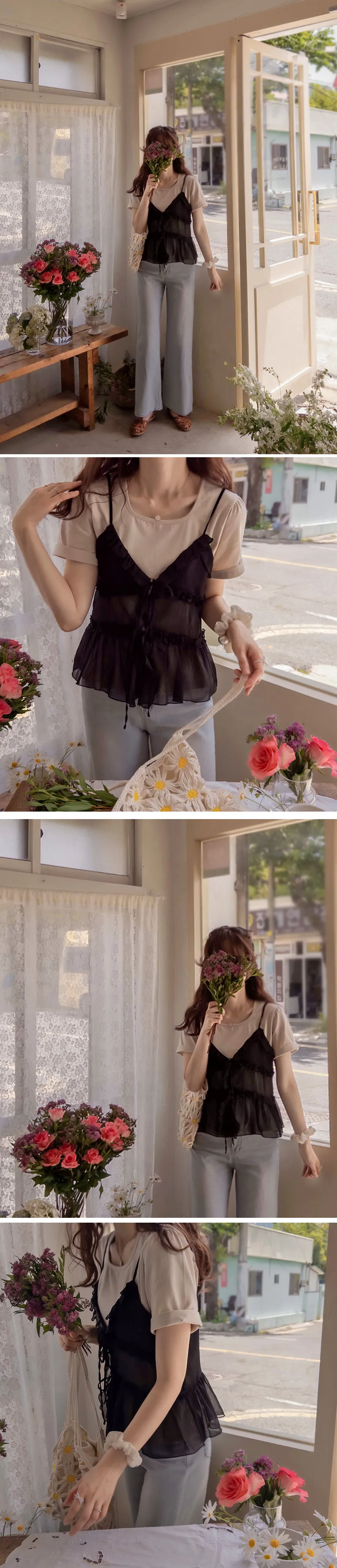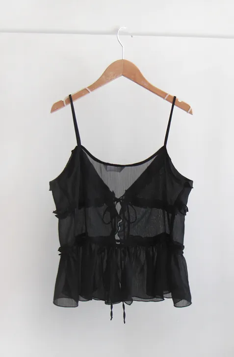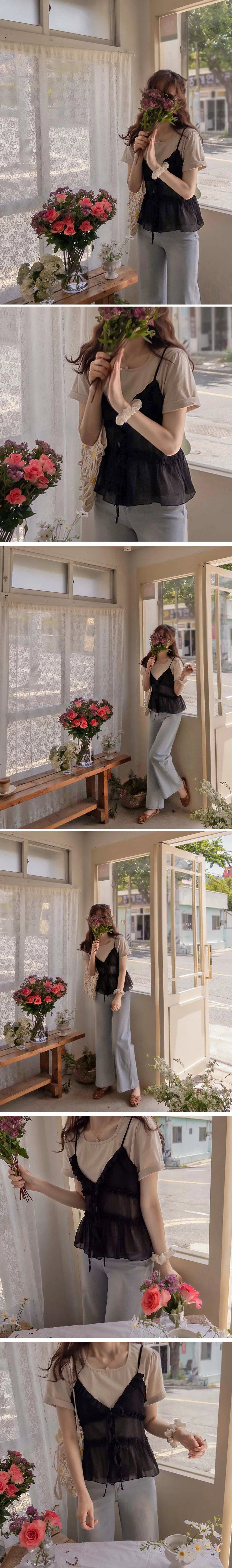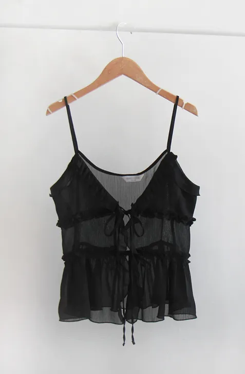 優雅可愛層次摺邊透膚綁帶無袖上衣