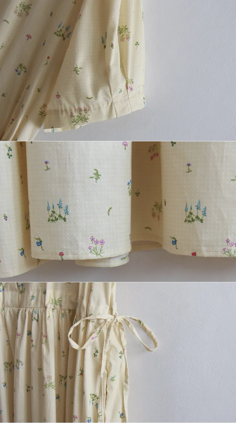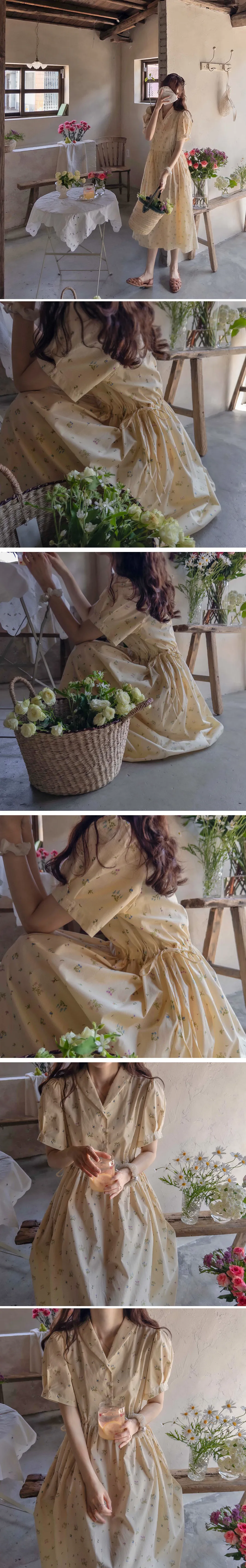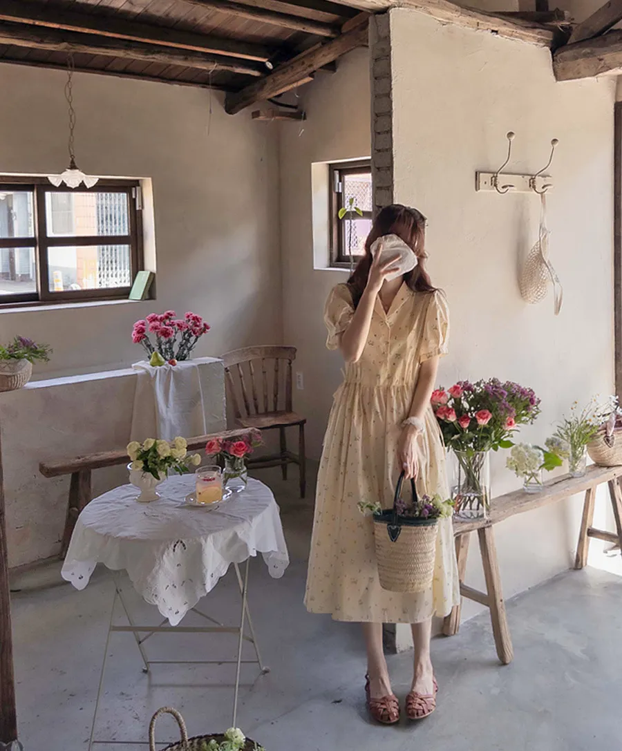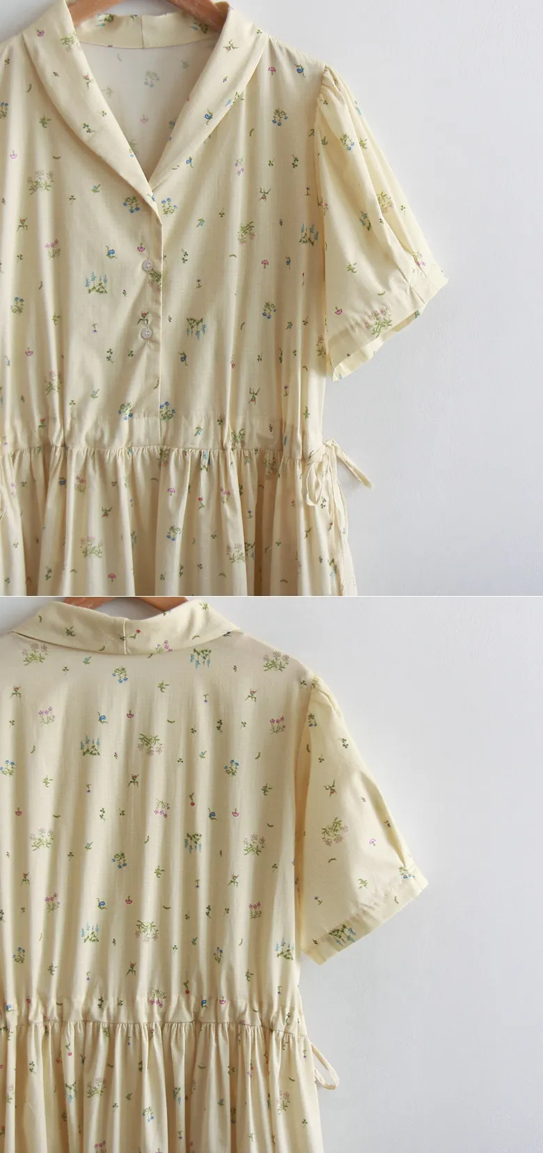 【鈕扣可以打開和關閉】【透過在腰帶上繫帶來調整身型】【帶有針褶的漂亮泡泡袖】【明亮可愛的迷你花朵圖案】【剪裁腰部形成時尚的邊緣貼合]【推薦這款漂亮的夏季花朵連身裙】