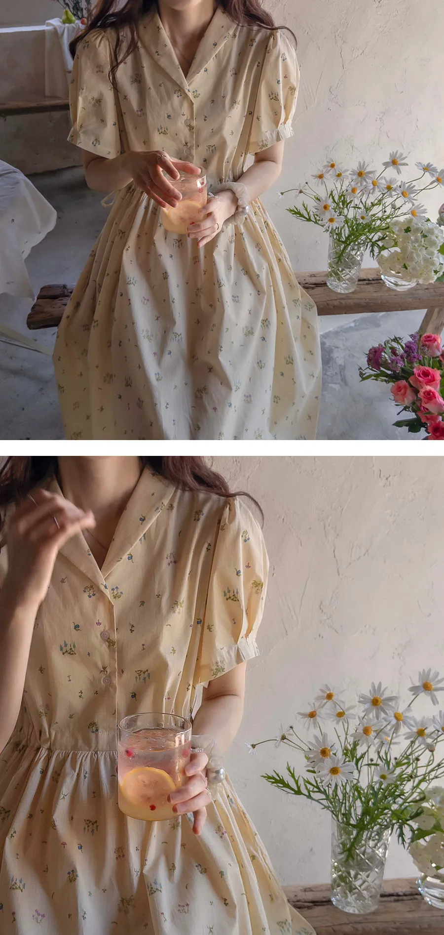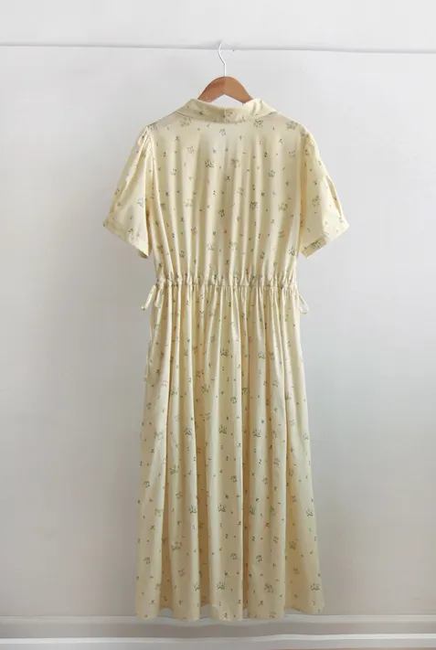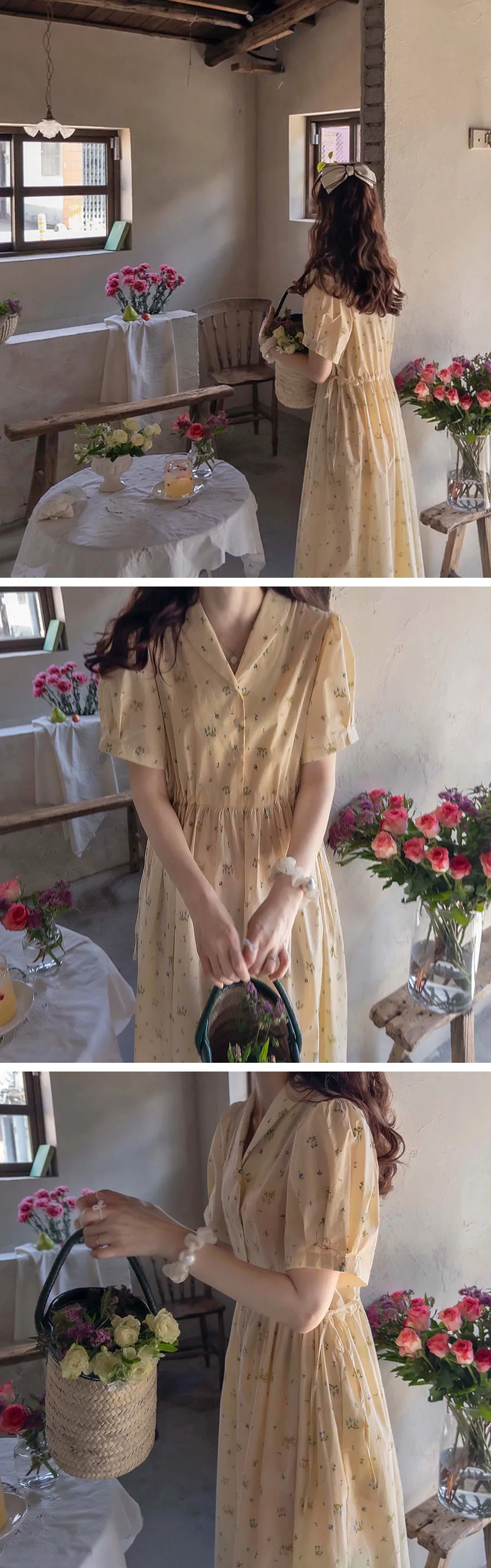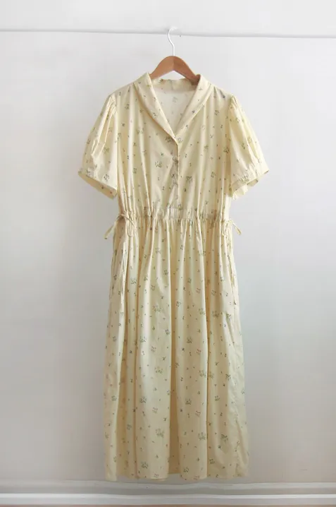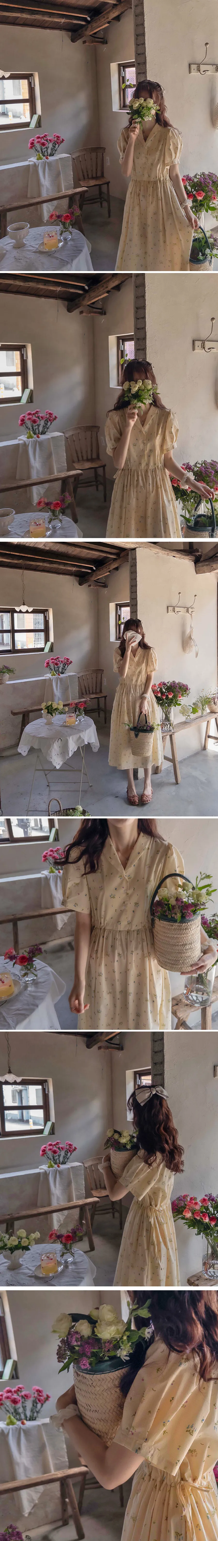 【鈕扣可以打開和關閉】【透過在腰帶上繫帶來調整身型】【帶有針褶的漂亮泡泡袖】【明亮可愛的迷你花朵圖案】【剪裁腰部形成時尚的邊緣貼合]【推薦這款漂亮的夏季花朵連身裙】
