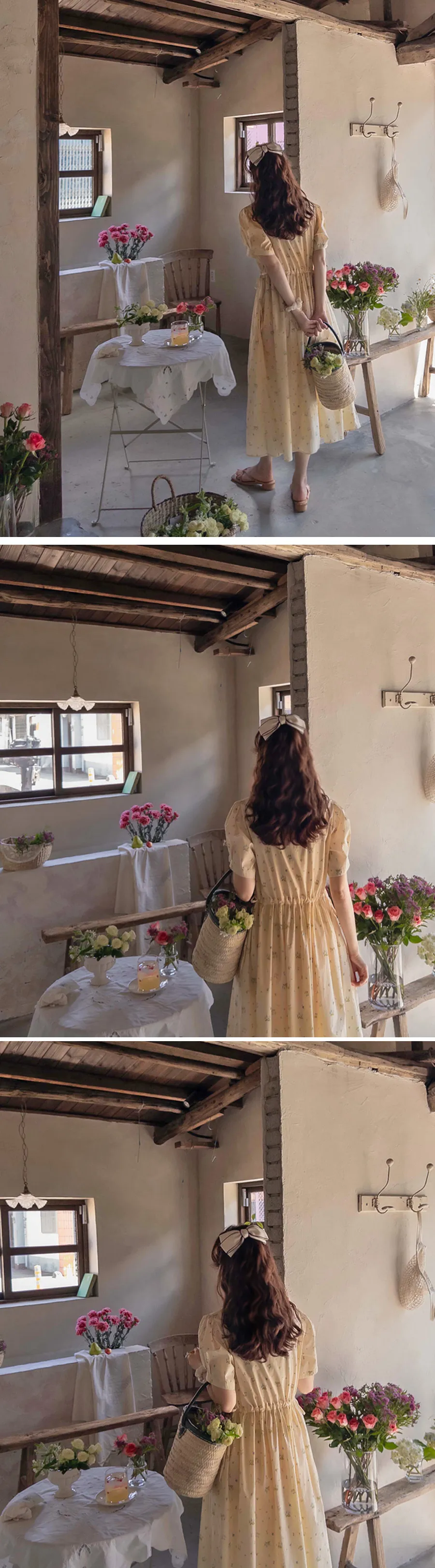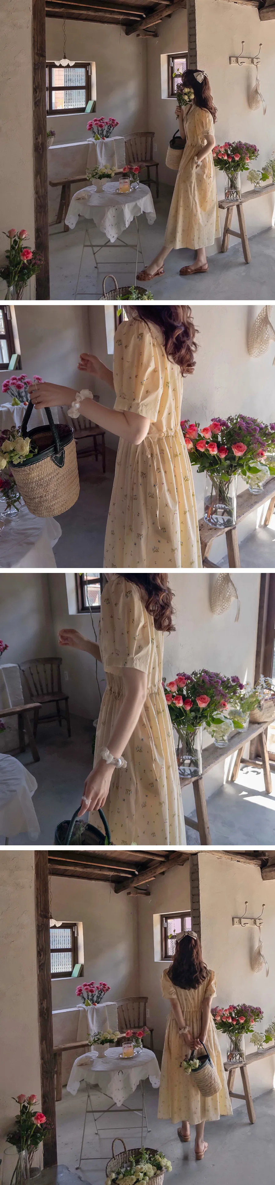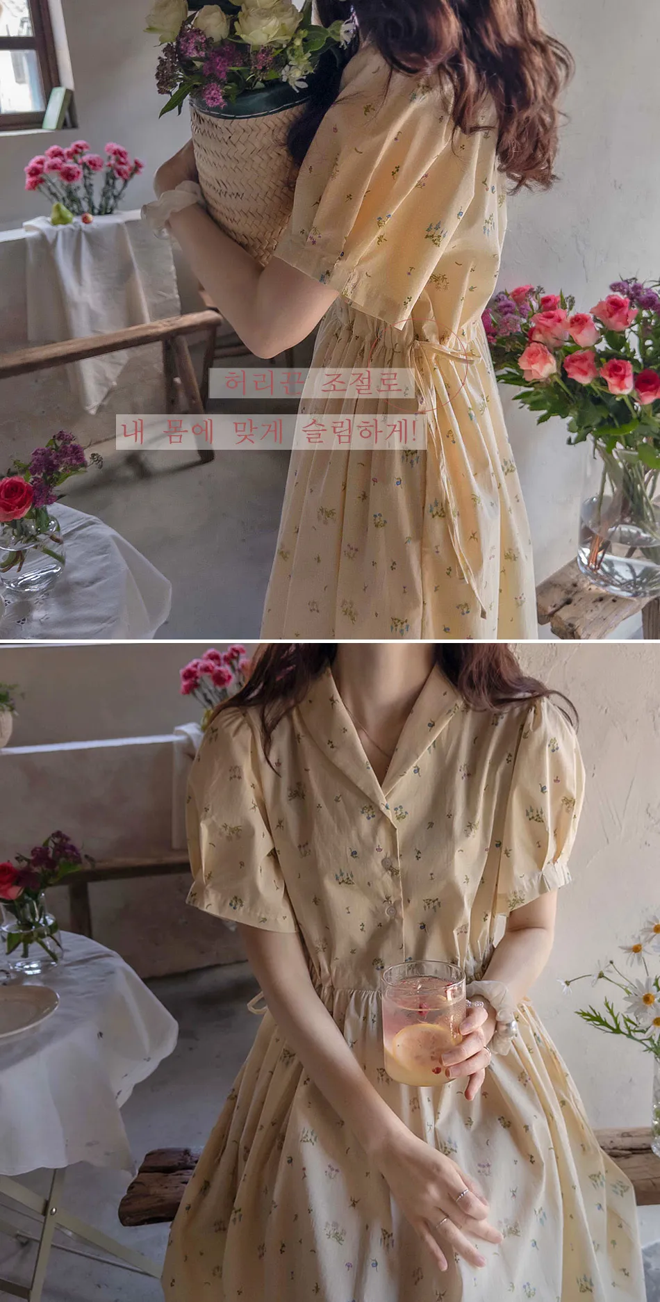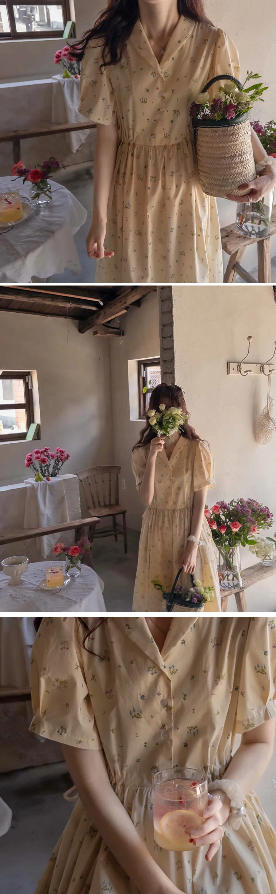 【鈕扣可以打開和關閉】【透過在腰帶上繫帶來調整身型】【帶有針褶的漂亮泡泡袖】【明亮可愛的迷你花朵圖案】【剪裁腰部形成時尚的邊緣貼合]【推薦這款漂亮的夏季花朵連身裙】