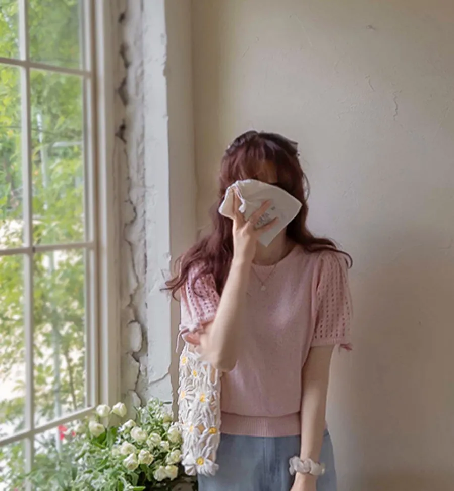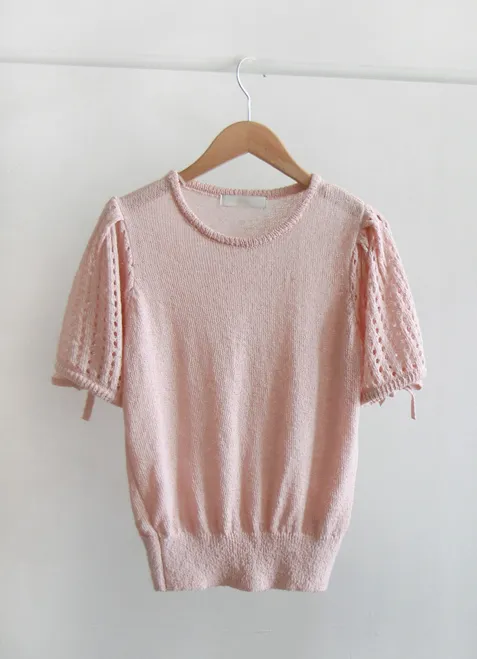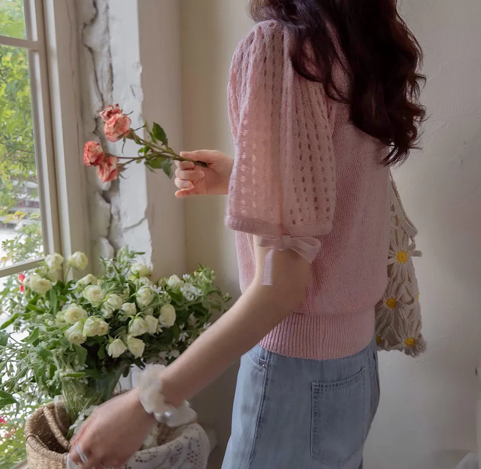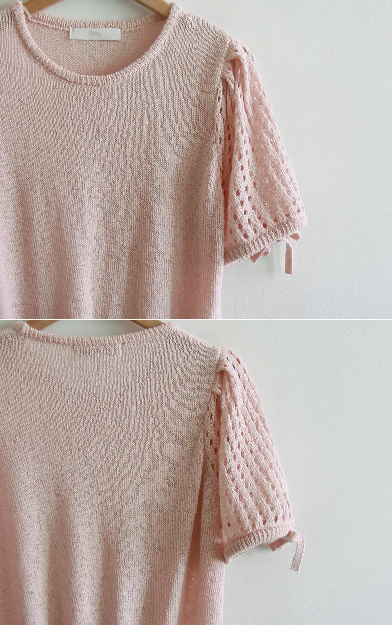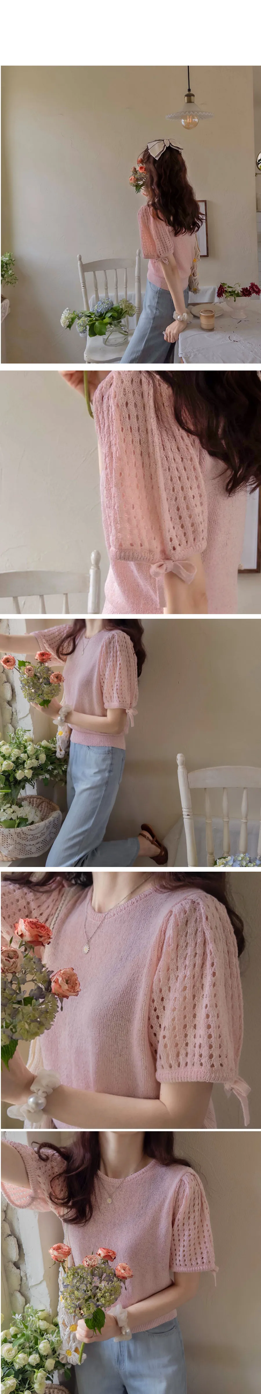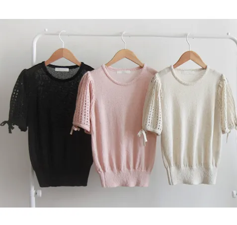優雅可愛鏤空綁帶泡泡袖彈性針織上衣