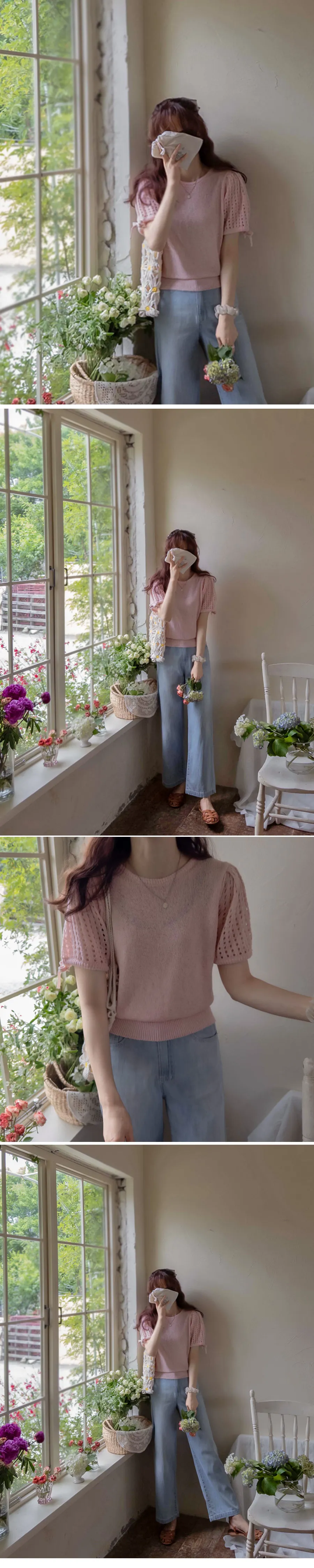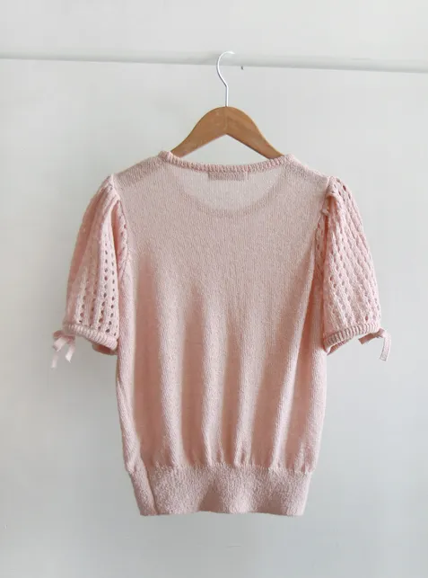 【含亞麻材質,穿著涼爽舒適】【柔軟彈性針織,寬鬆版型】【袖子精緻,有鏤空綁帶設計】【袖子繫上綁帶,營造活潑優雅的心情】【這是一款很棒的針織品,非常適合夏季] [推薦時尚泡泡袖的針織品]