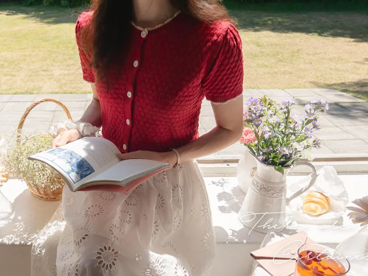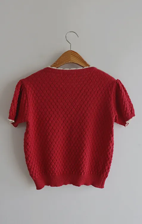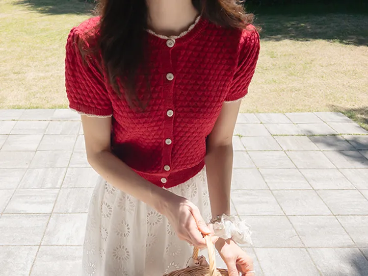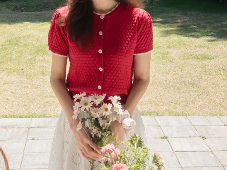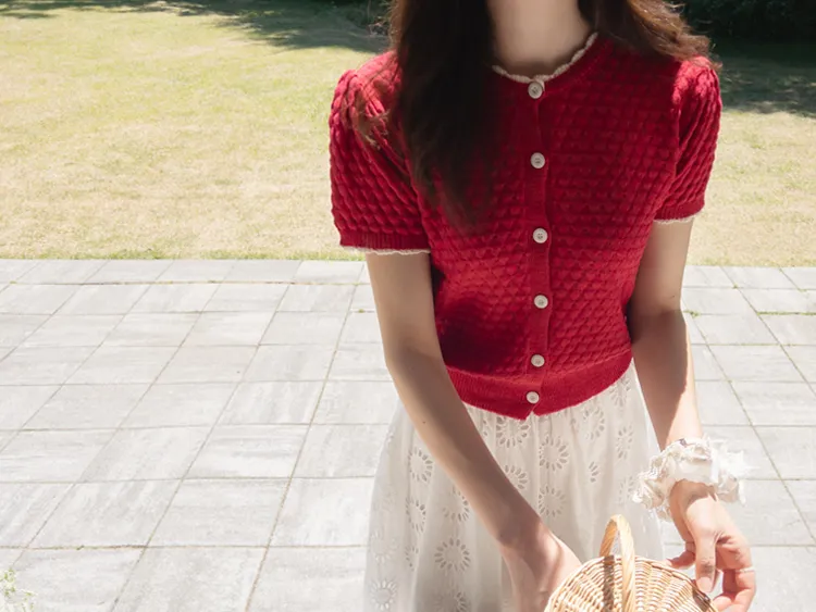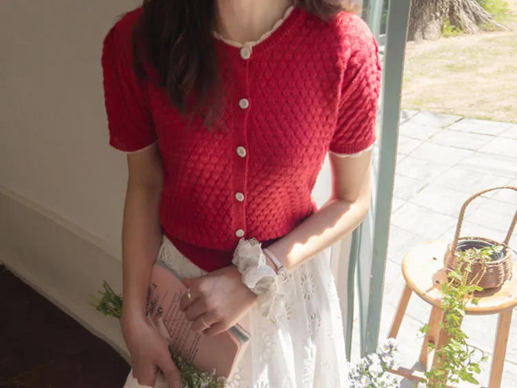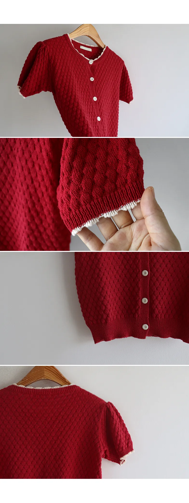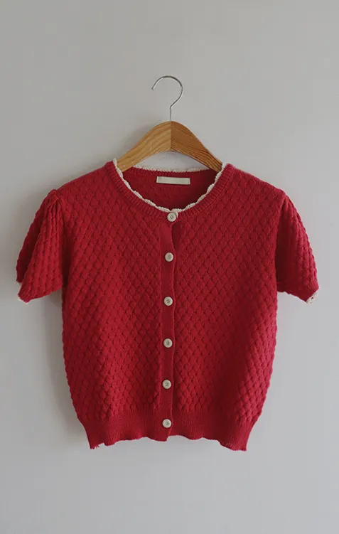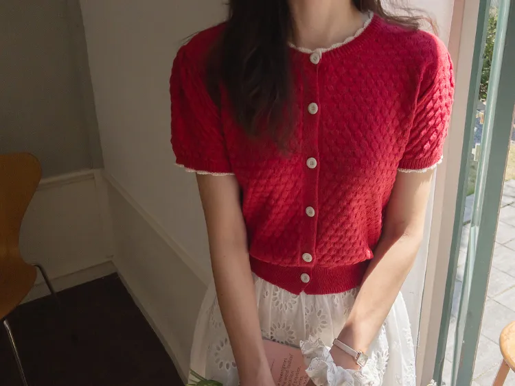 [充滿可愛感的開衫,大膽的編織和配色細節♡][100%棉紗,即使在夏季也很舒適~][頸部和袖子拼色邊細節增加了可愛度! ]