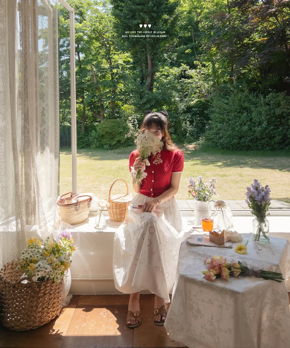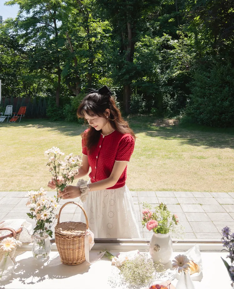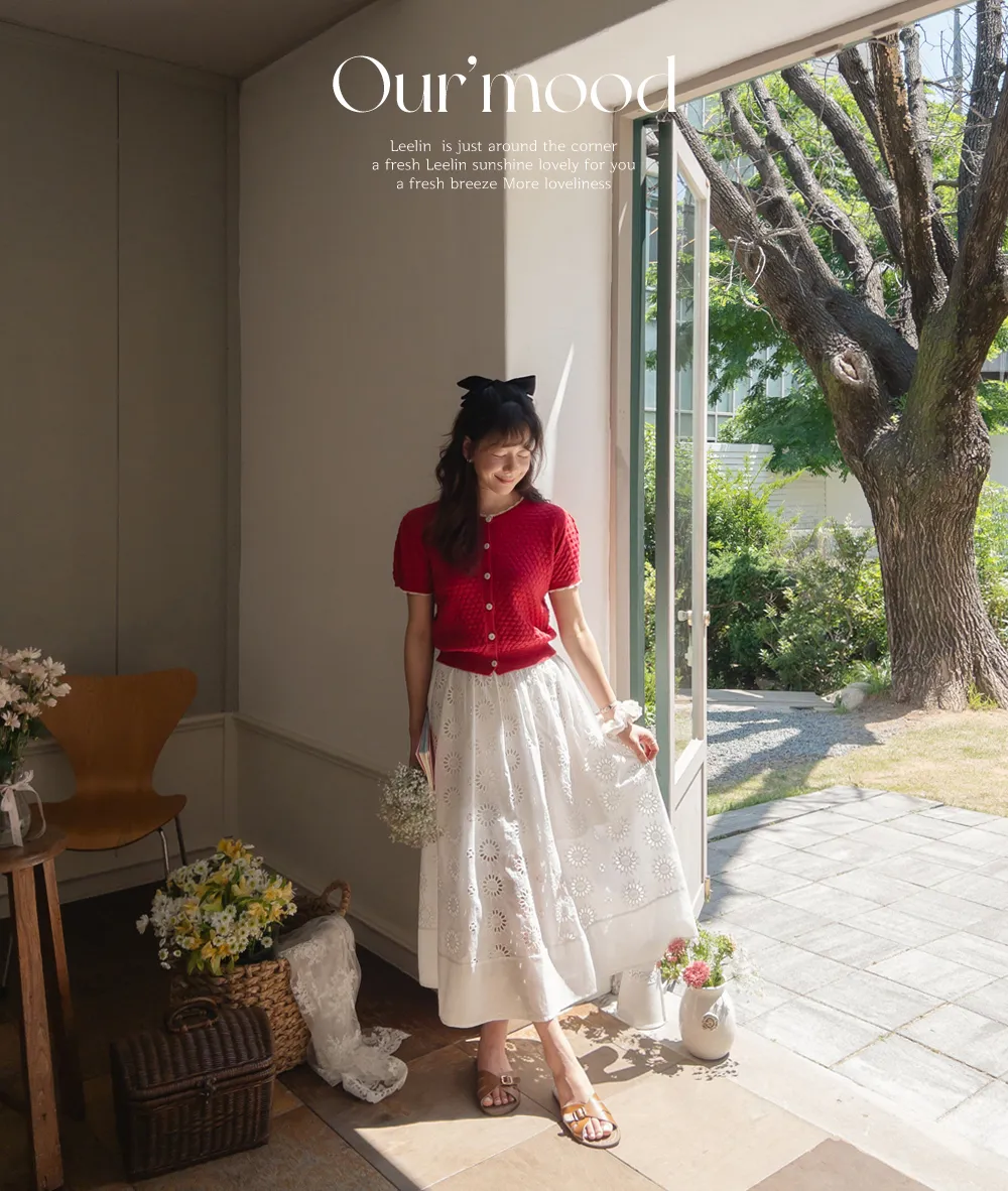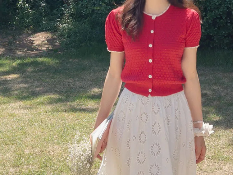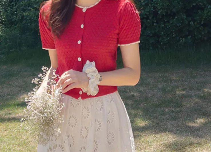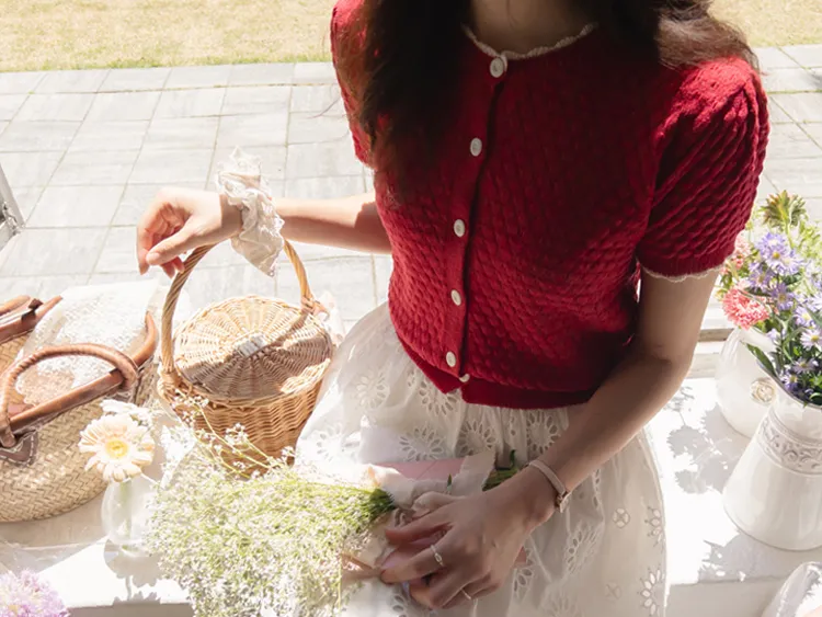 [充滿可愛感的開衫,大膽的編織和配色細節♡][100%棉紗,即使在夏季也很舒適~][頸部和袖子拼色邊細節增加了可愛度! ]