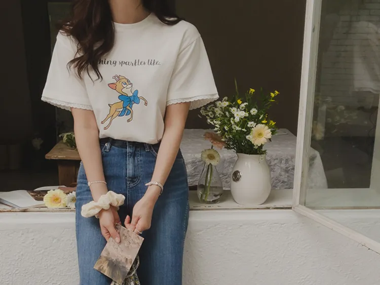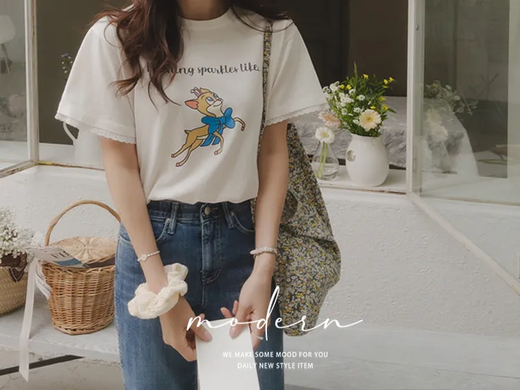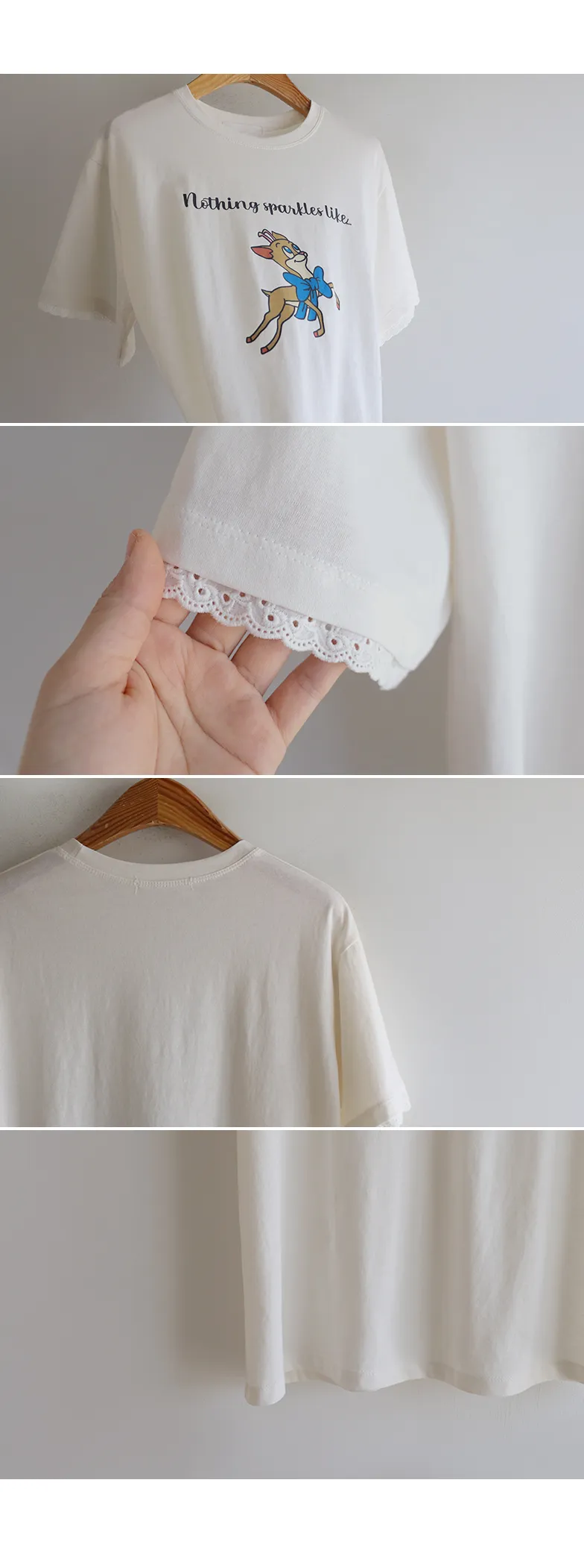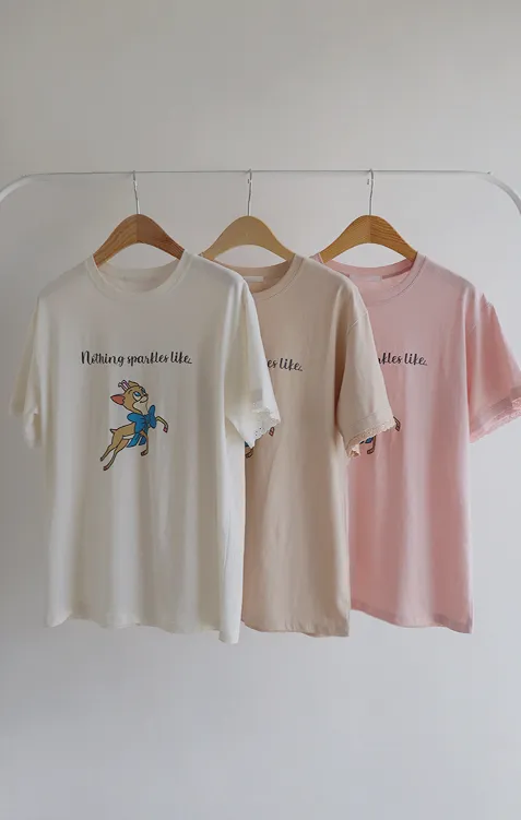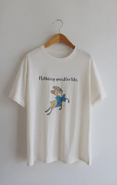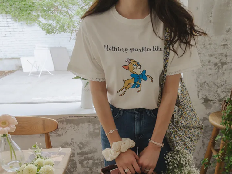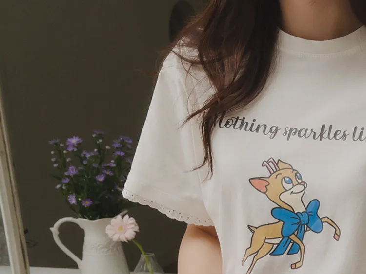 可愛蝴蝶結小鹿印花點綴袖末蕾絲上衣