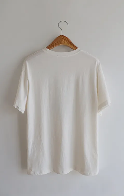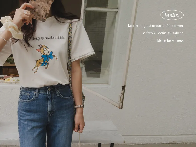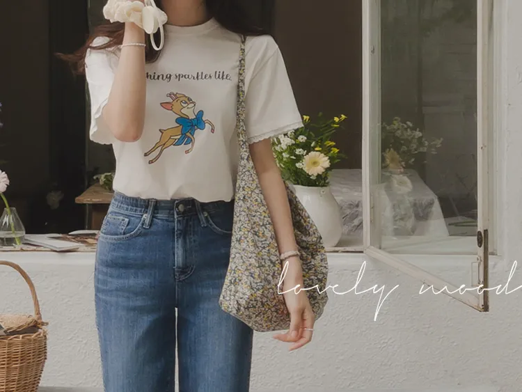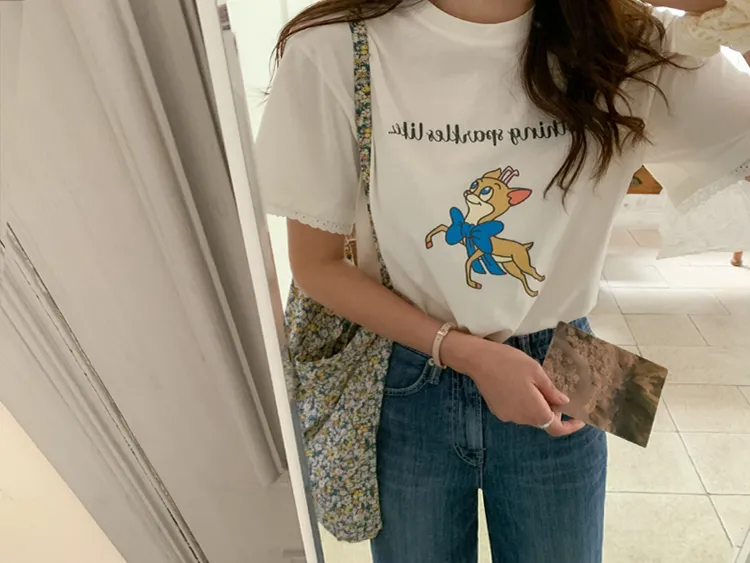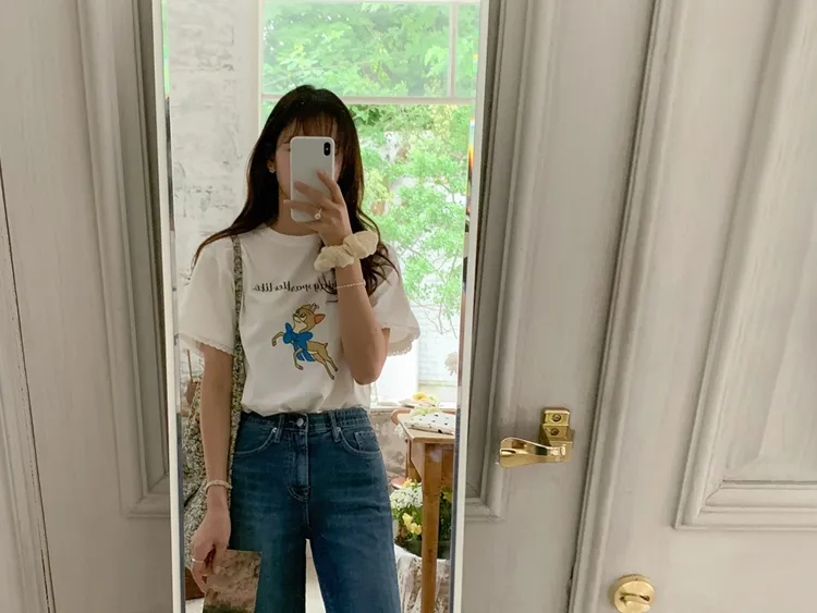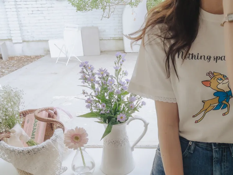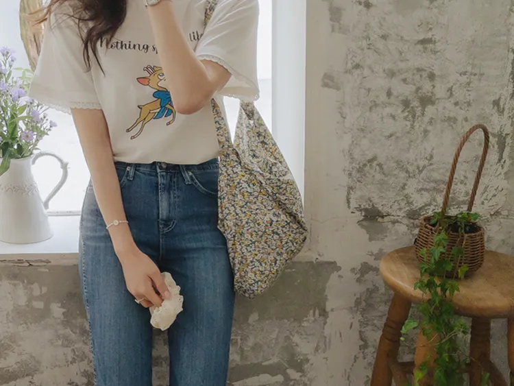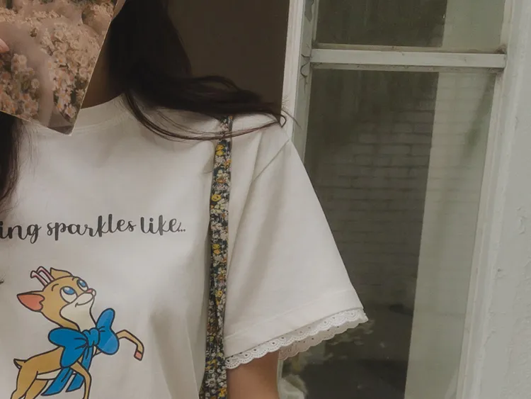 可愛蝴蝶結小鹿印花點綴袖末蕾絲上衣