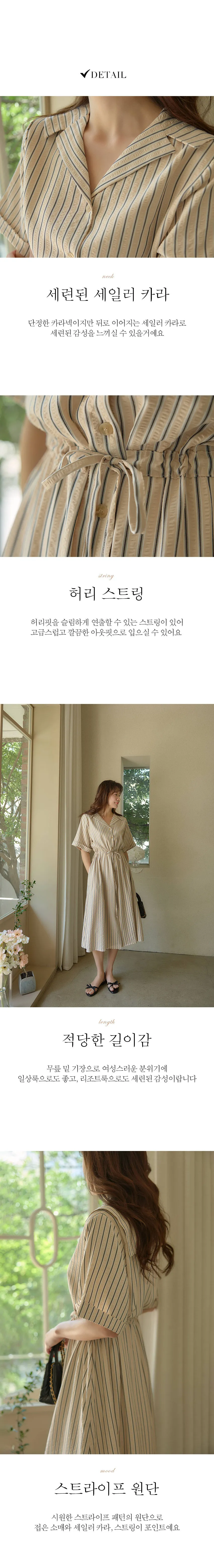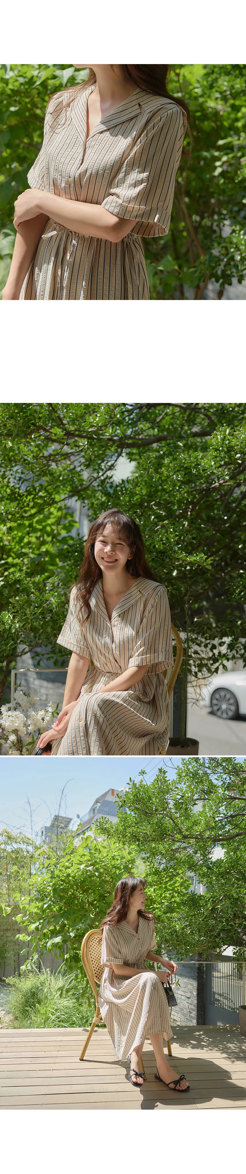 帶有精緻情調的垂直條紋連身裙。 整體條紋的設計, 讓身材看起來更修長。 V領設計讓臉型顯得更瘦,適度寬鬆的版型讓穿著舒適, 寬大的袖子遮住小臂,折疊的袖口設計給人一種乾淨利落的感覺, 微微飄逸的繫帶細節。 可以調整身形!