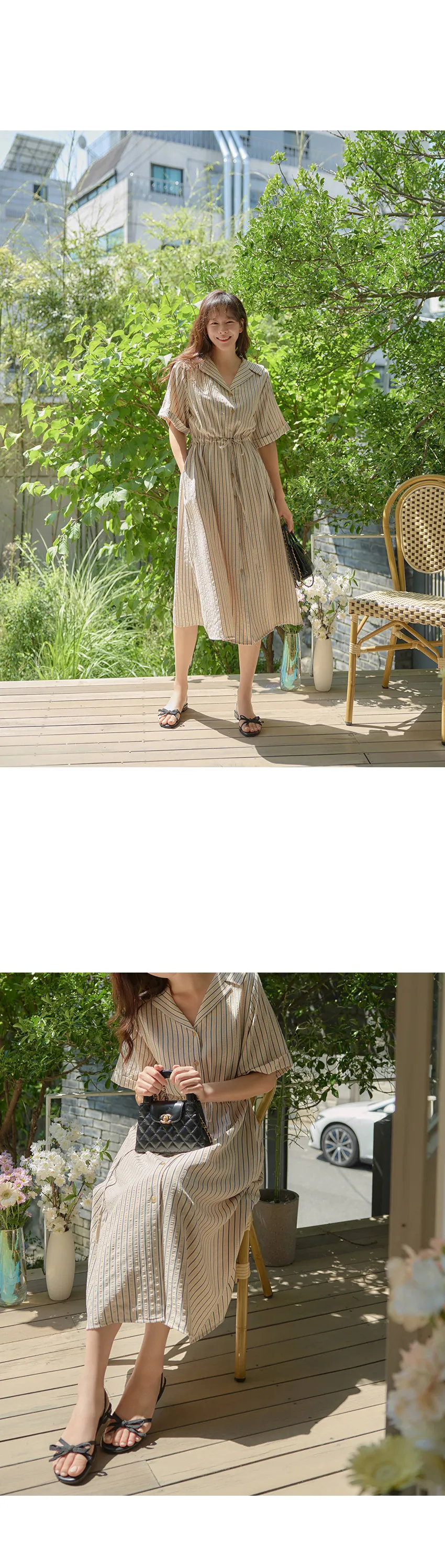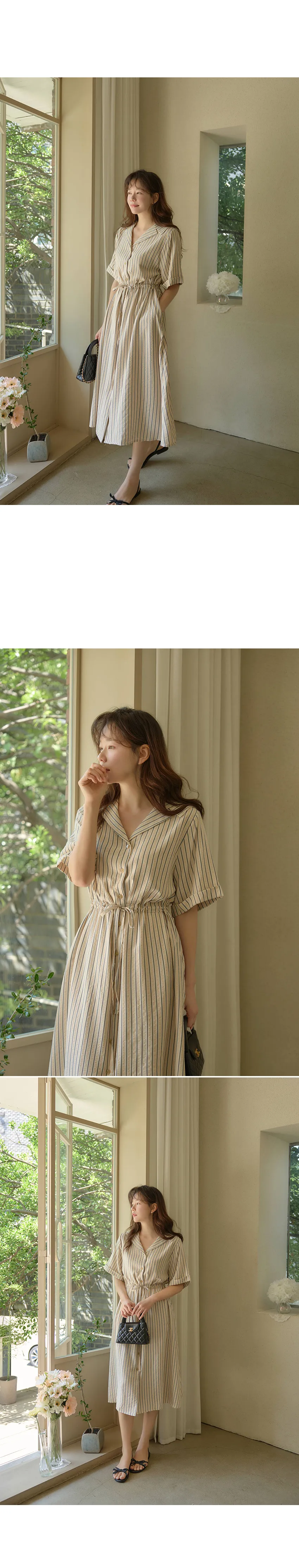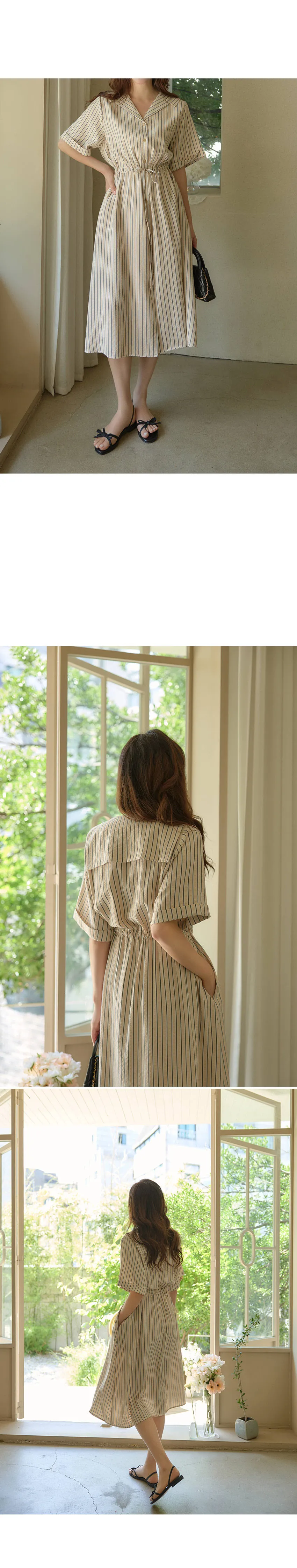精緻情調襯衫式V領排扣腰綁帶條紋連身裙