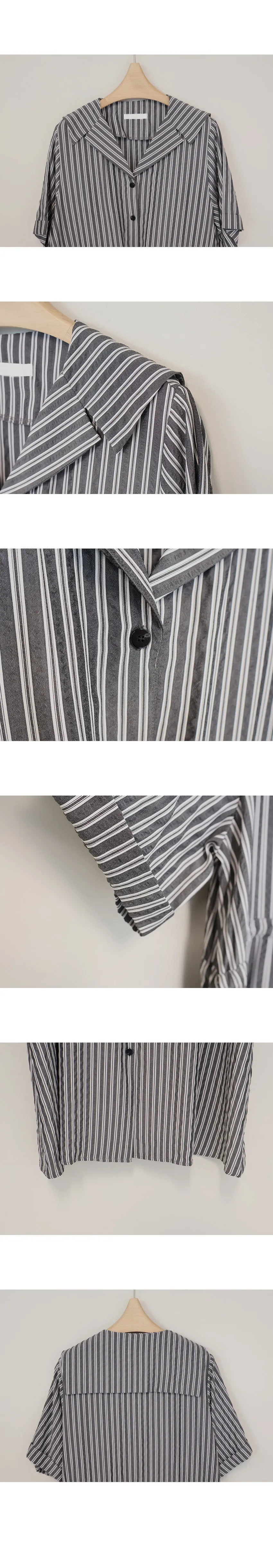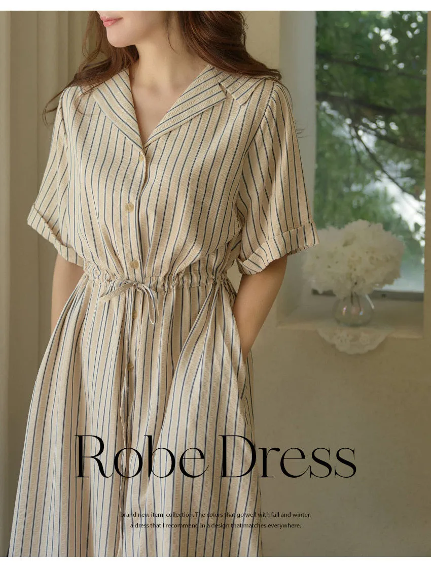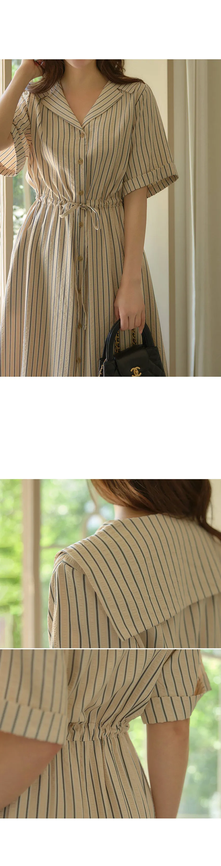 精緻情調襯衫式V領排扣腰綁帶條紋連身裙