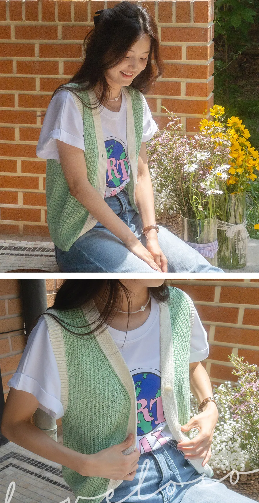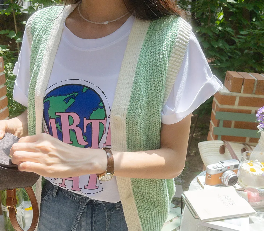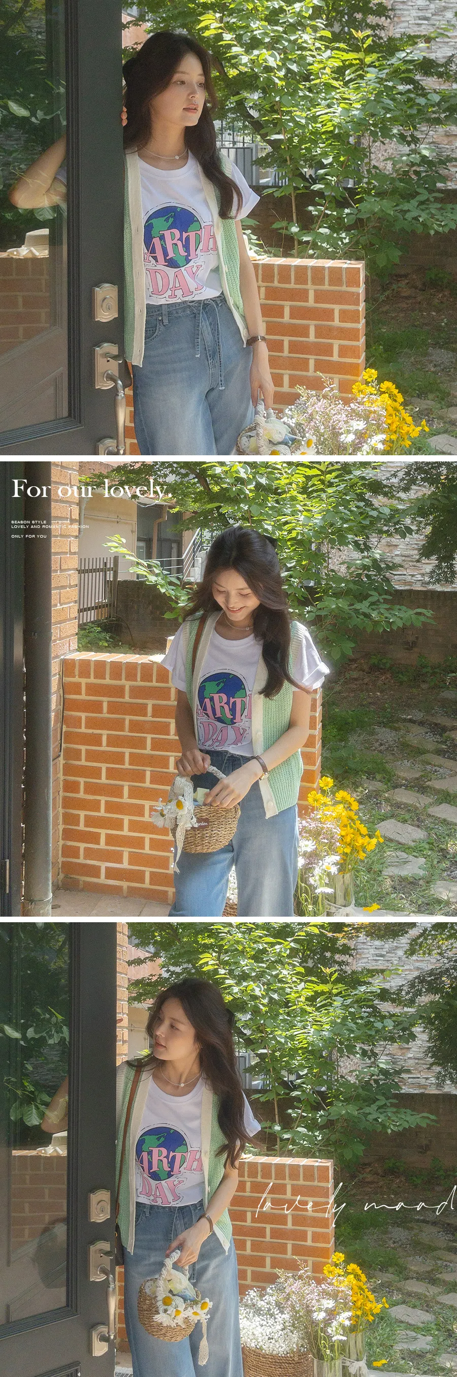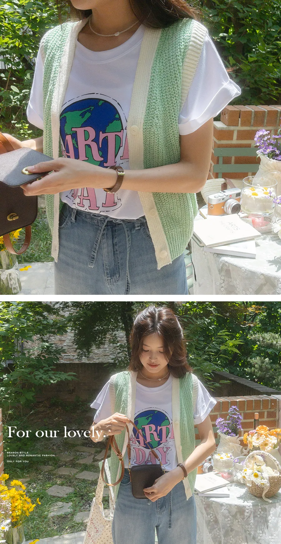 時尚氣息捲袖設計地球字母印花短袖上衣