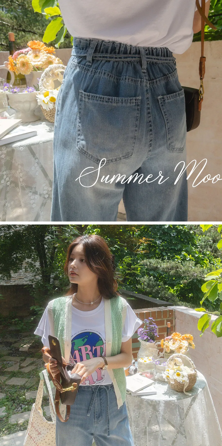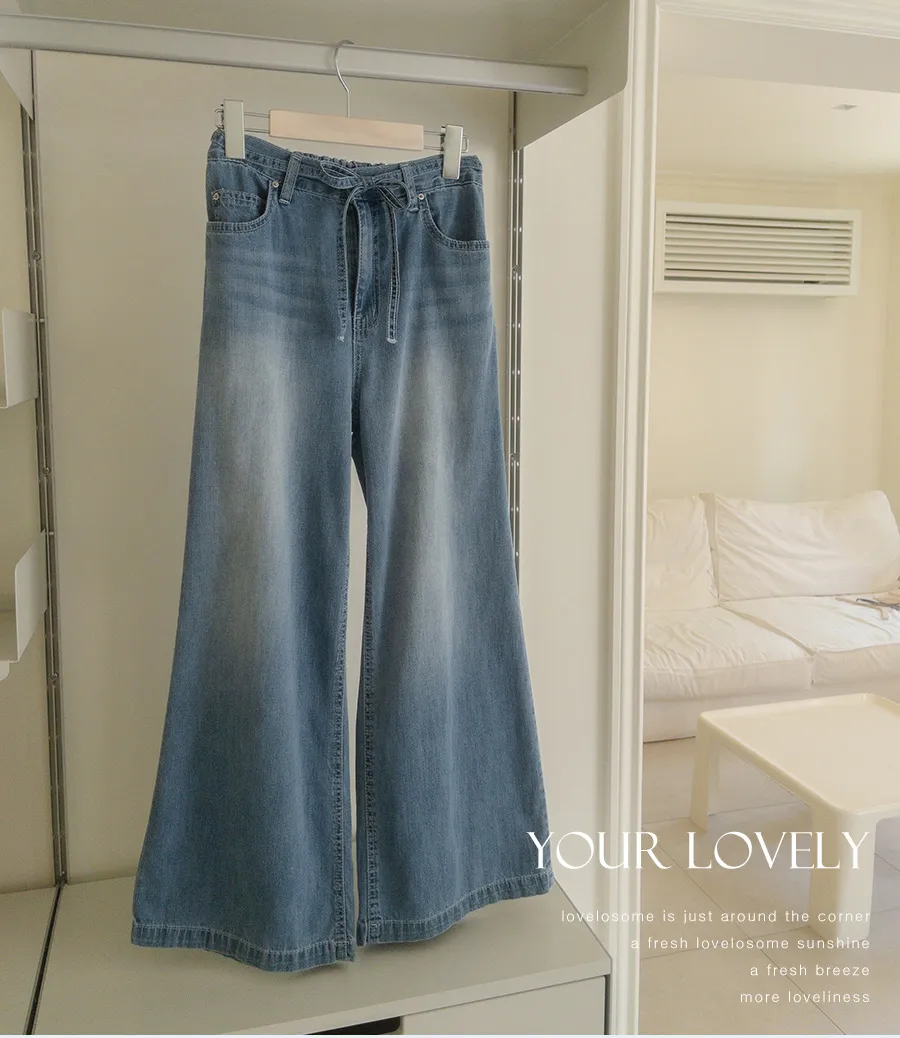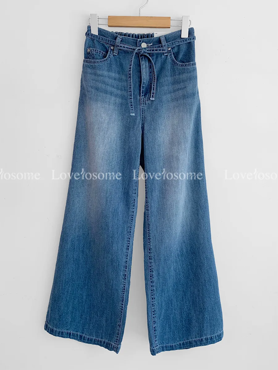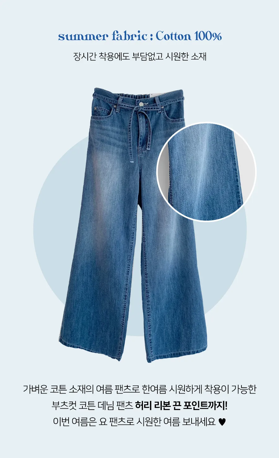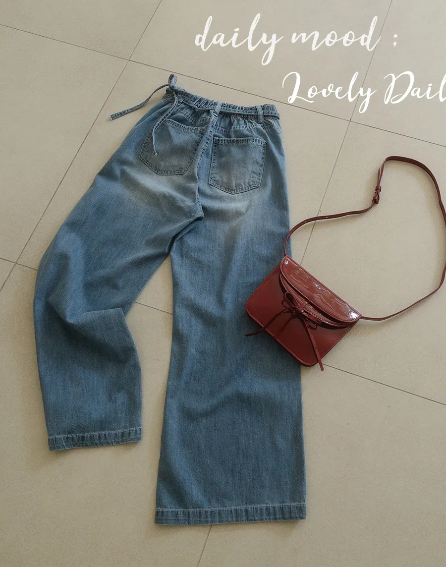【寬大舒適】【後背飾帶設計】【涼爽材質牛仔褲】【水洗細節舒適心情~】