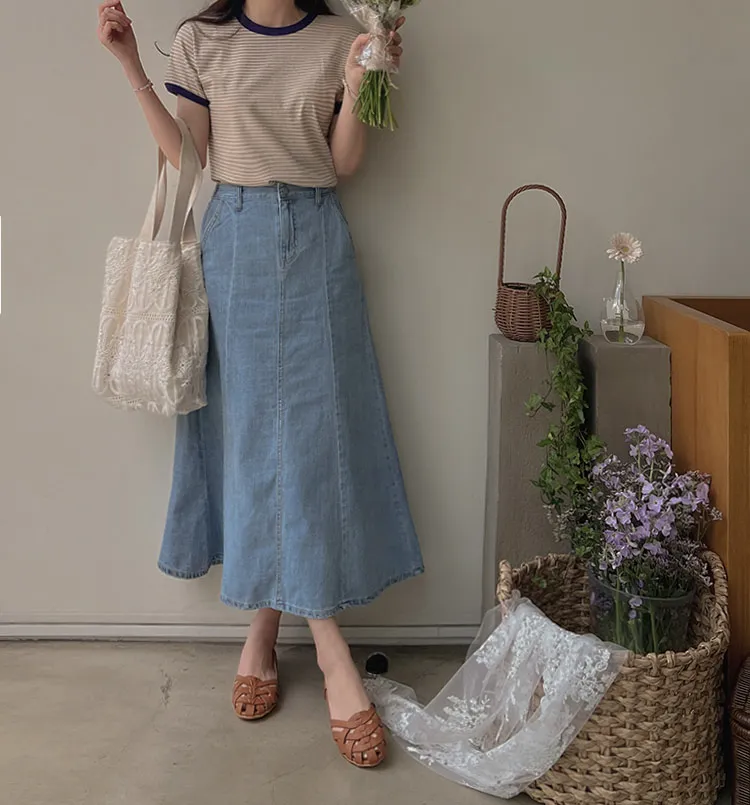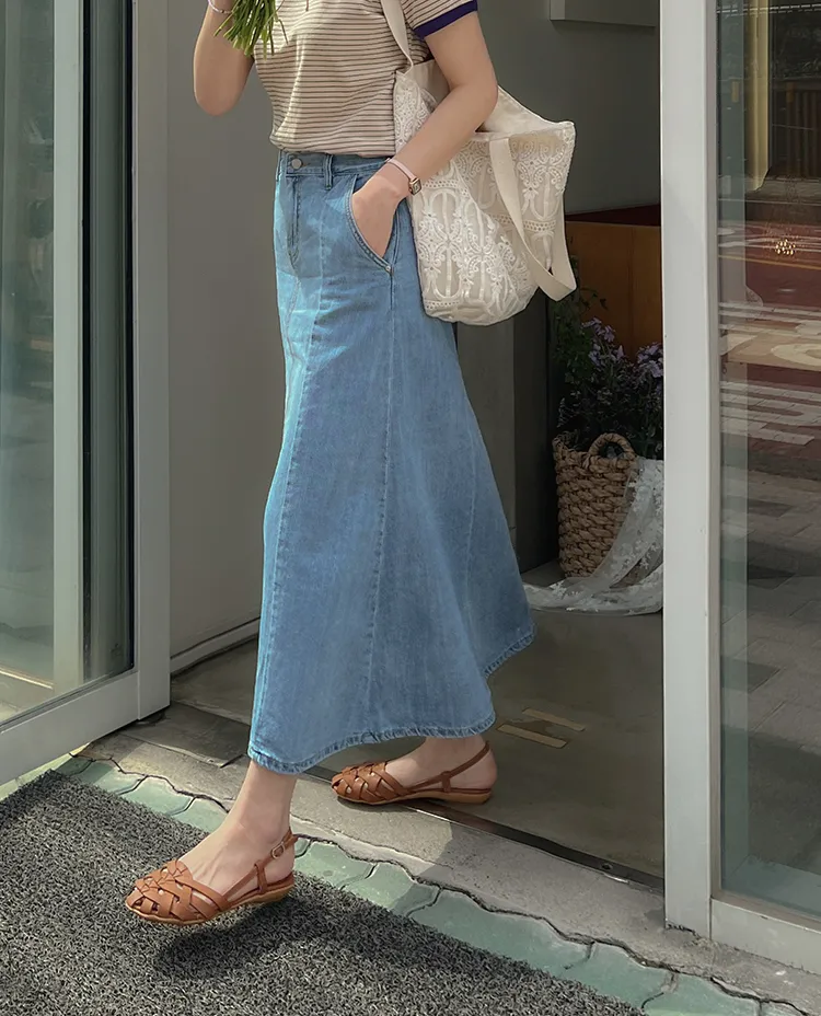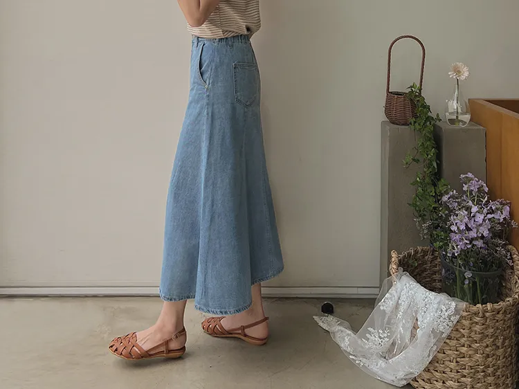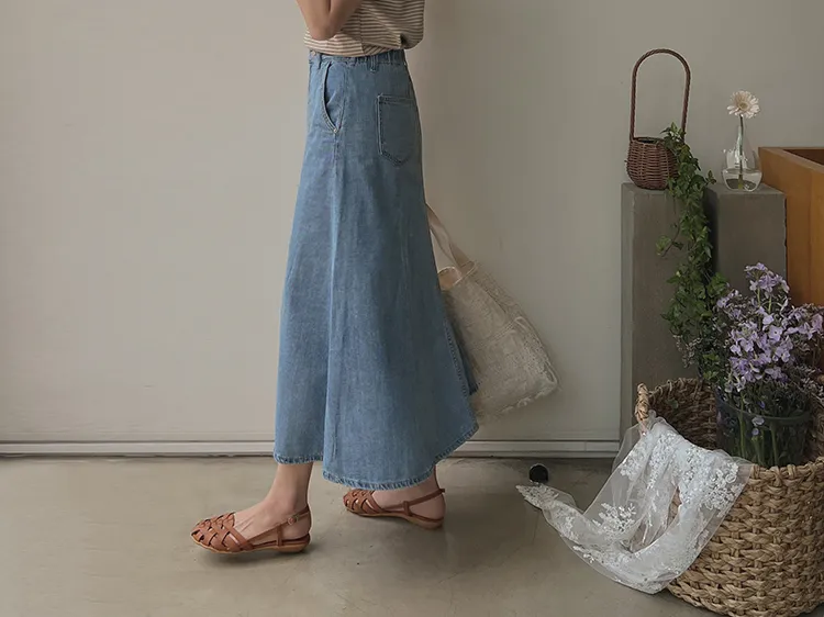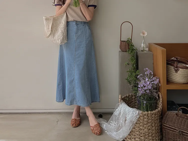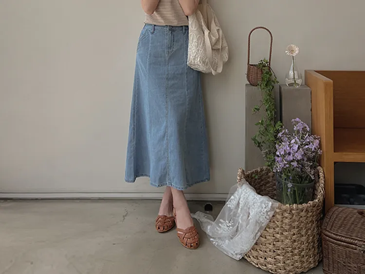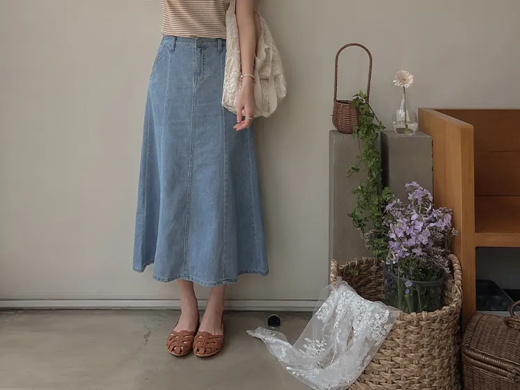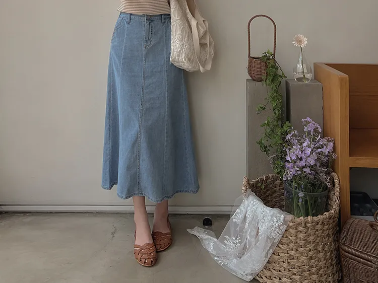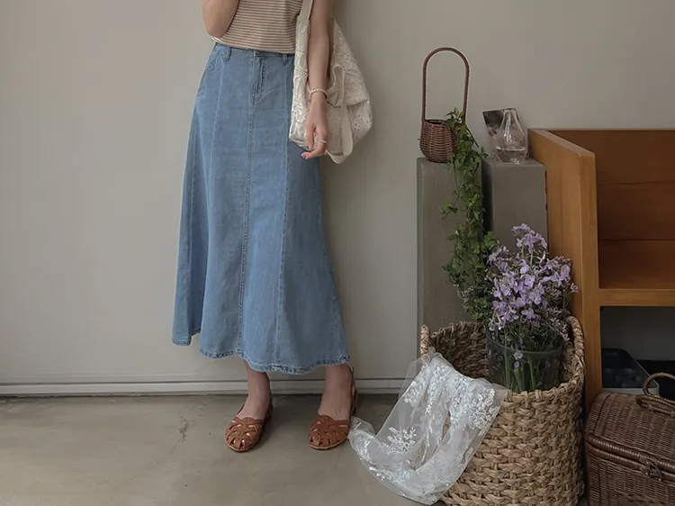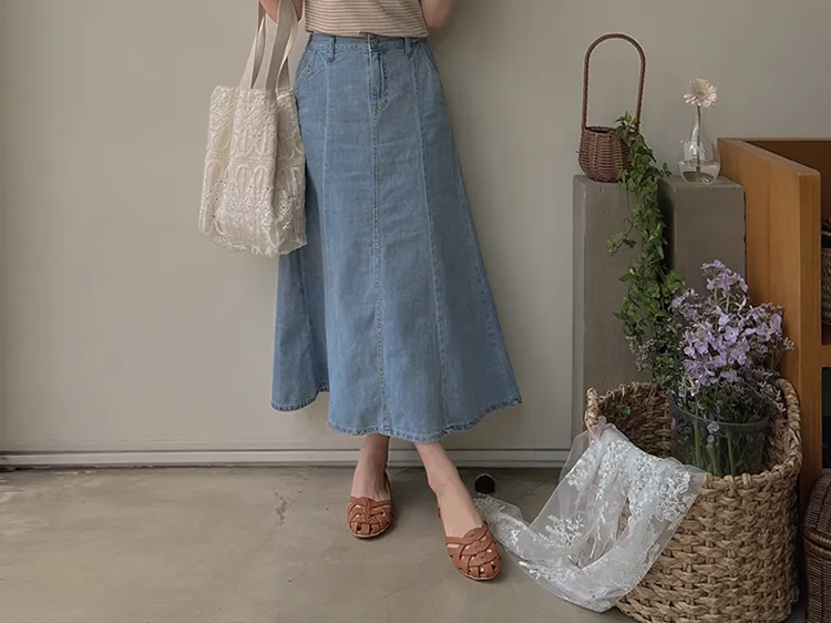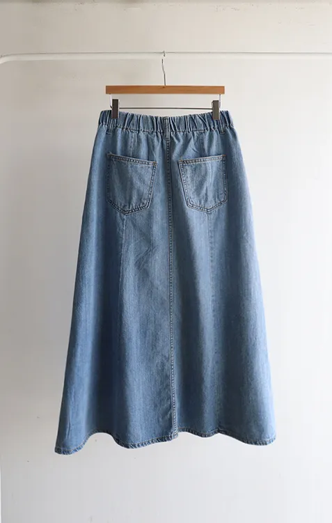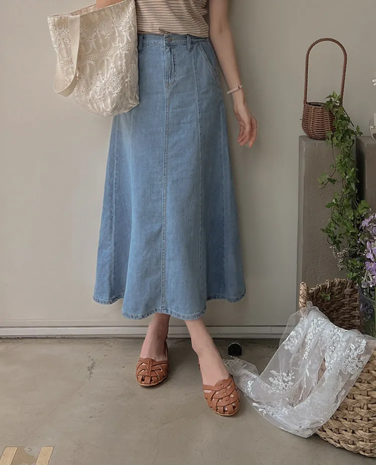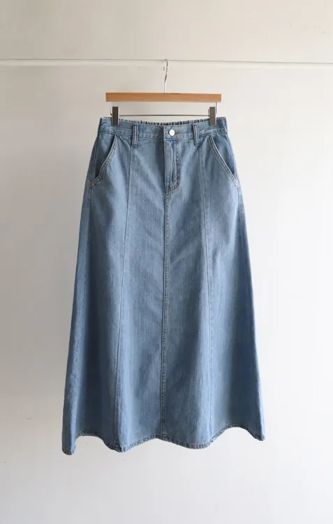【剪裁線條迷人的牛仔長牛仔裙♡】【傘擺輪廓的,充滿女人味~】【可以輕鬆搭配T卹、襯衫等各種上衣】【柔和中藍色】