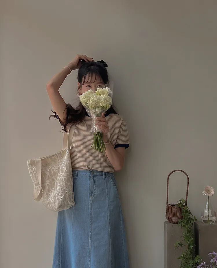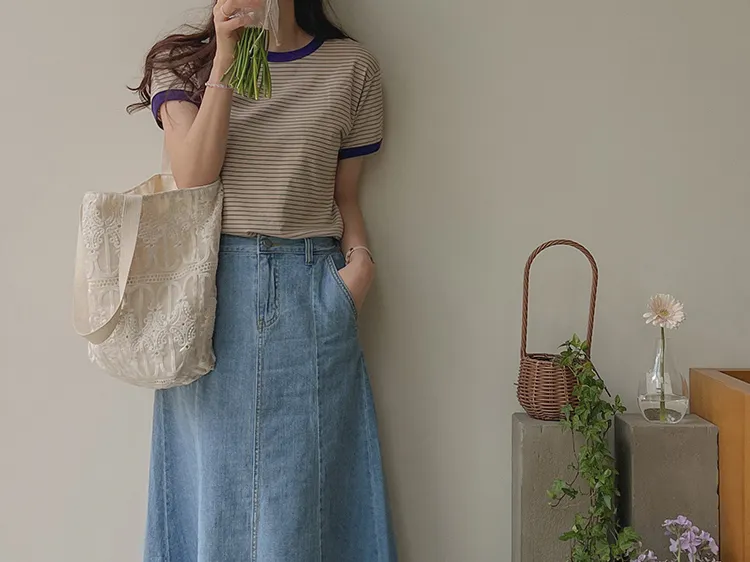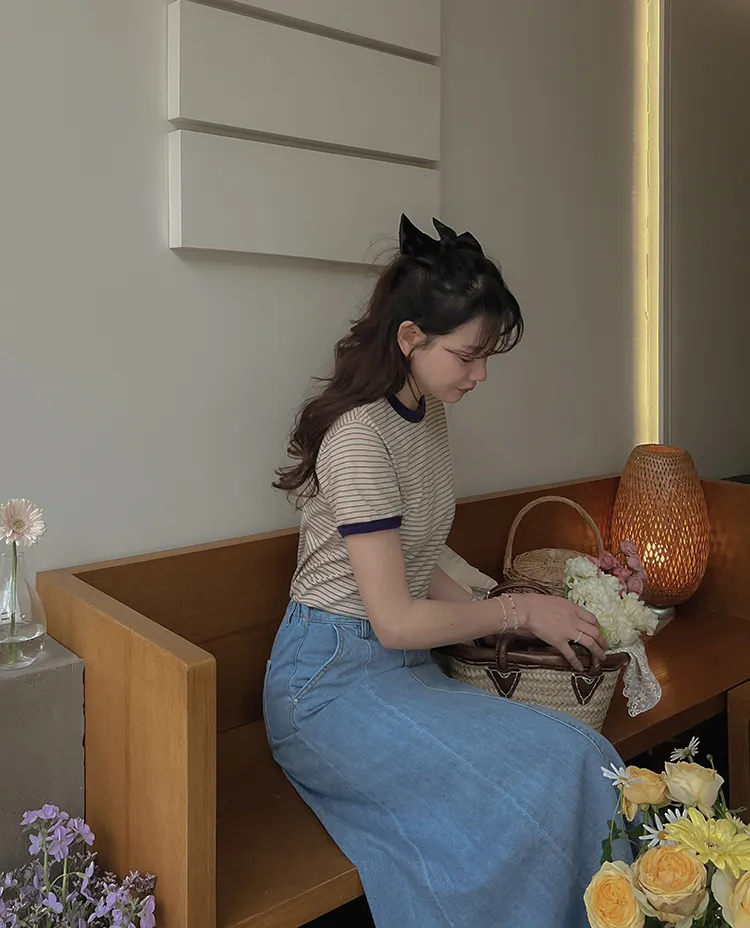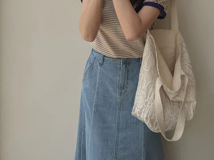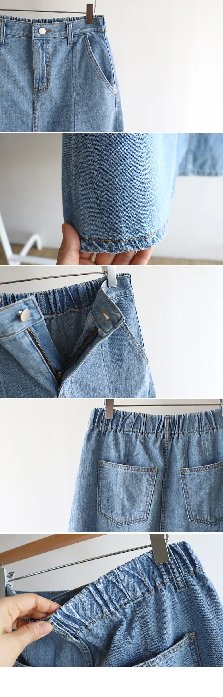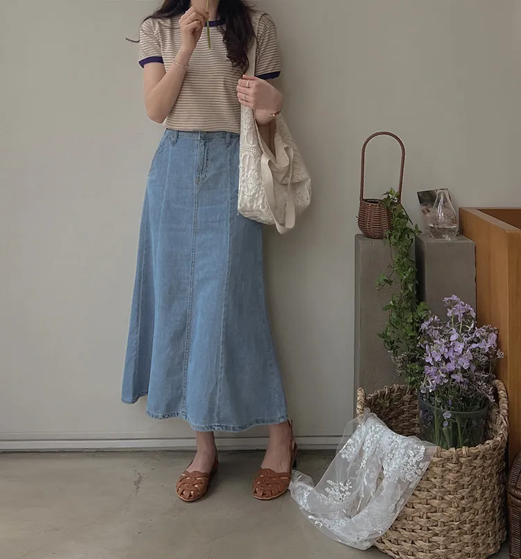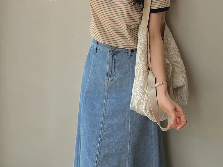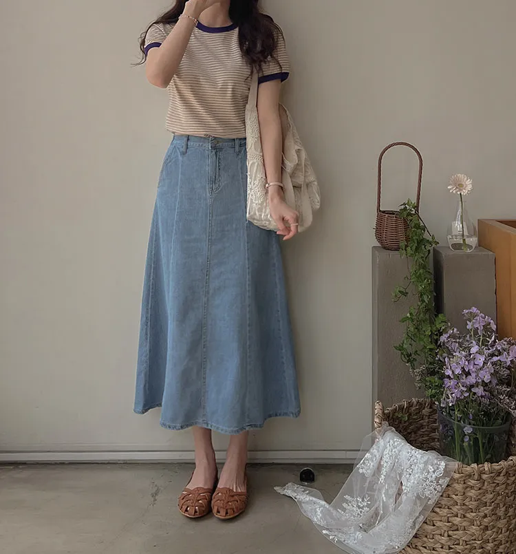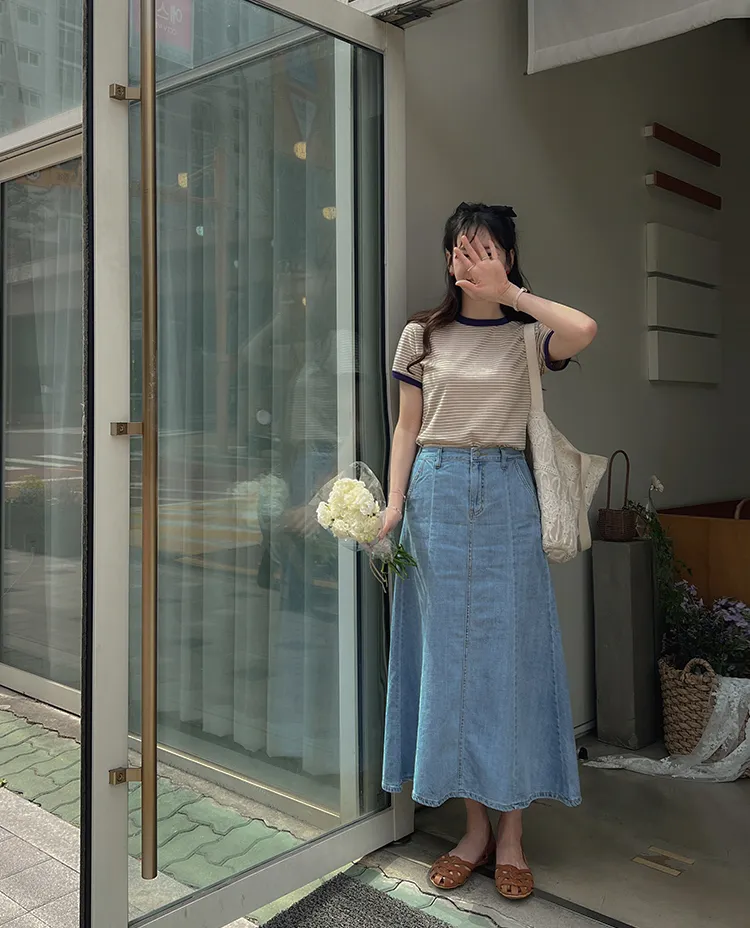 【剪裁線條迷人的牛仔長牛仔裙♡】【傘擺輪廓的,充滿女人味~】【可以輕鬆搭配T卹、襯衫等各種上衣】【柔和中藍色】