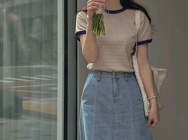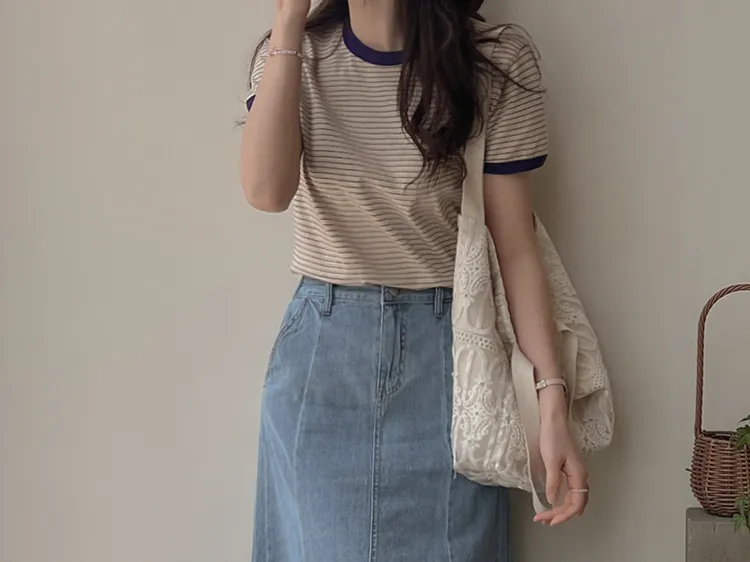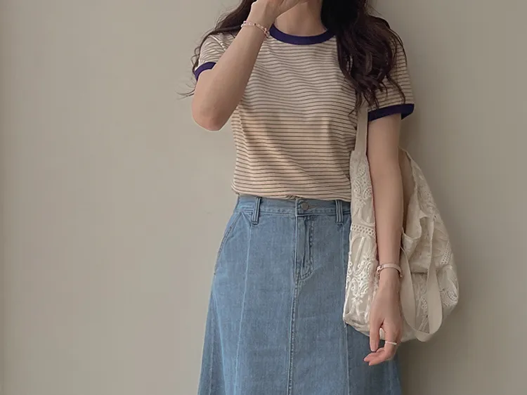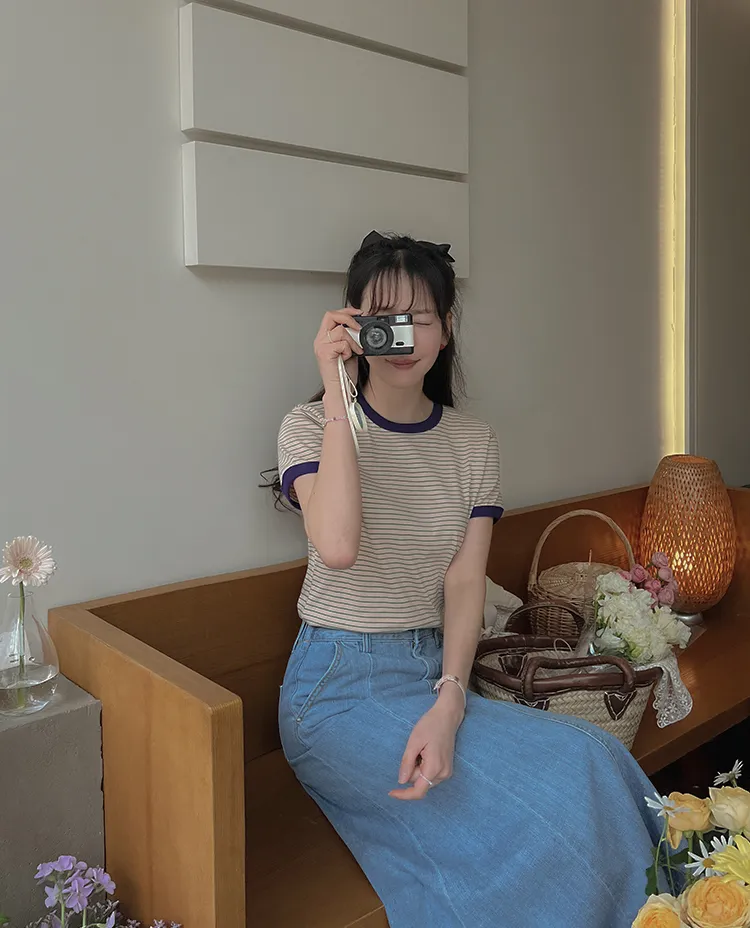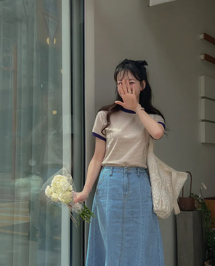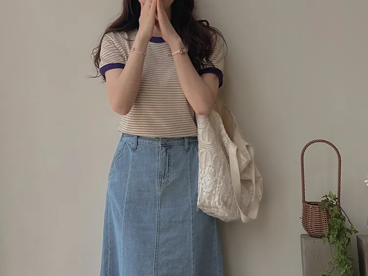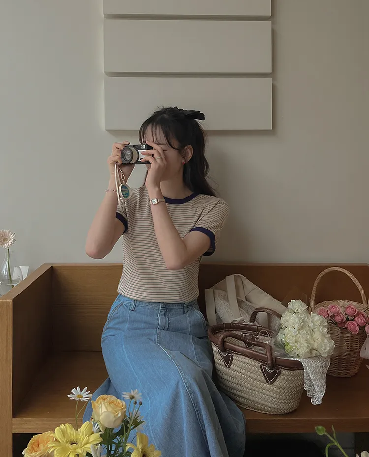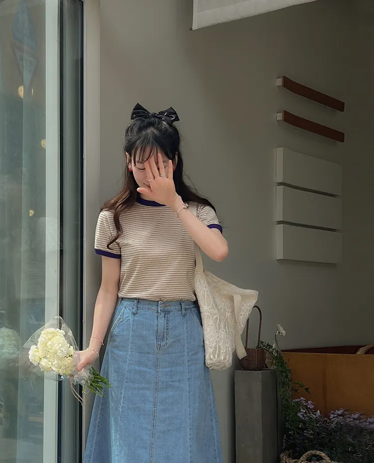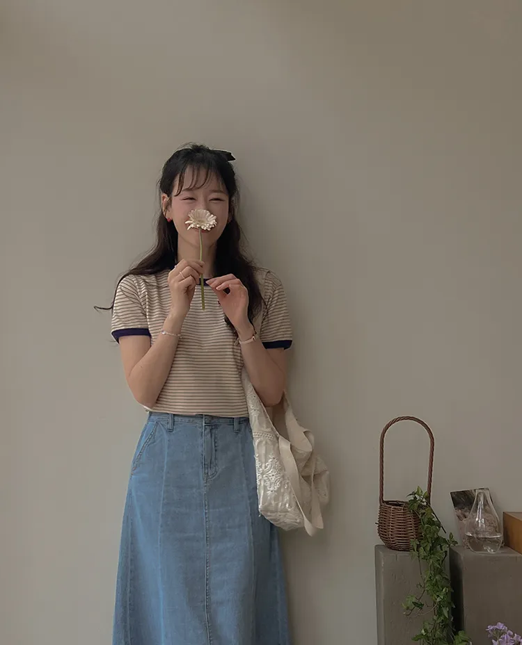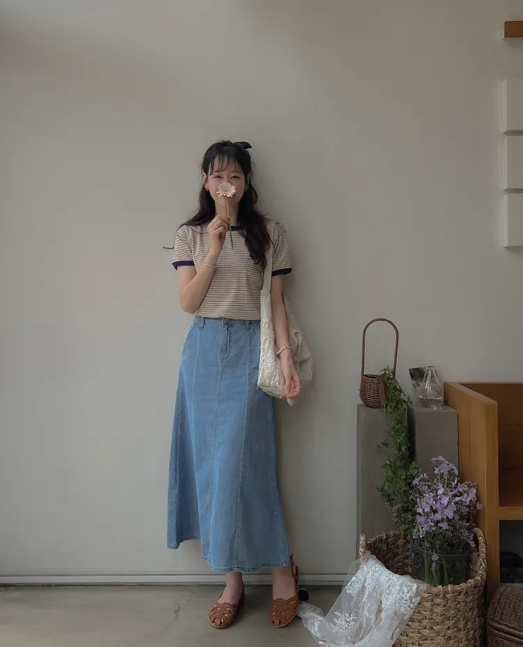 【剪裁線條迷人的牛仔長牛仔裙♡】【傘擺輪廓的,充滿女人味~】【可以輕鬆搭配T卹、襯衫等各種上衣】【柔和中藍色】