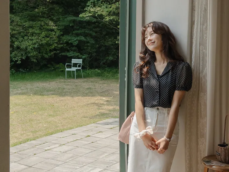 浪漫肩線抽褶雪紡排扣上衣 點點款/花朵款