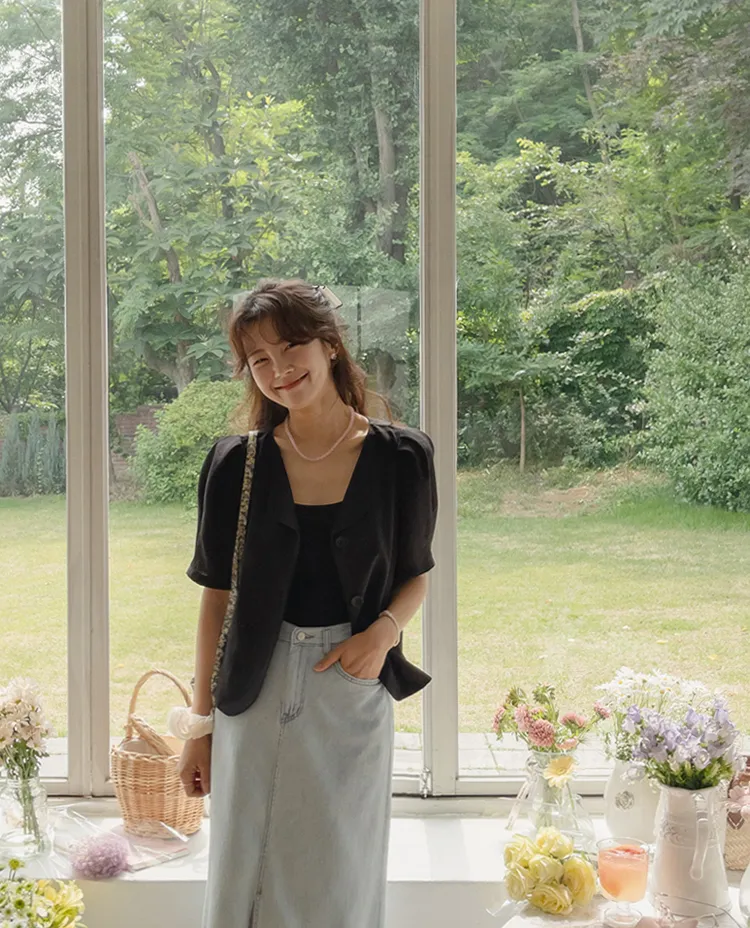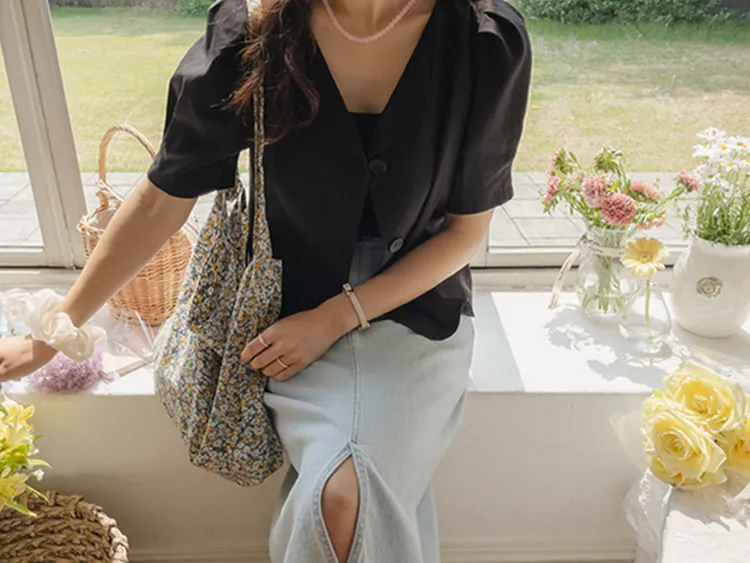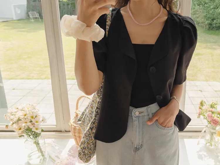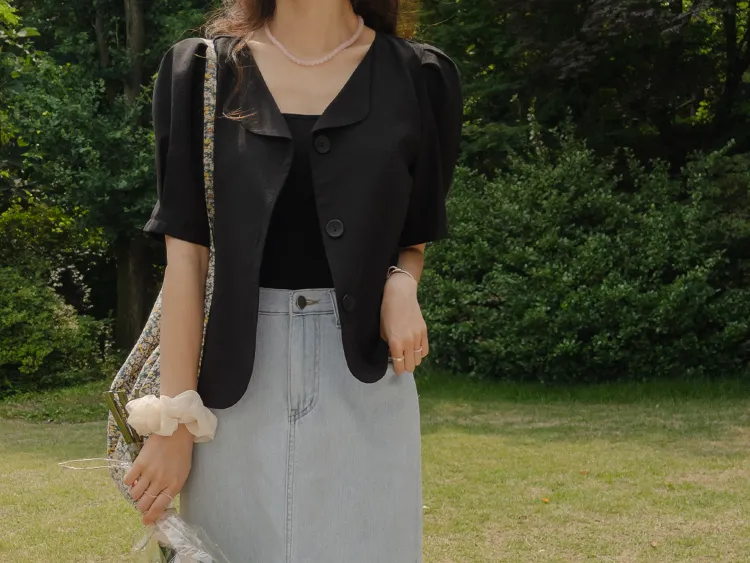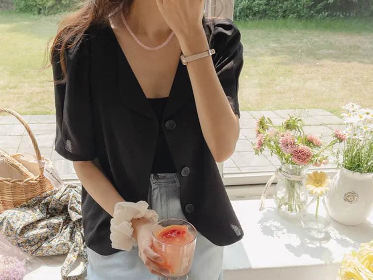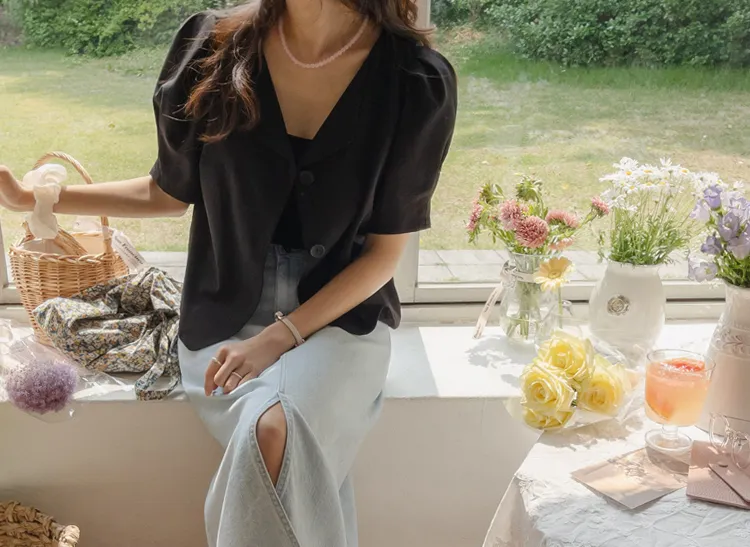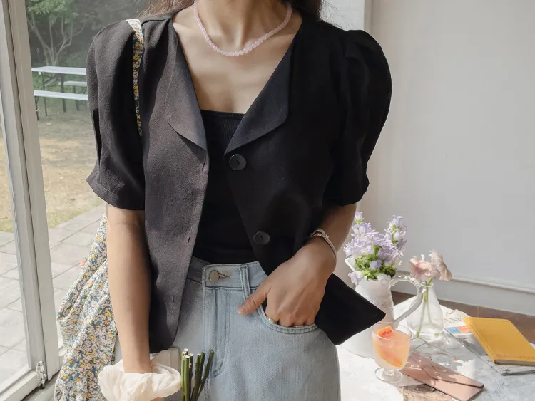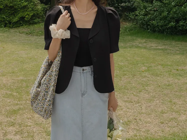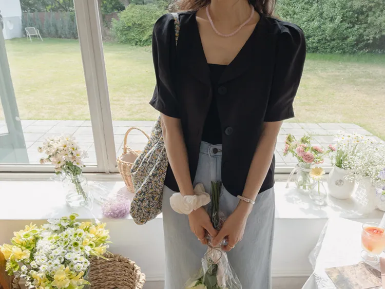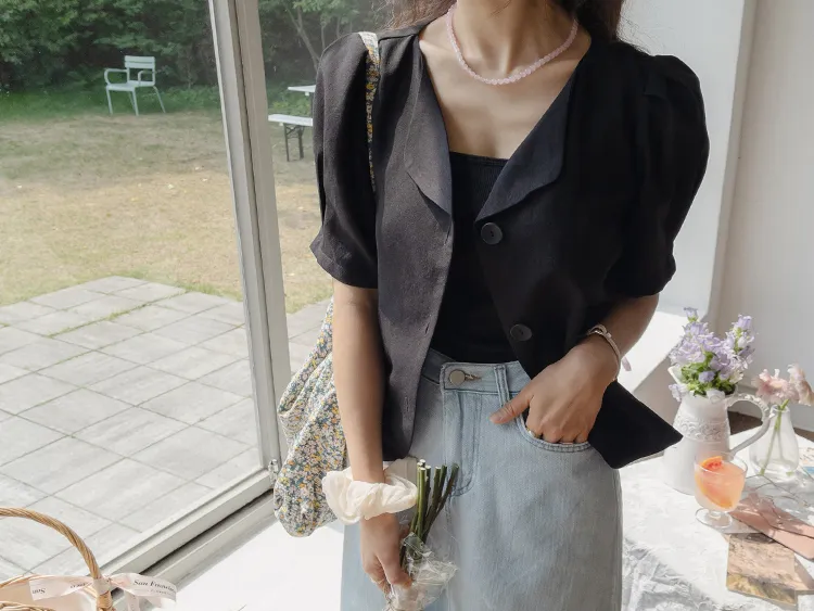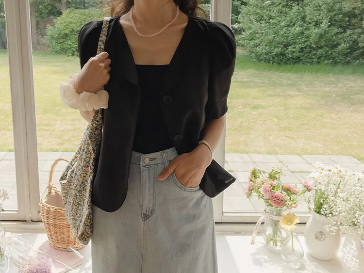 可愛優雅蓬鬆線條肩袖剪裁排扣外套上衣