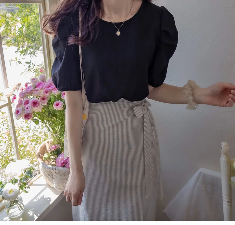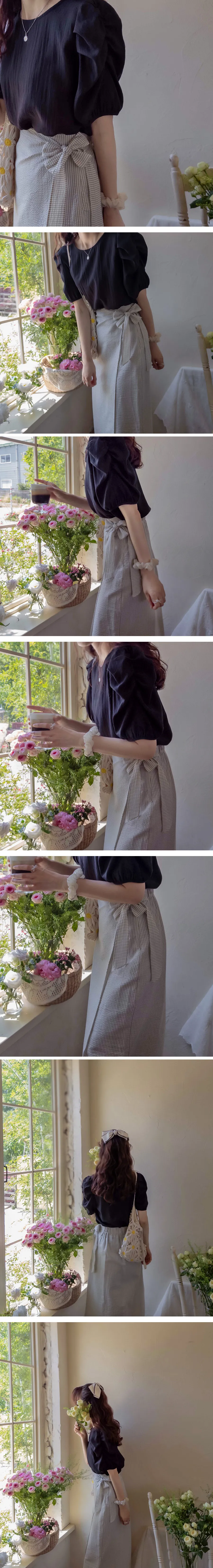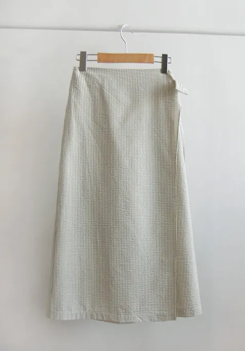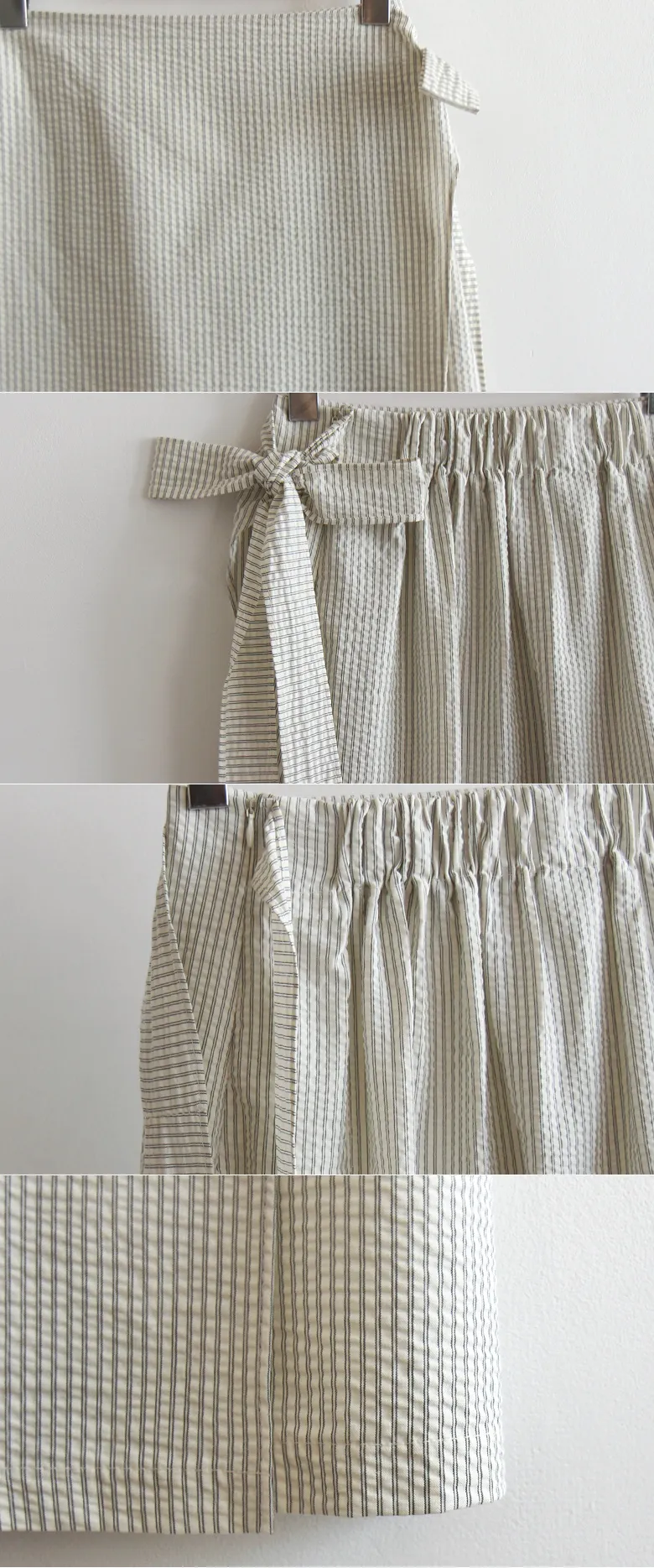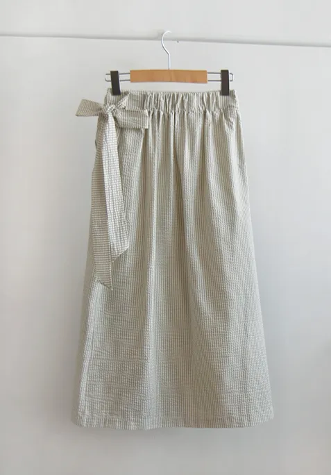 [腰部後帶處理][側拉鍊配置][側帶繫起來很漂亮][條紋圖案的夏季設計][夏季面料由泡泡紗面料製成][裹身式但封閉式設計] [適合邊緣合身,時尚穿著][強烈推薦作為協調良好的時尚裙子]
