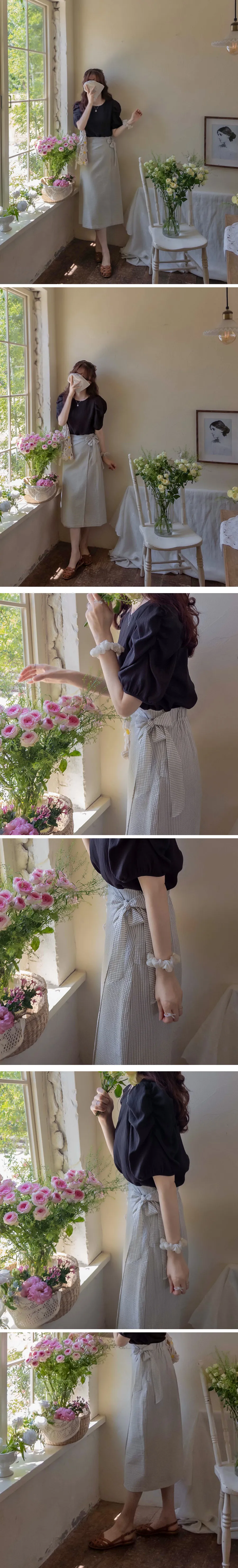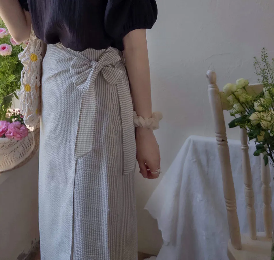 漂亮側綁帶裹身泡泡紗條紋中長裙