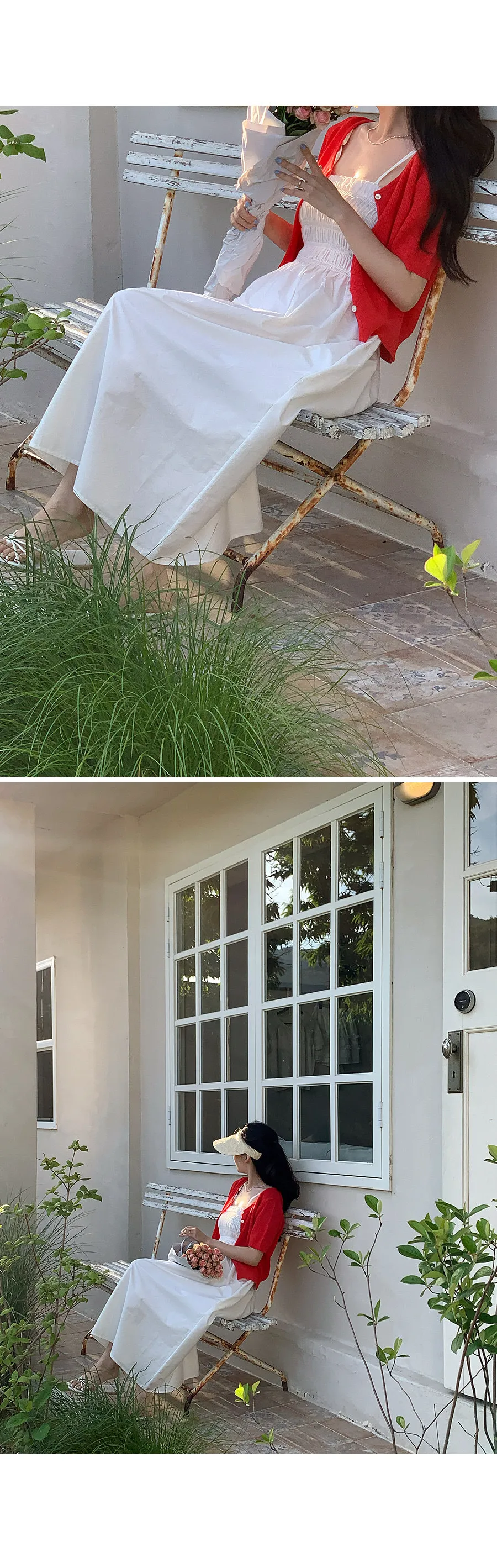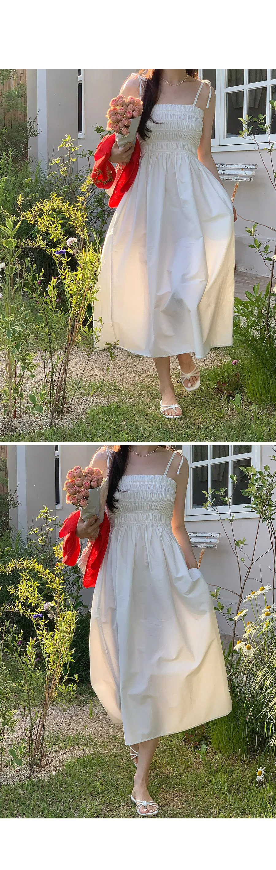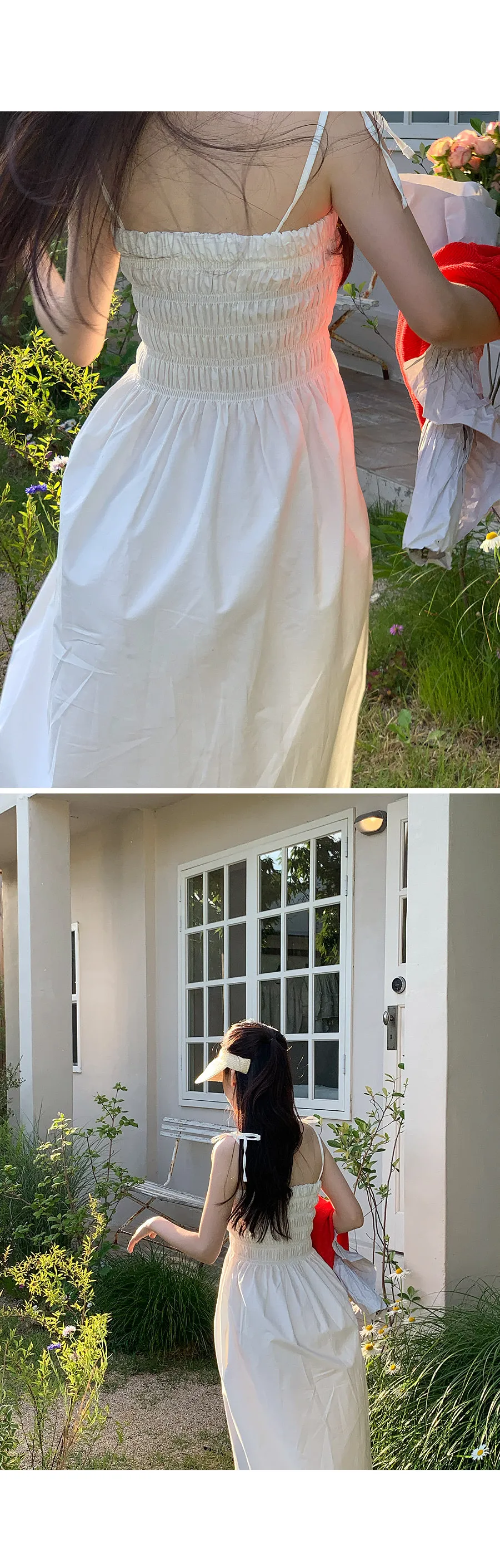 渡假風皺摺修身肩飾綁帶傘擺裙擺連身裙