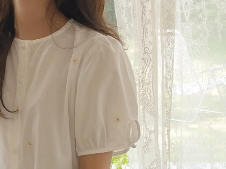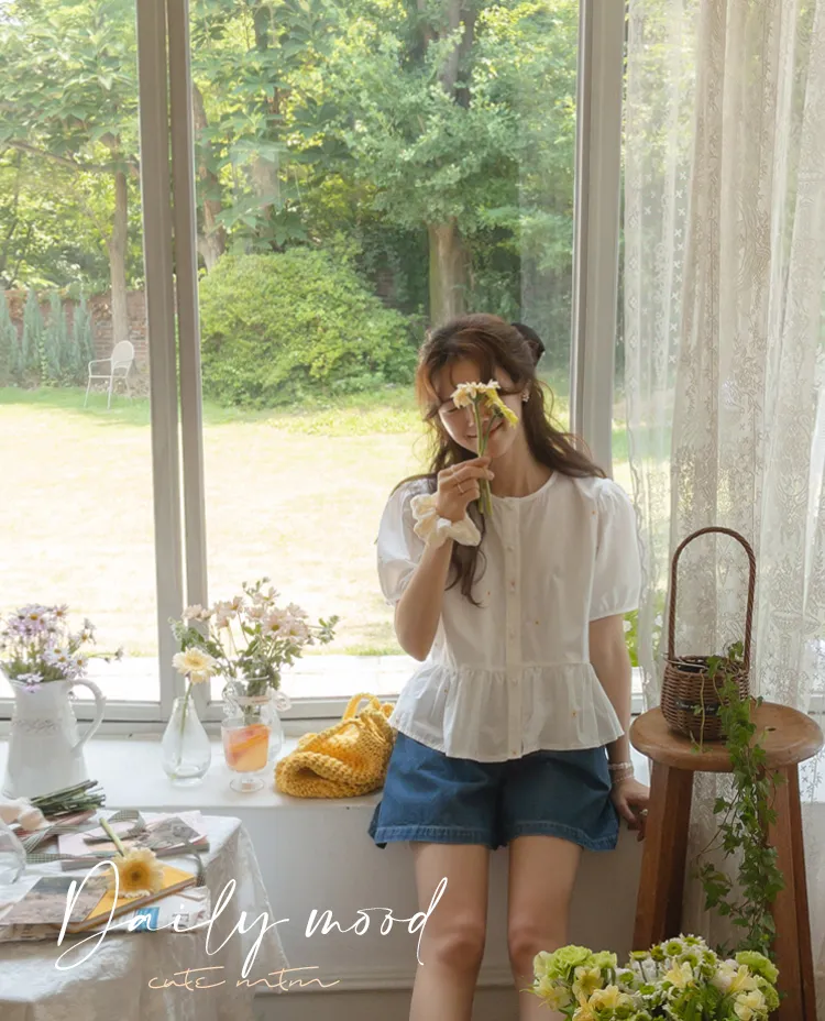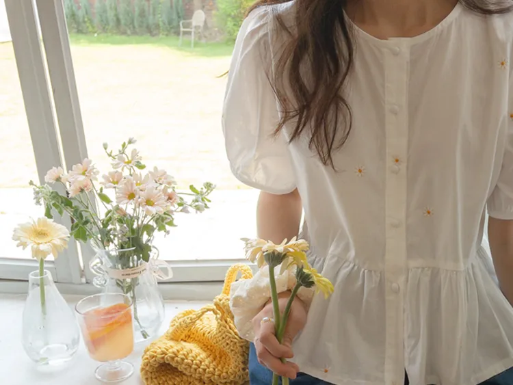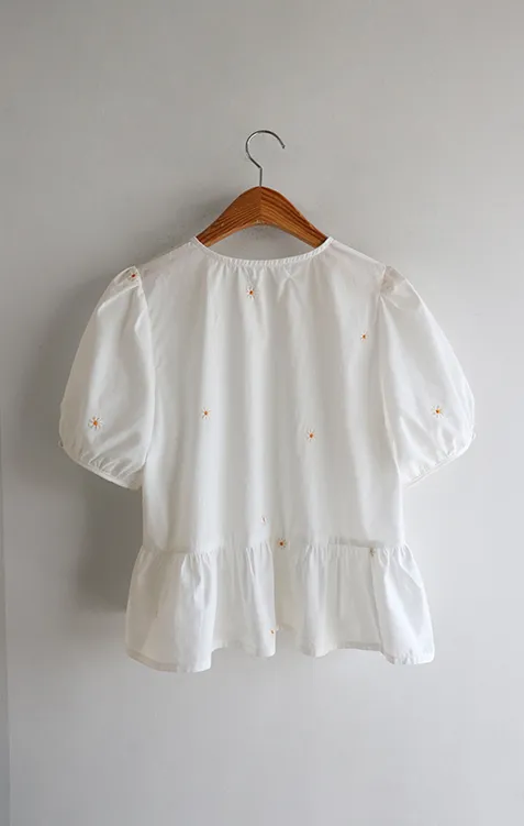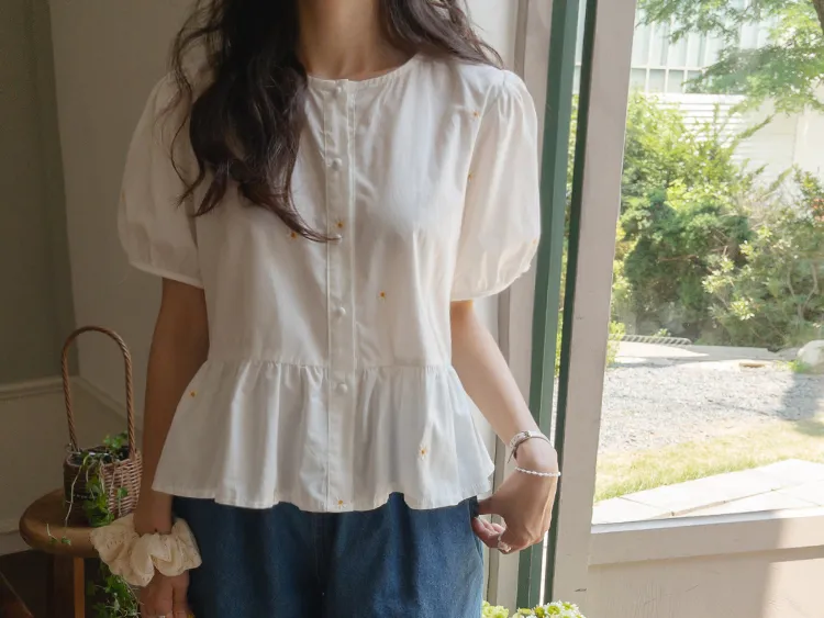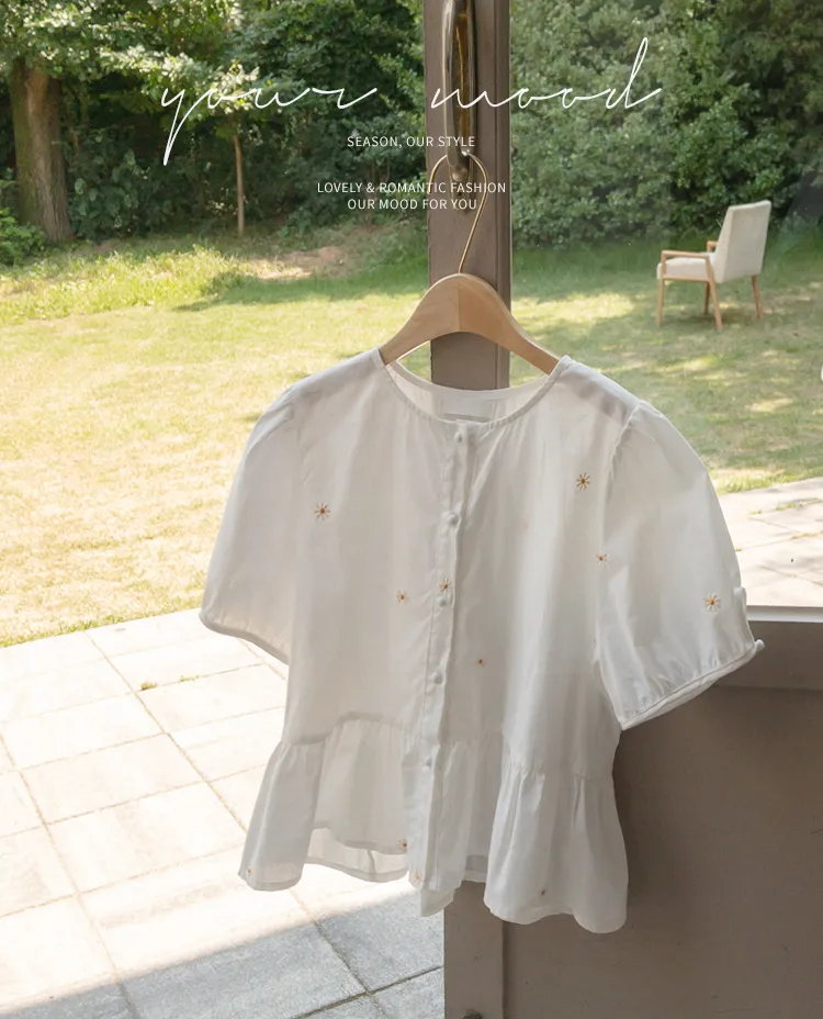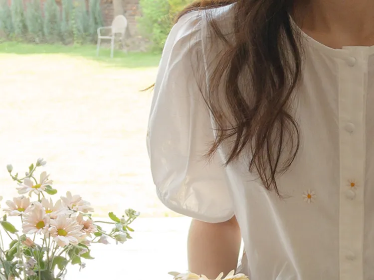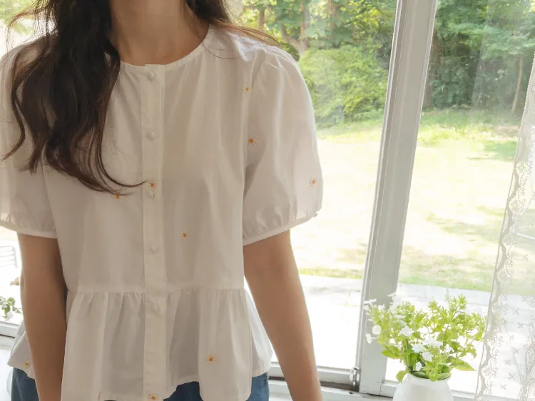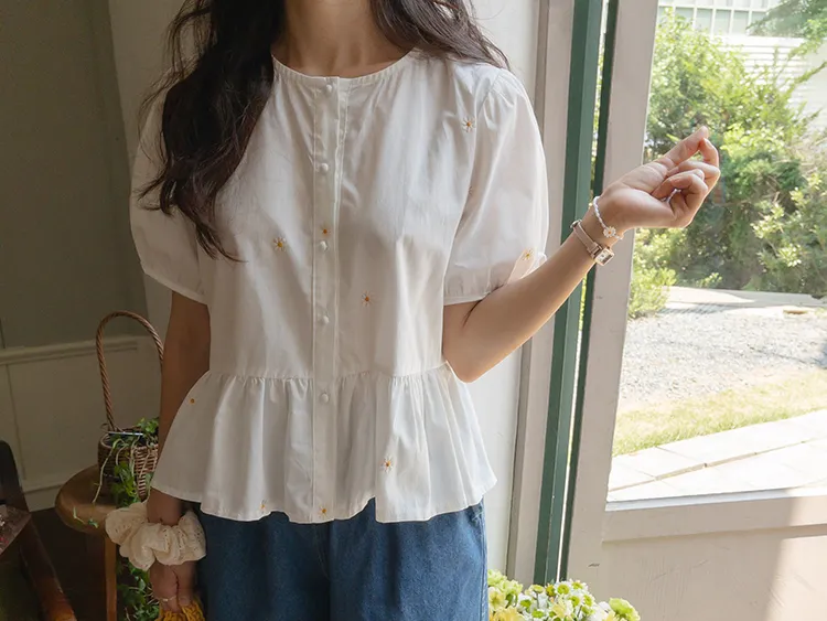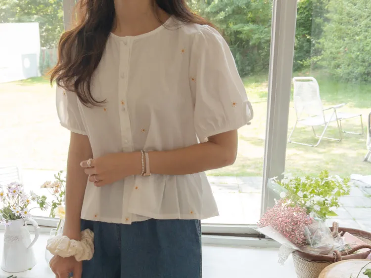 明亮純淨花朵刺繡圓泡泡袖排扣上衣
