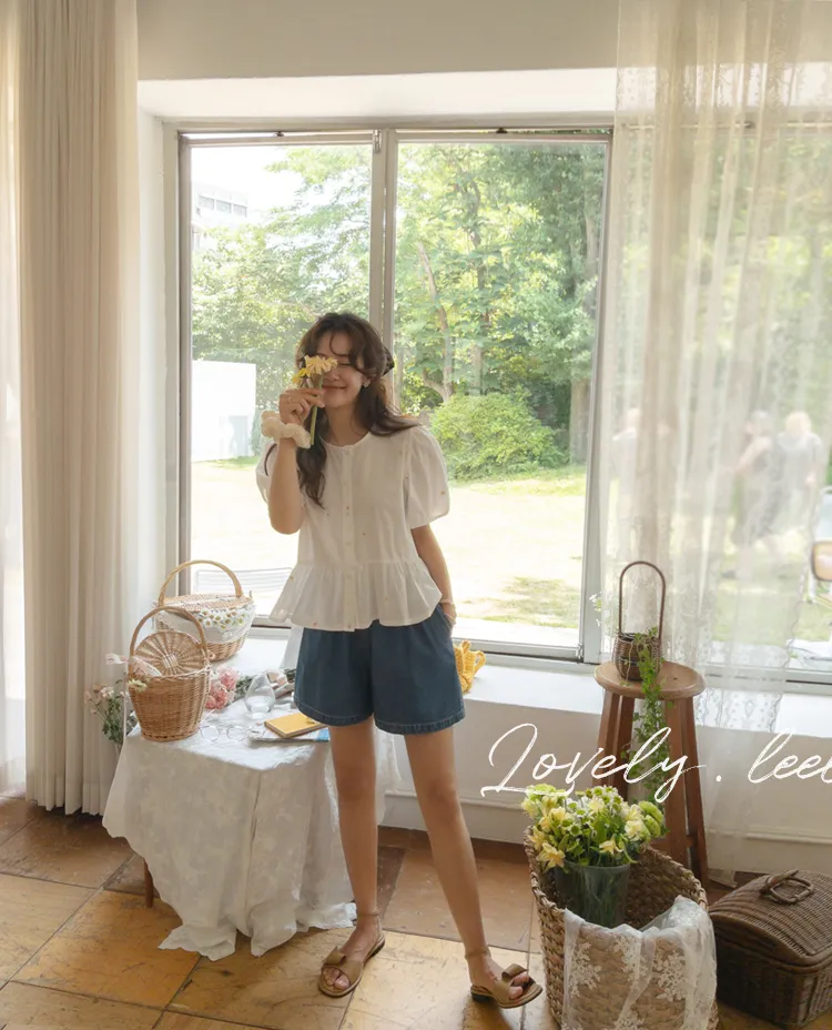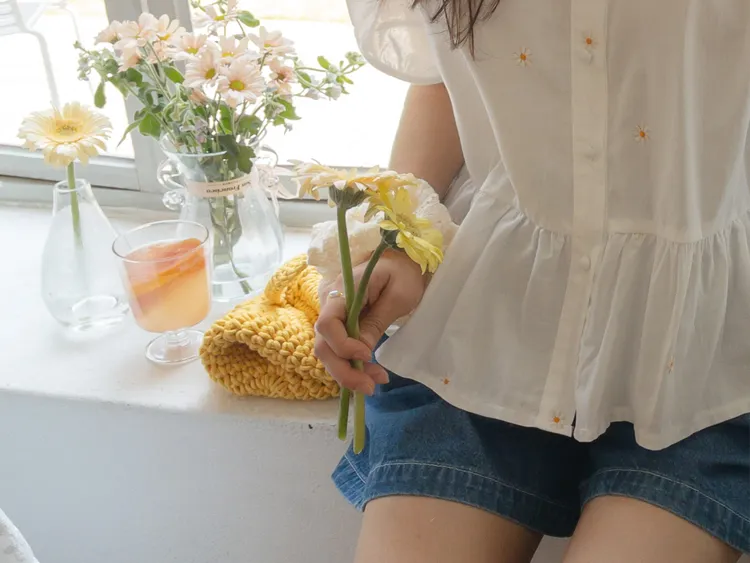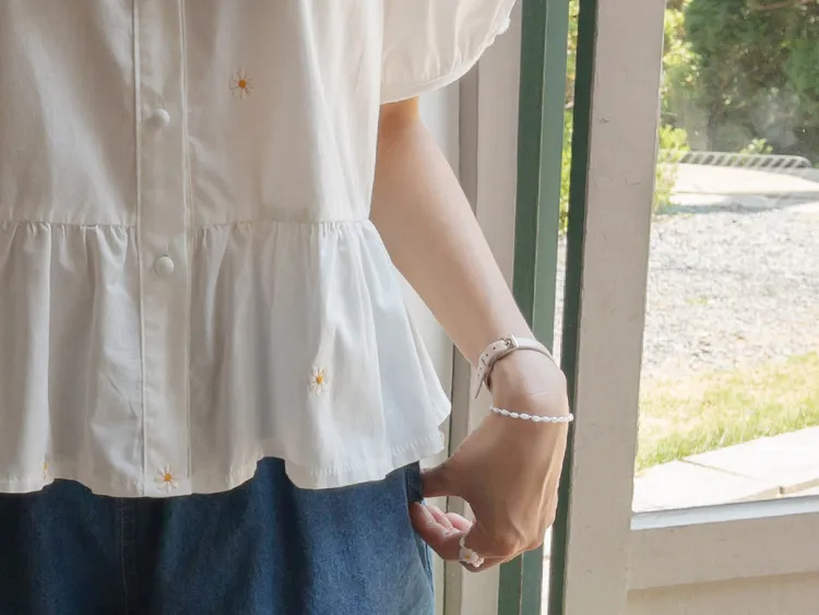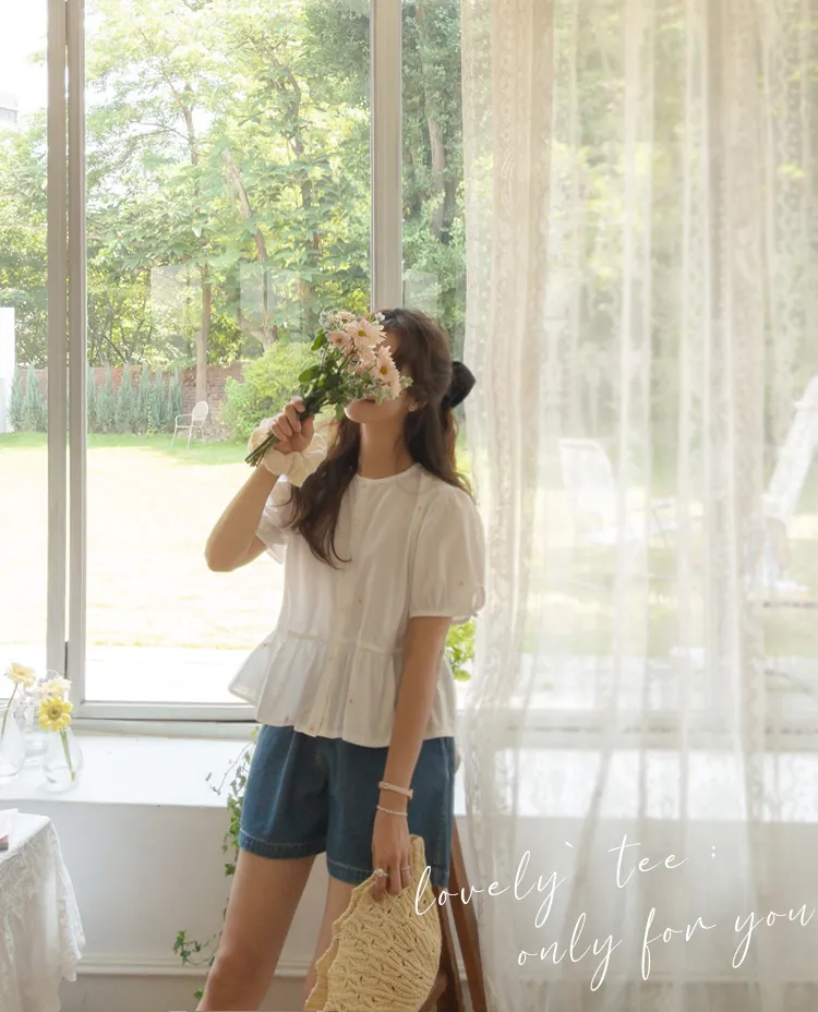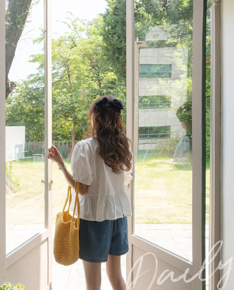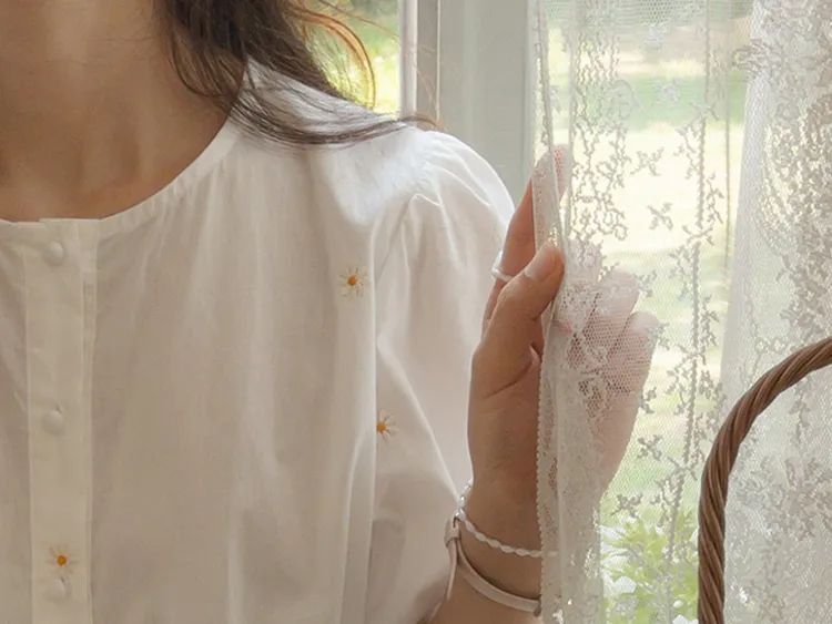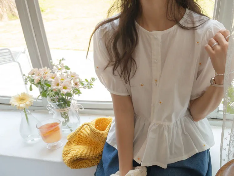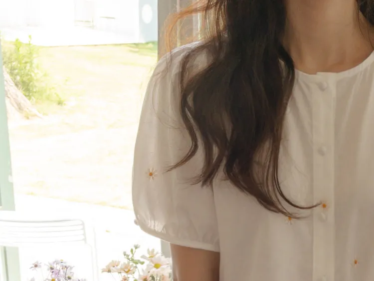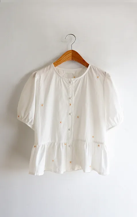 明亮純淨花朵刺繡圓泡泡袖排扣上衣