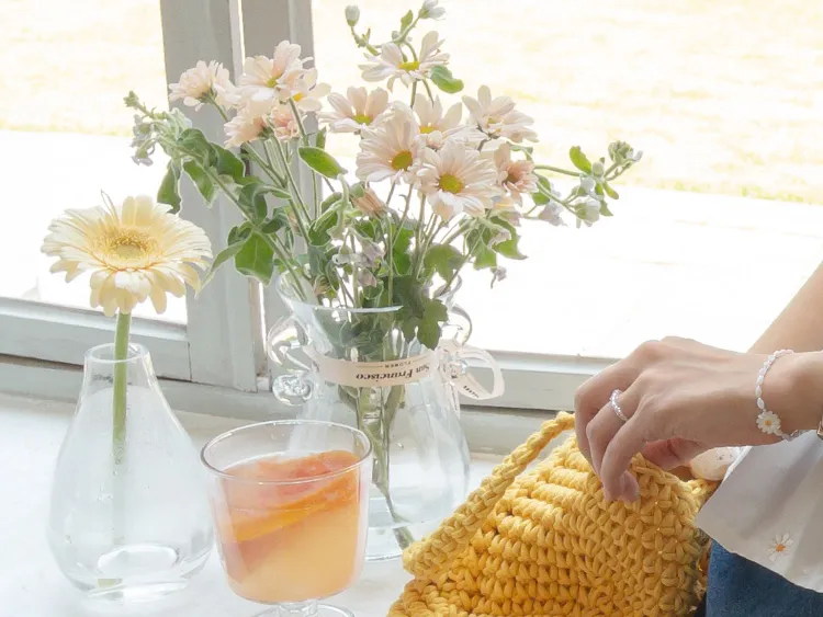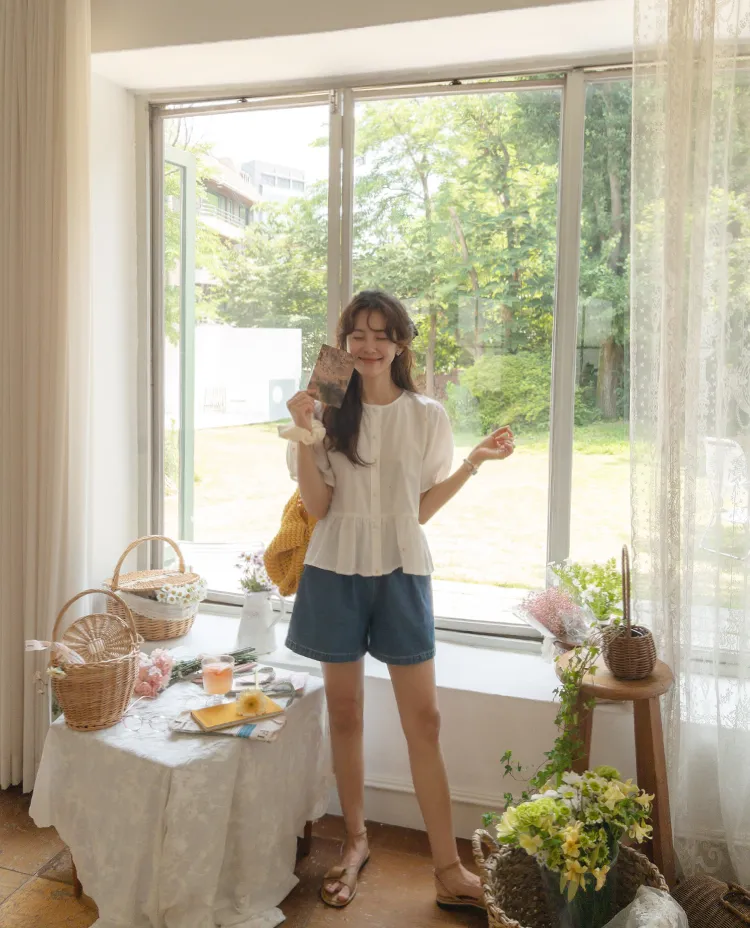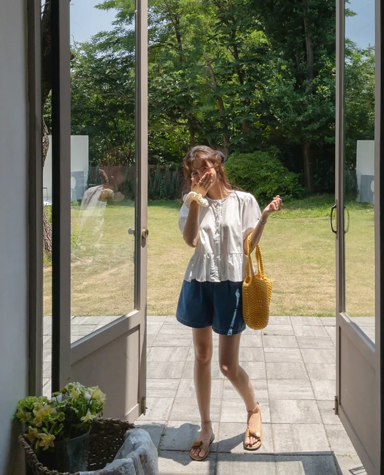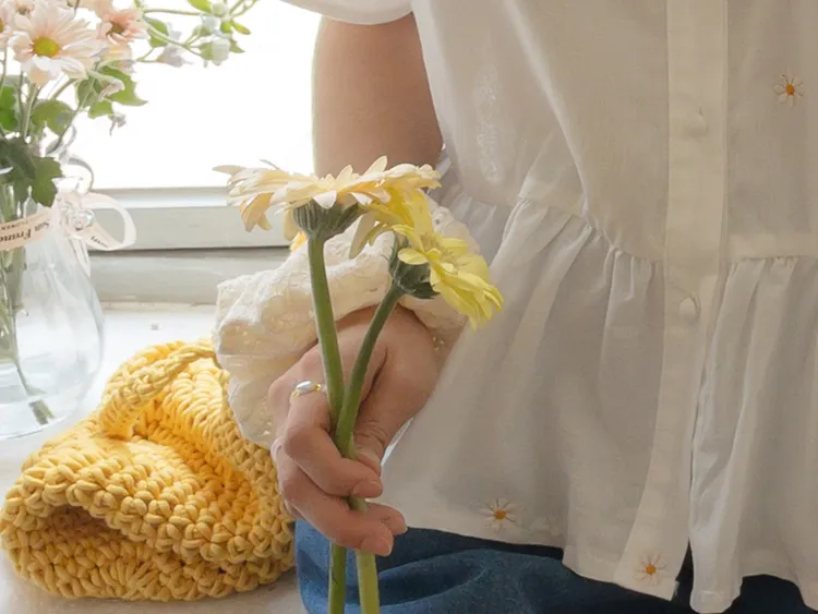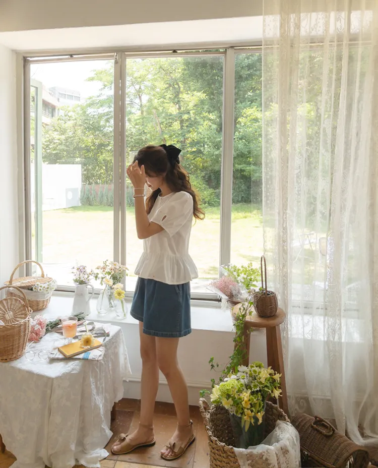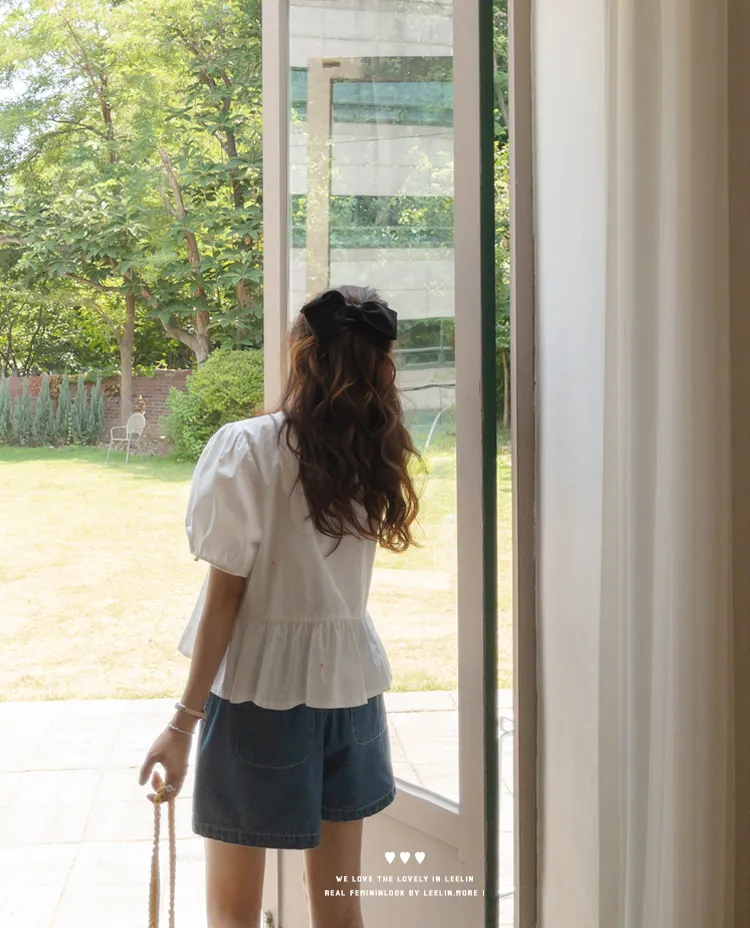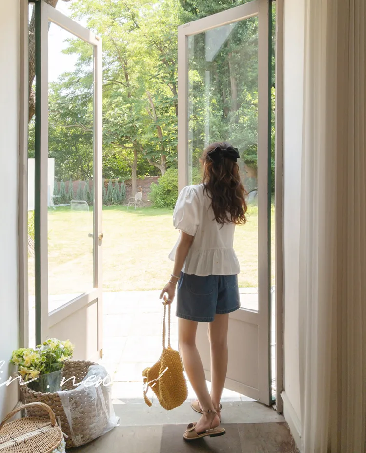 明亮純淨花朵刺繡圓泡泡袖排扣上衣